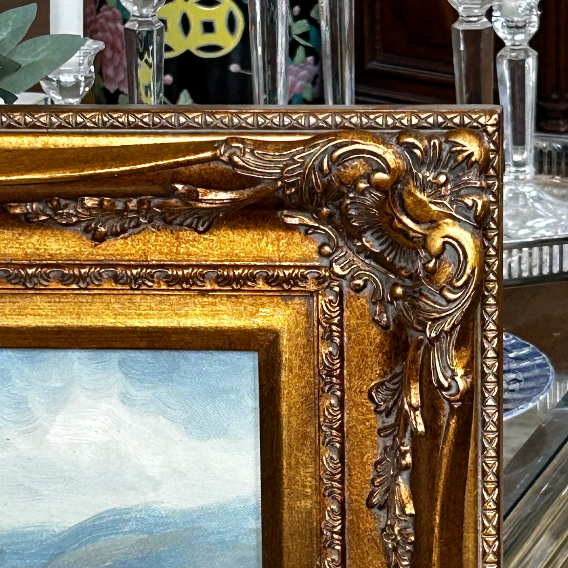 This stunning and lifelike landscape oil painting features vibrant botanicals and is elegantly framed in gold baroque. It is hand-signed by the artist and measures 31 x 28 inches overall, with a canvas size of 24 x 20 inches. The warm colors and waterfront setting make for a captivating addition to any space.
