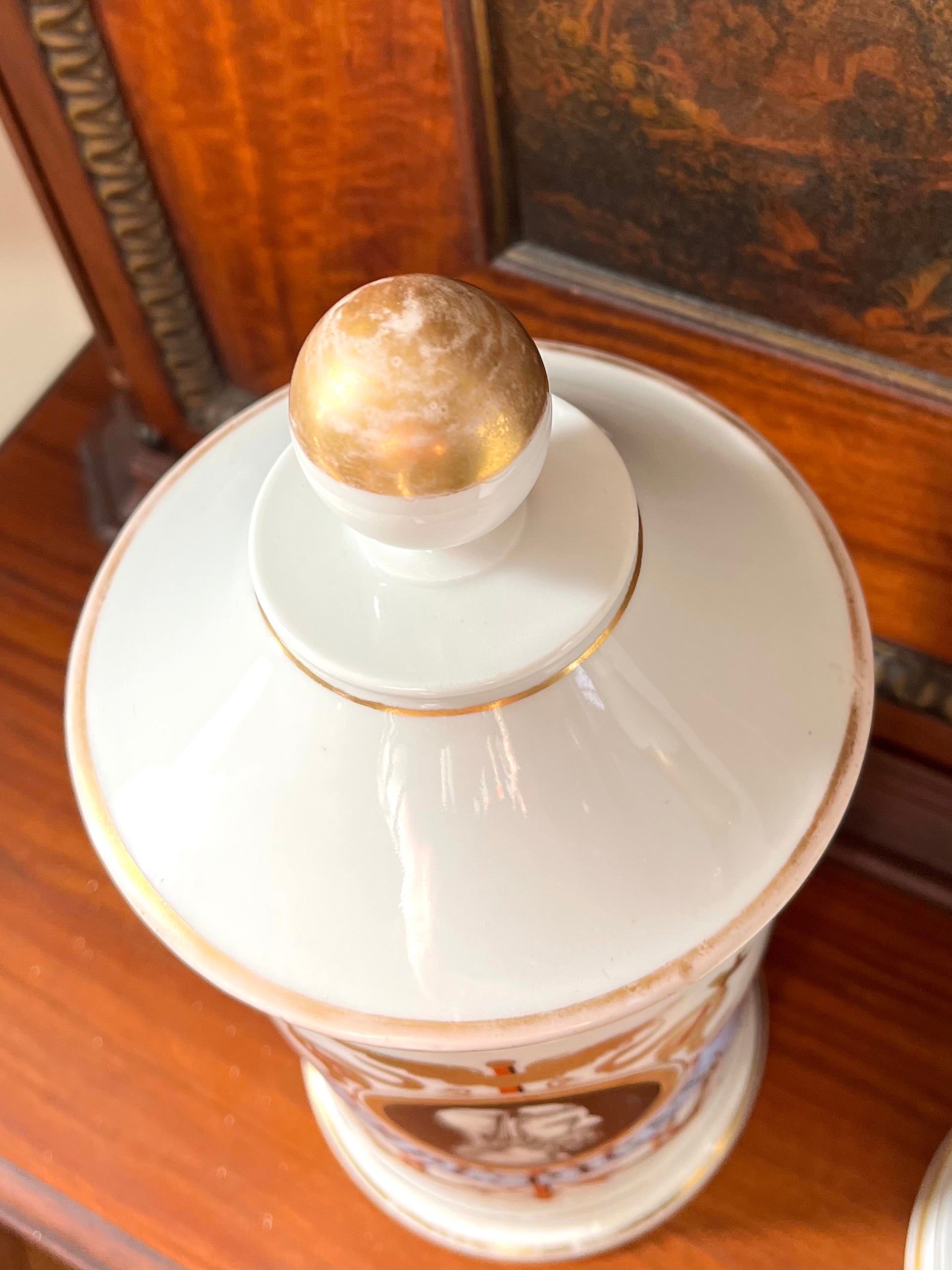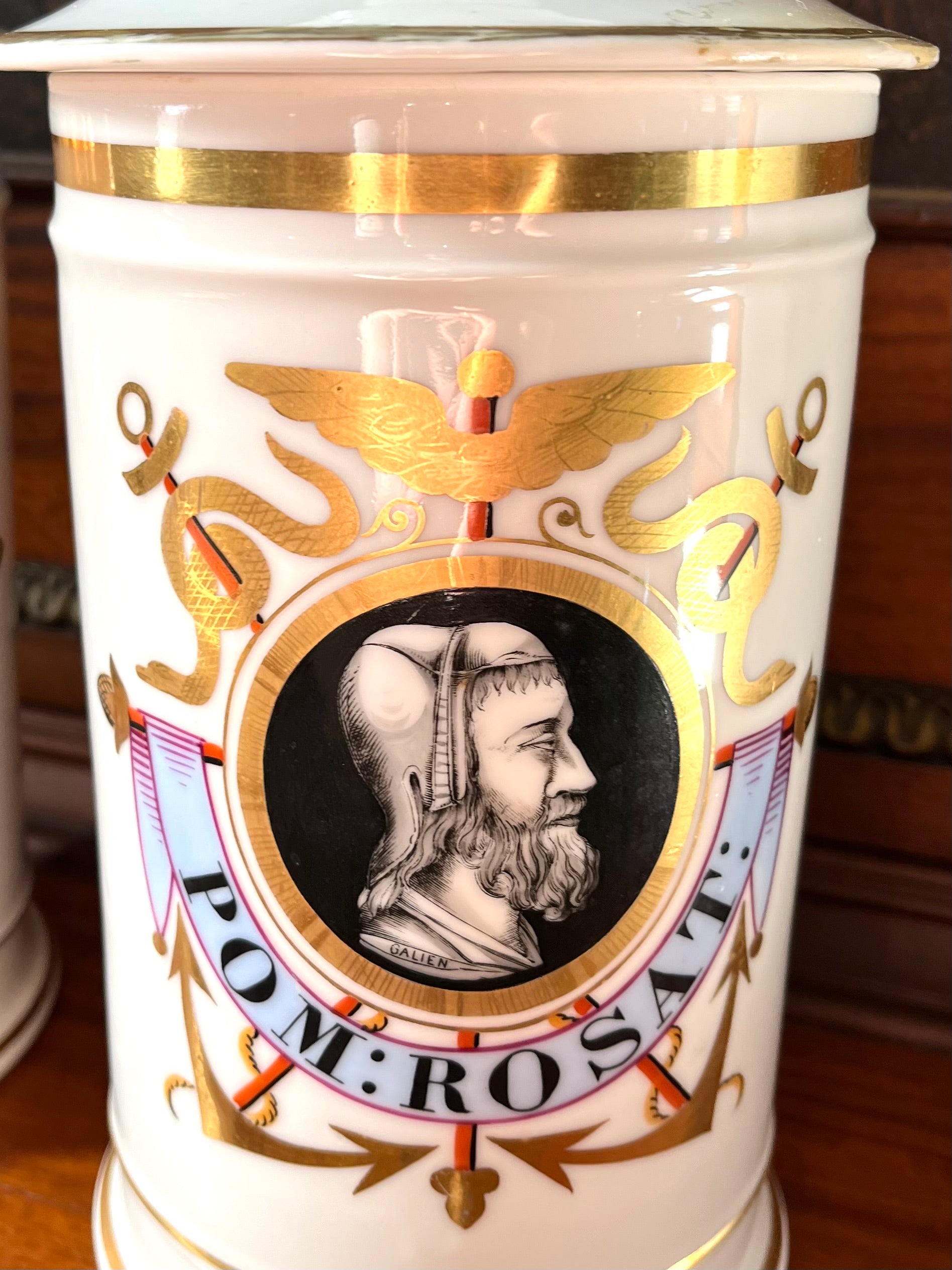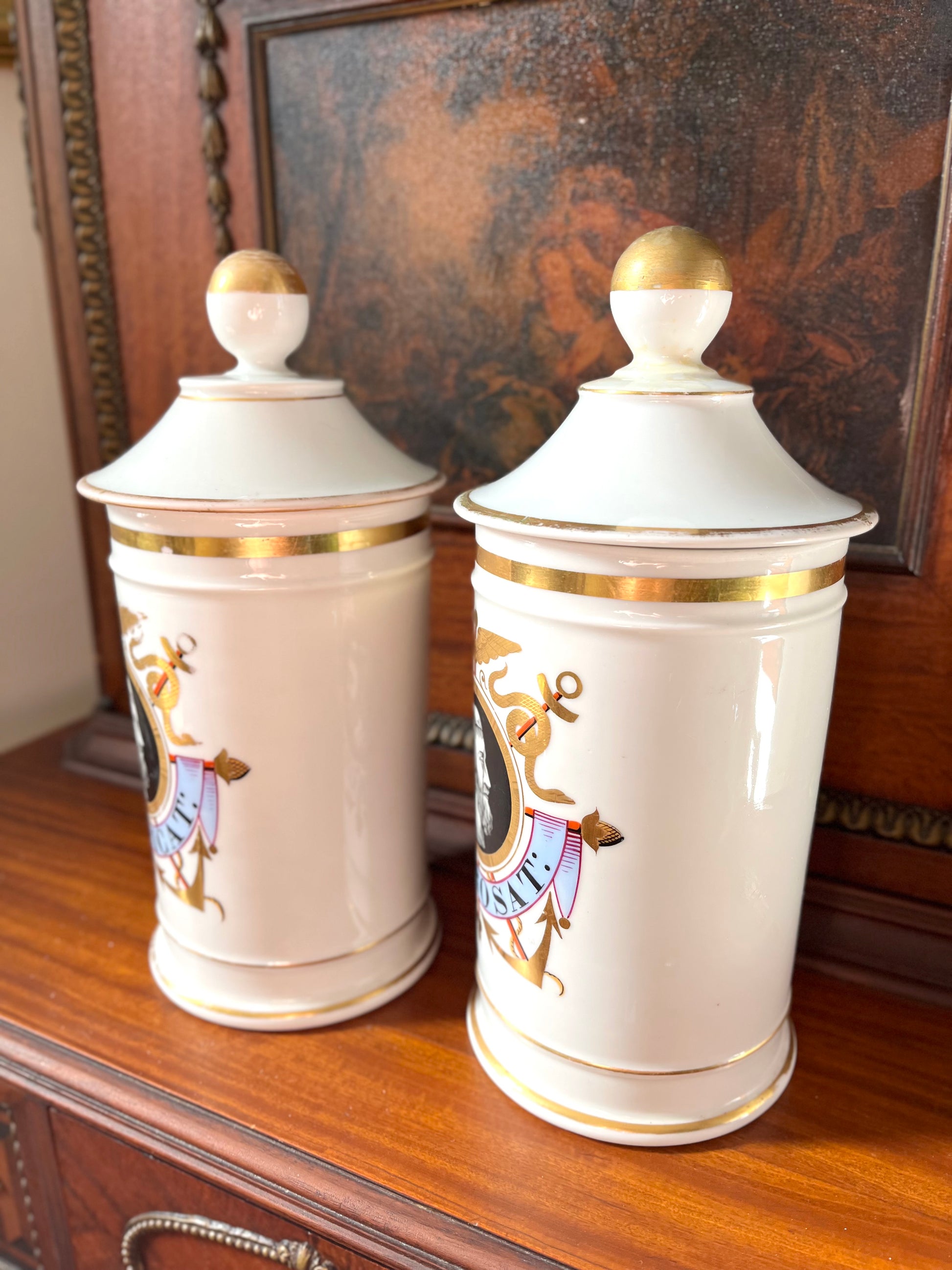 Pair of Antique French Porcelain Apothecary Jars with Portrait Medallions