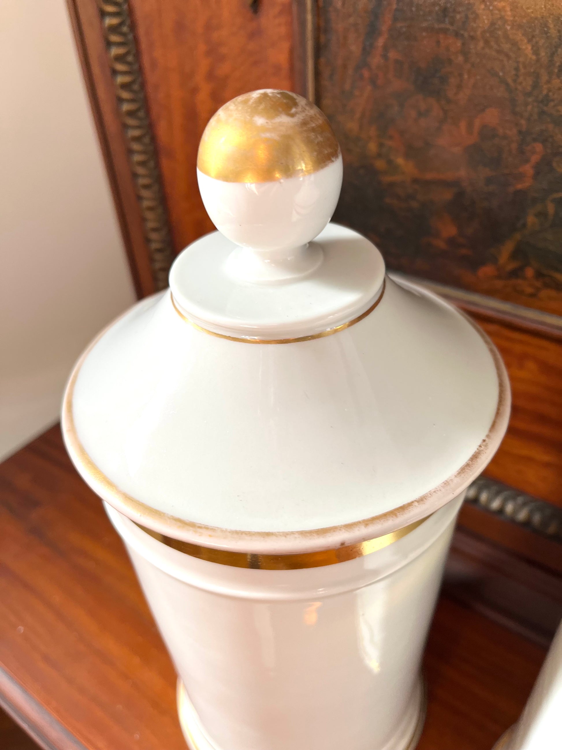 Originally intended for use in a pharmacy or apothecary, these jars were designed to store medicinal compounds while also projecting authority, tradition, and refinement. Today, they translate beautifully as decorative objects — perfect styled on open shelving, a console, or flanking a mantel for instant European gravitas. One lid repaired. Priced accordingly. See photos. Very good condition considering use and original age. Stability not affected.
