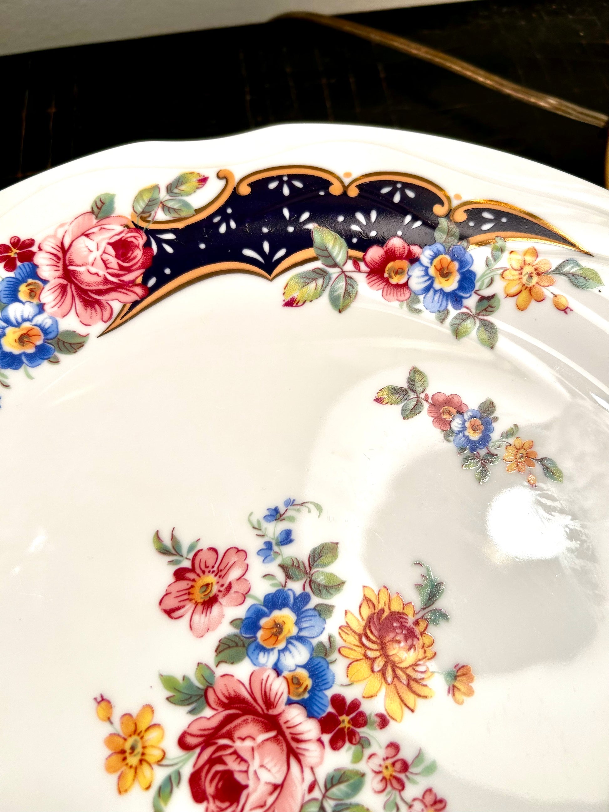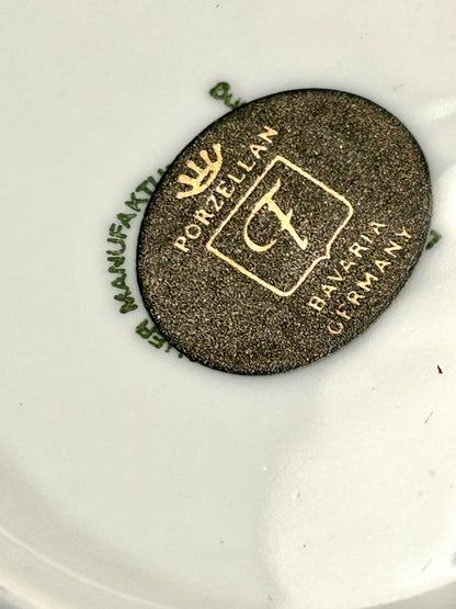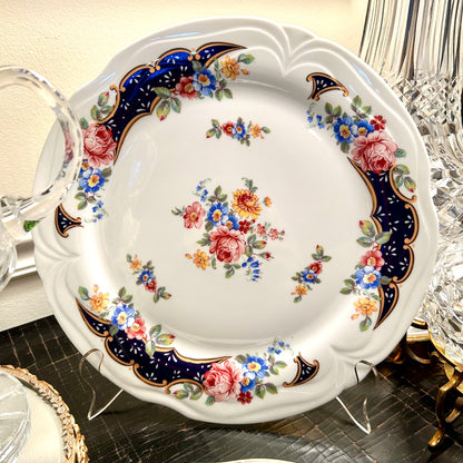 Expertly designed by Portzellian artisans, this porcelain platter features stunning hand-painted floral motifs and a scalloped gold edge, all stamped with a diameter of 12.5 inches.
