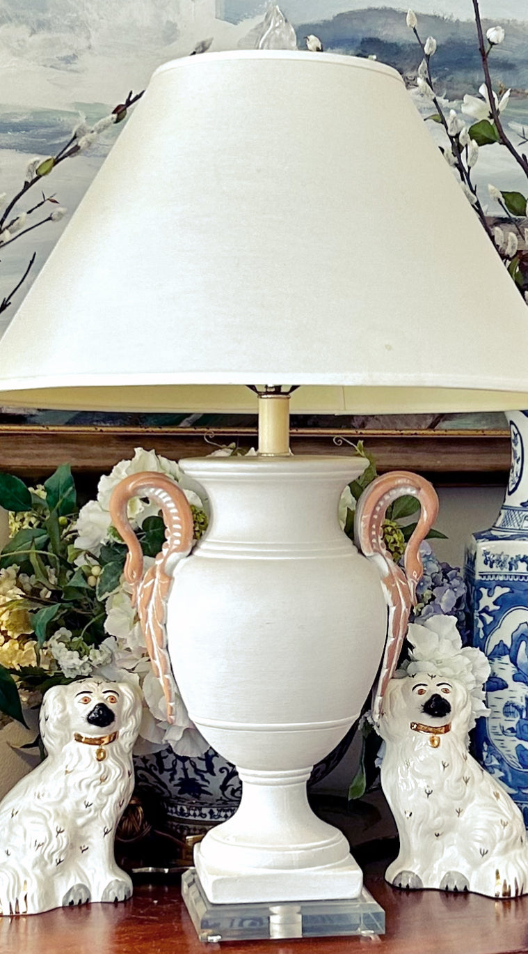 This stunning Chic & Stunning swan double handle ceramic trophy lamp features a luxurious lucite base and an elegant ivory rare cement trophy base, inspired by Hollywood regency style. The terra cotta swan double handles make it a true conversation piece. With a height of 29 inches and a current harp height, this lamp is perfect for adding a touch of sophistication to any room. Its base measures 6 x 6 inches.