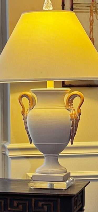Chic & Stunning swan double handle ceramic trophy lamp with lucite base. .