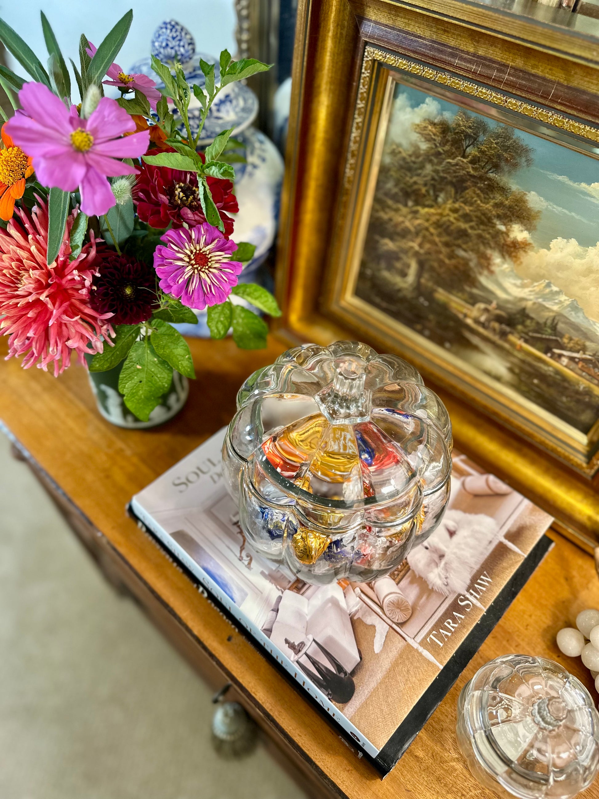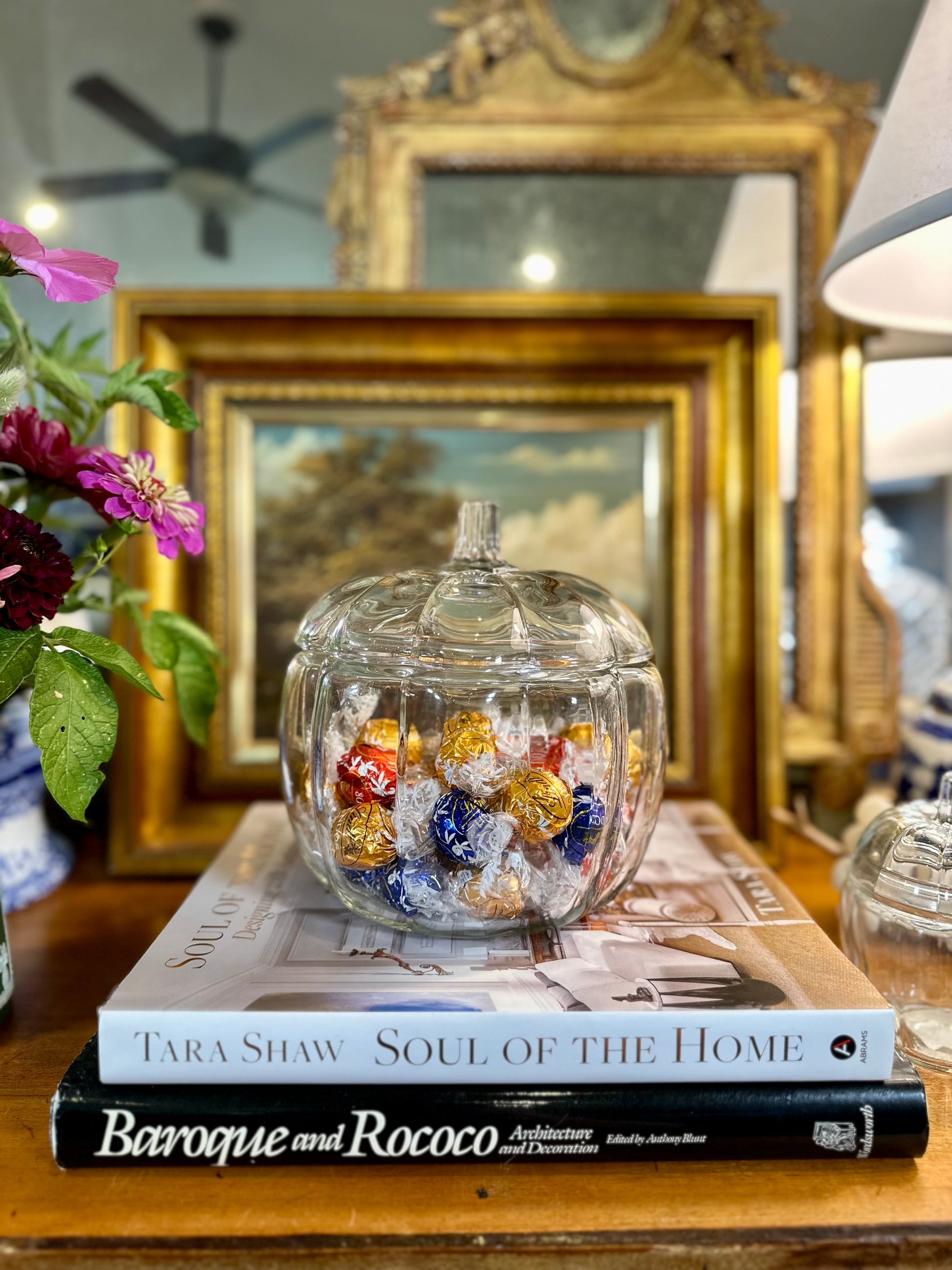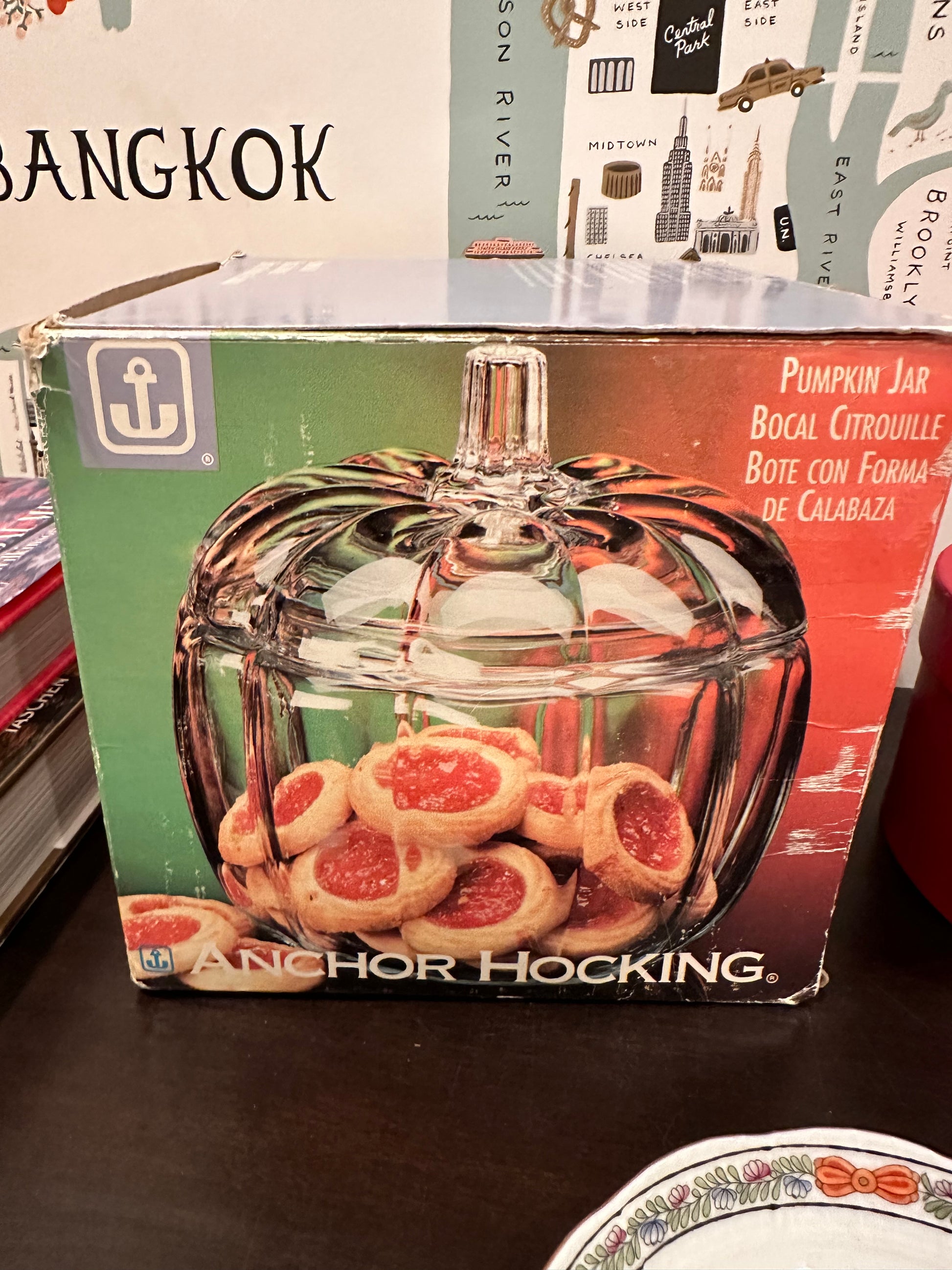 This is a very fun clear glass pumpkin shaped candy bowl with lid made in the USA by Anchor Hocking. Use it to hold Halloween candy, cookies, donuts, pastries, the options are endless. It could also be used to display a small collection of items like pumpkins or fruit for seasonal decor.It will look festive no matter where you put it or how you use it and is a classic piece that has been around for decades. This listing is for 2 with each sold separately. One comes in its original box (if you want it) from the 1970's. Both are in excellent vintage condition with no chips or cracks.