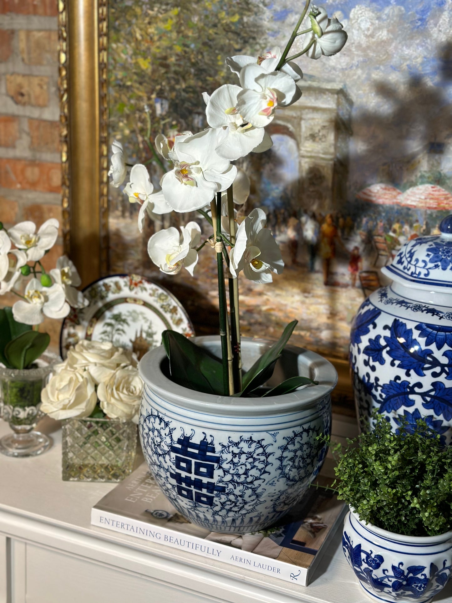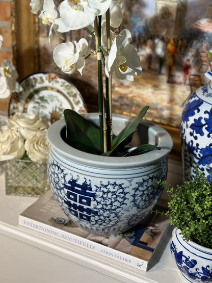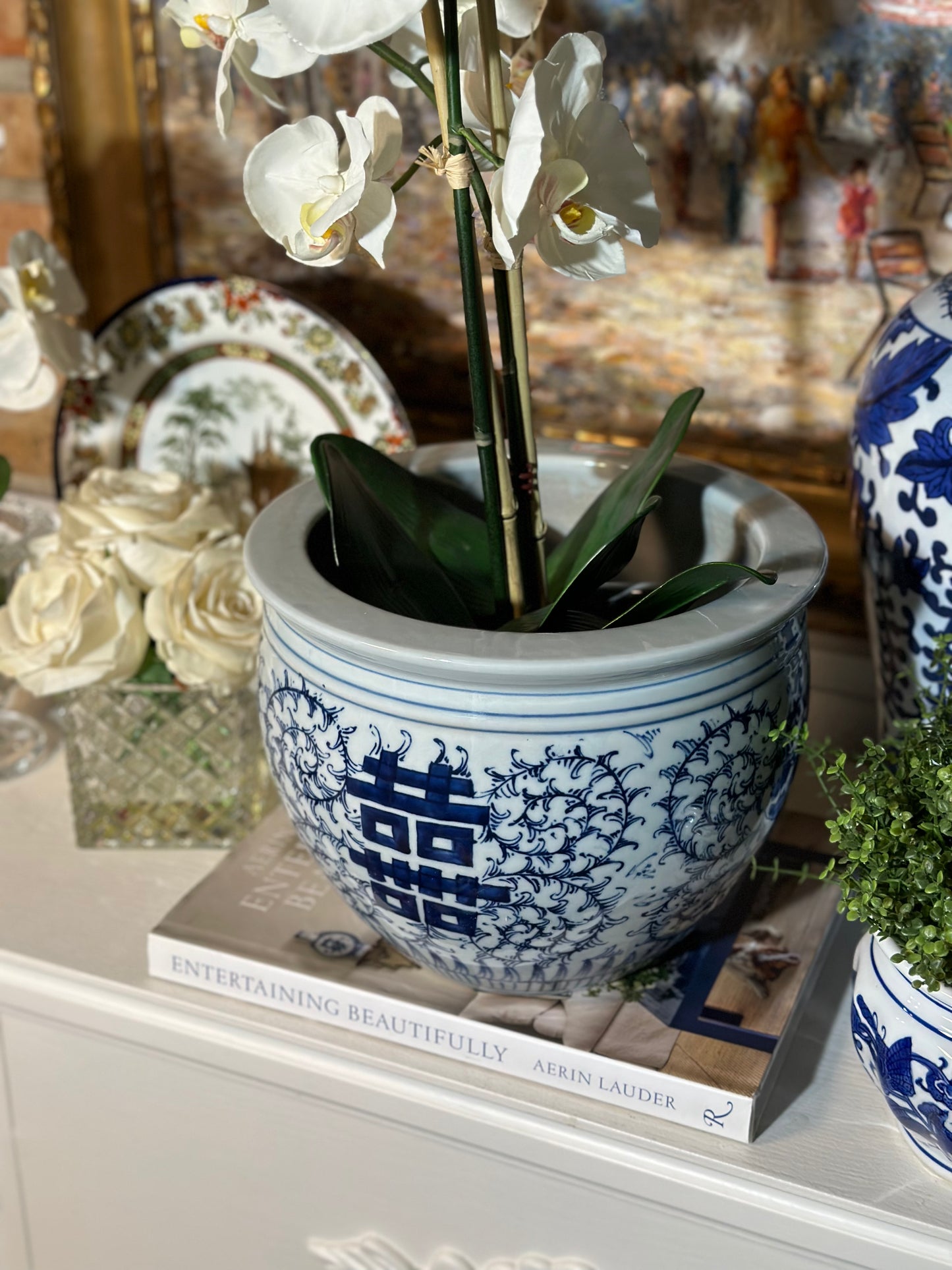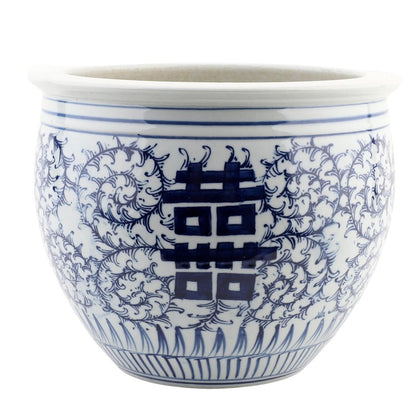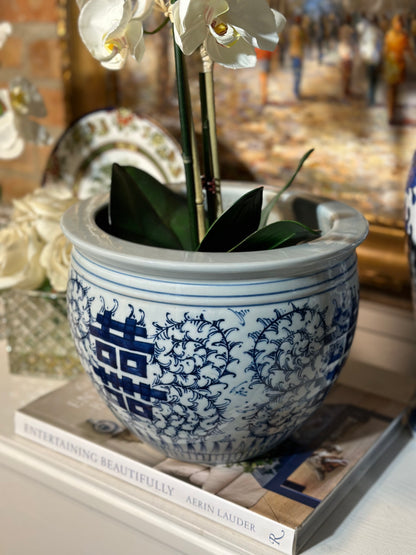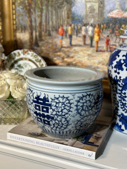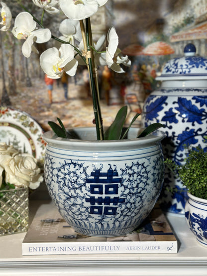 NEW - Blue & White Double Happiness Porcelain Planter, 8" Tall - Pristine!