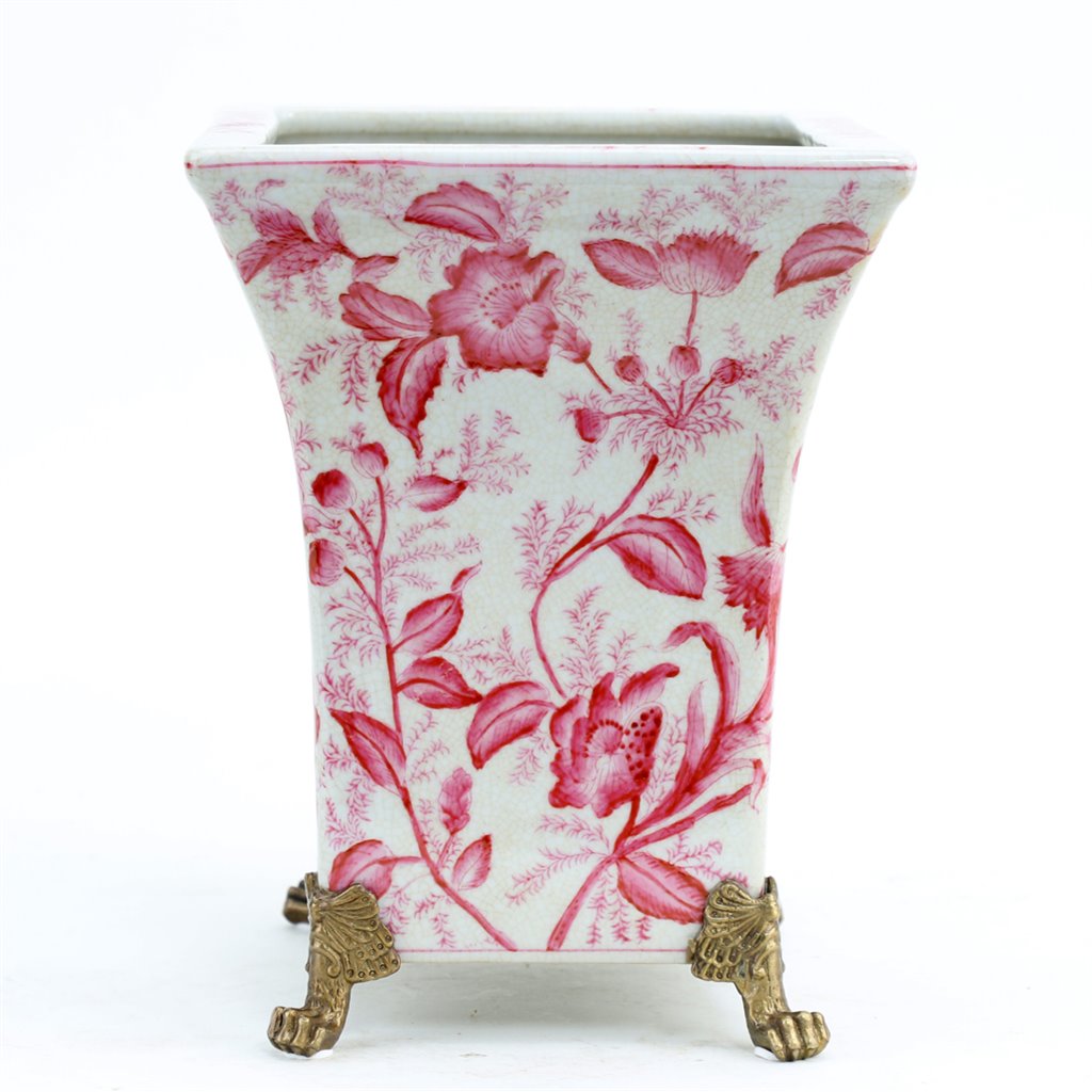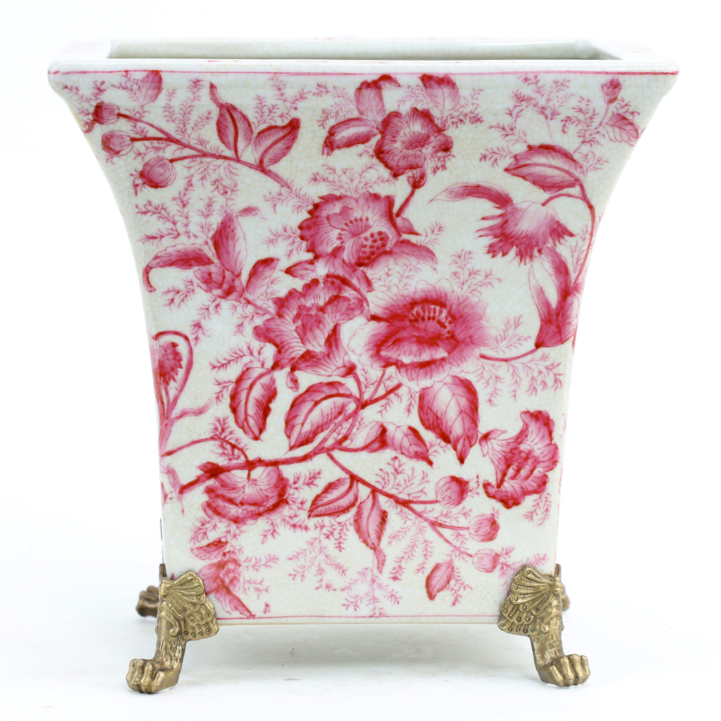 NEW - Pink/White Porcelain, Bronze Detailed Footed Planter, 8.5" Tall. Measures: 8.25L X 6.5W X 8.5H. This planter is the perfect size for any garden space, allowing for both indoor and outdoor use. Its intricate bronze detailing gives it a unique look that will add a touch of luxury to every room!
