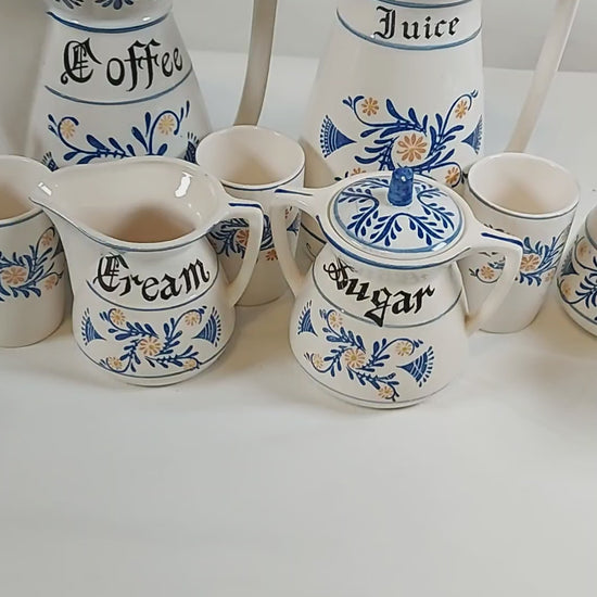 This exceptional Royal Sealy 13-piece set from the 1950s showcases the brand's beloved heritage pattern in blue and white. The complete collection features a coffee carafe with creamer and sugar, juice pitcher with six glasses, salt and pepper shakers, and napkin holder. Now discontinued, this vintage dinnerware set is a prized find for collectors seeking authentic mid-century American tableware. There is a tiny sliver off the top of the sugar holder lid. All other pieces are in great condition.