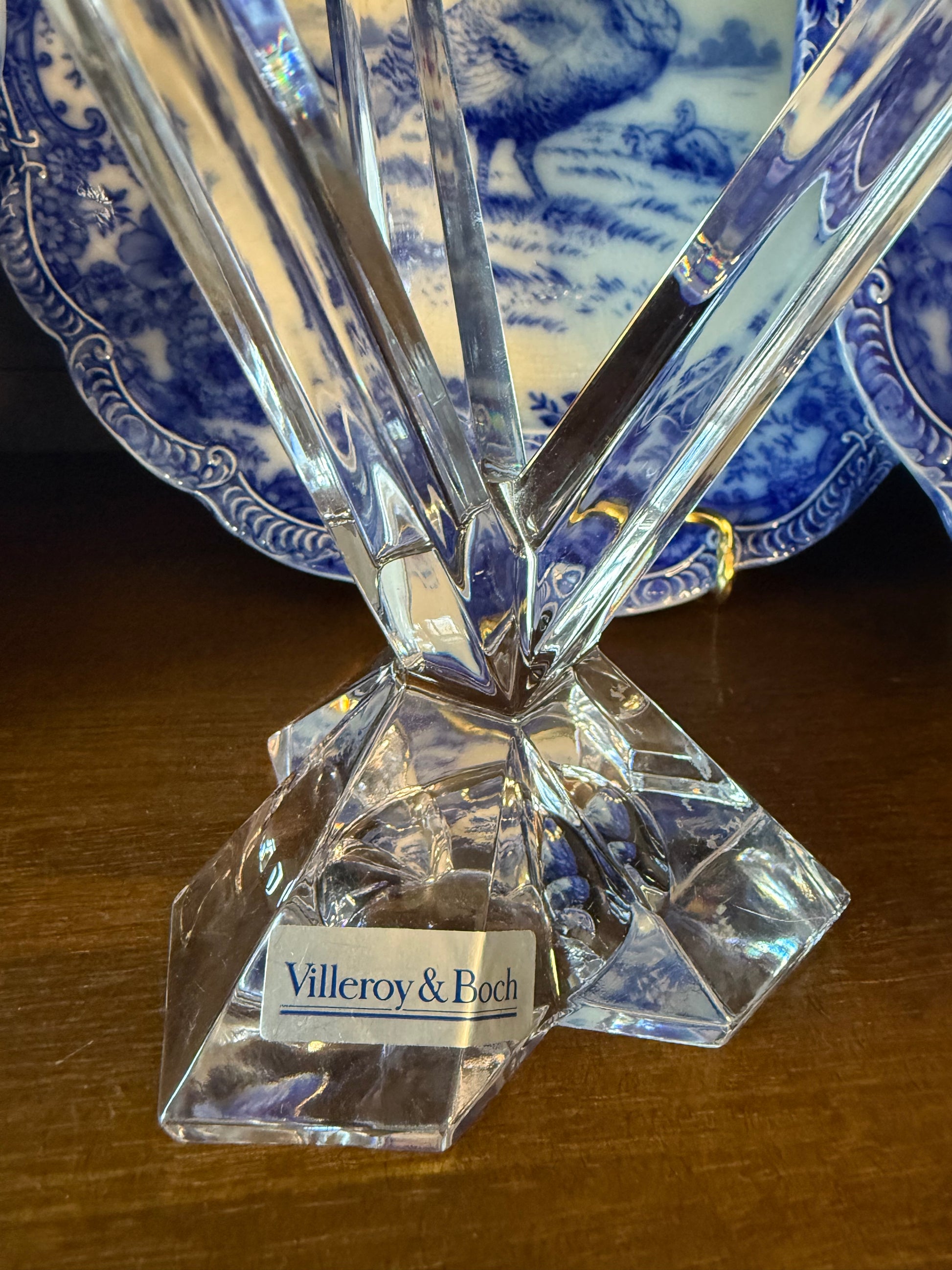 Measures 7” tall by 6” wide, in excellent unused condition. It holds 3 candle tapers and has a sleek and elegant prism design.