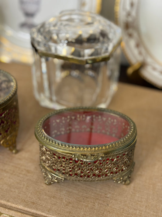 Vintage Ormolu Filigree Jewelry Caskets – Glass Lid & Velvet Lined, Sold Separately