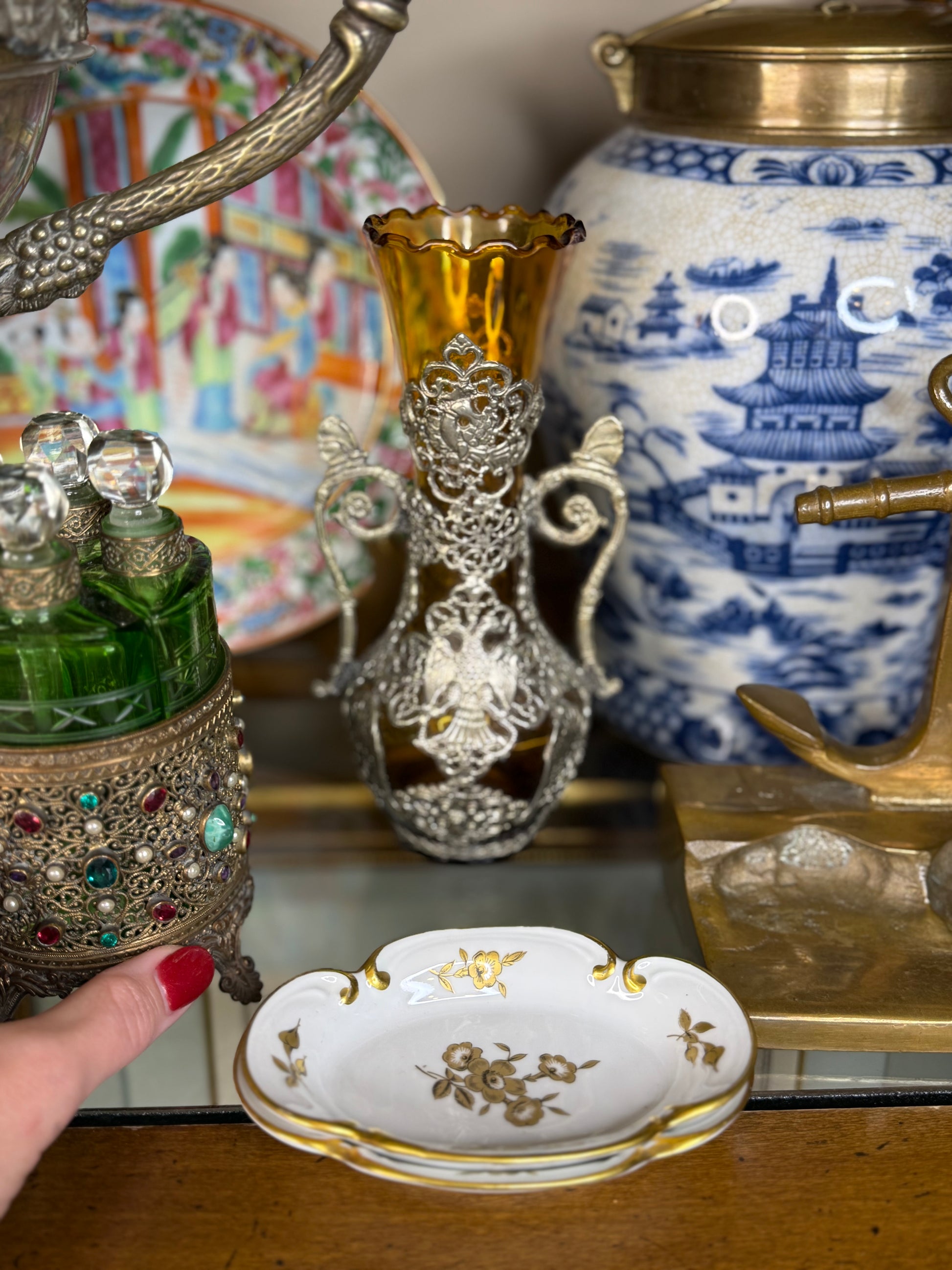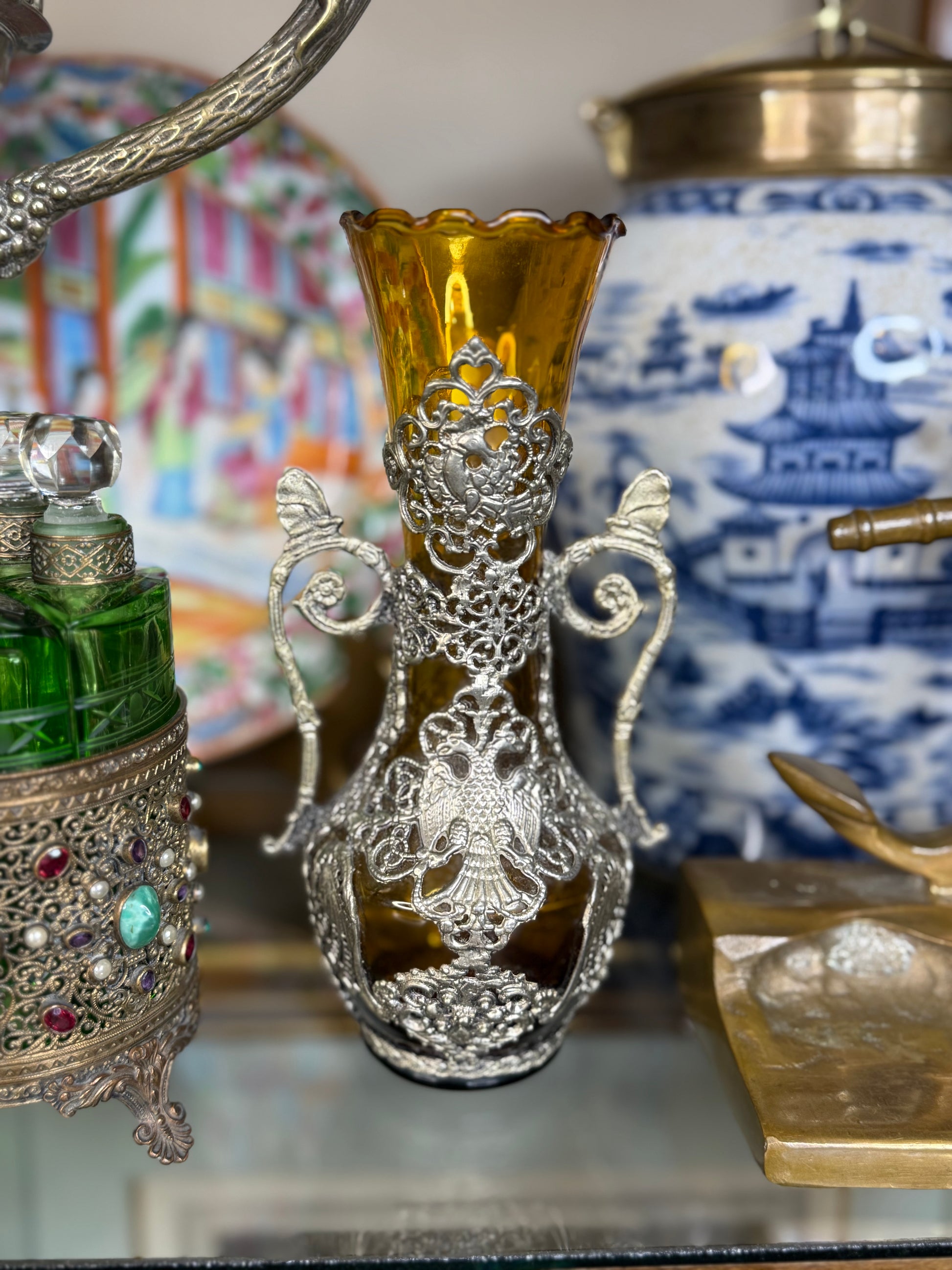 Amber Blown Glass Vase W/ Ornate Metal Overlay | Double-Handled Phoenix Motif
