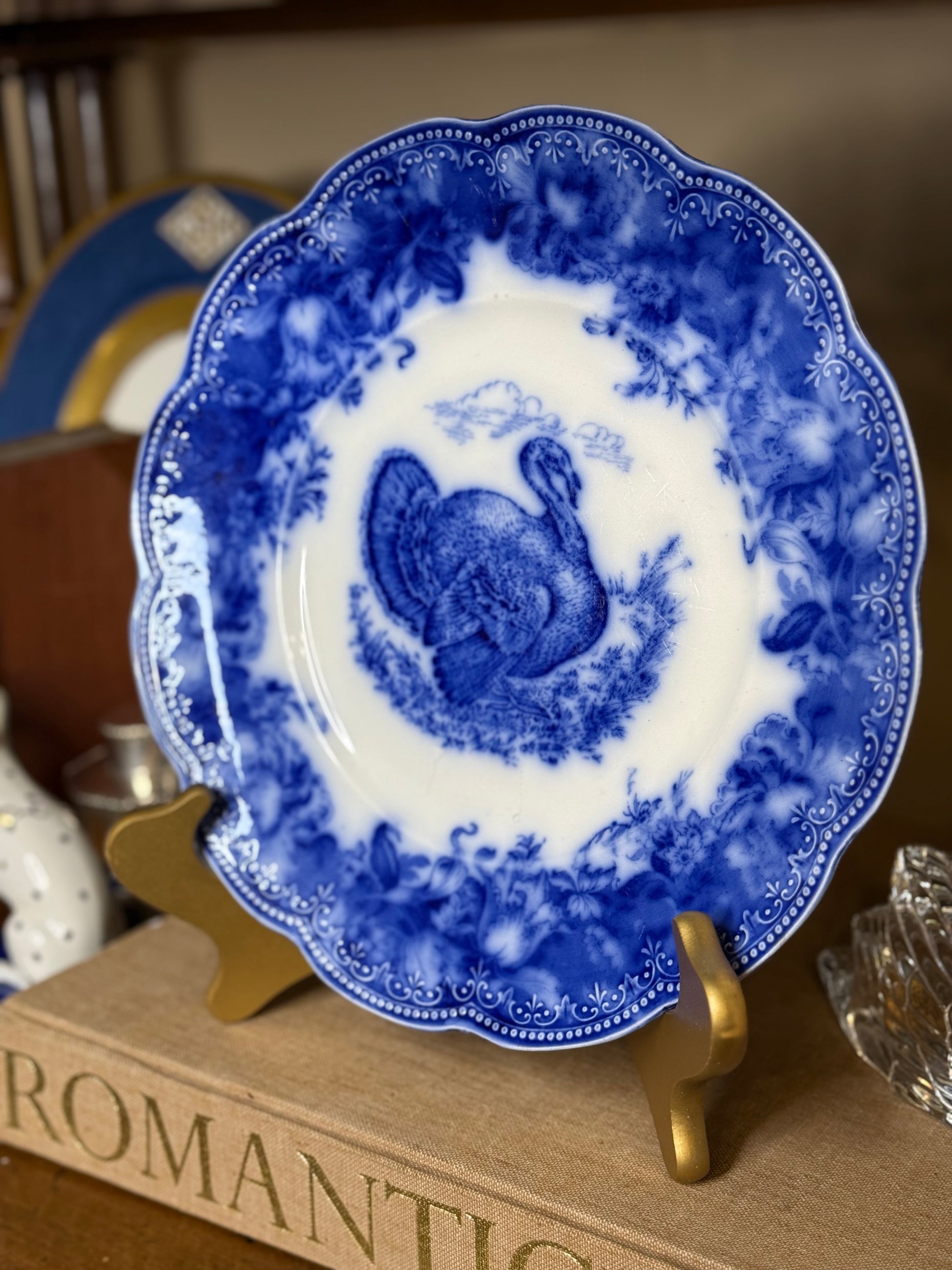A striking example of late Victorian English transferware, this antique Wedgwood “Turkey” plate dates to the circa 1890s and features a richly detailed game bird motif in deep cobalt blue.