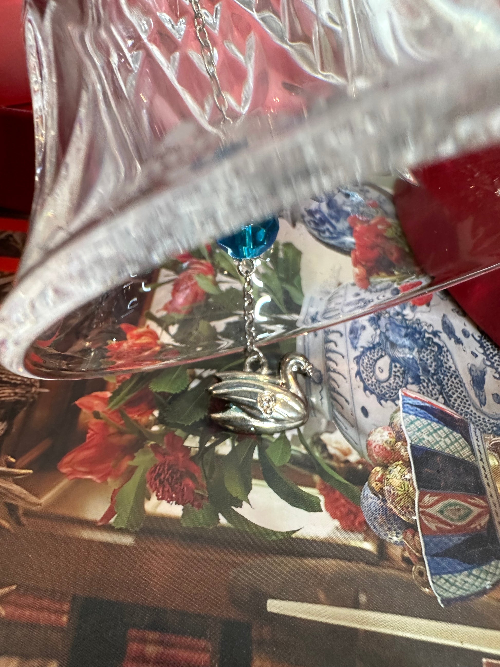 This is the 7th issue of the limited edition series "12 Days of Christmas Bells" by Waterford made in Ireland. This day 7 beautifully cut crystal bell ornament represents the "seven swans a swimming" and has a bell flapper on the inside with a blue crystal bead and a silver swan charm hanging at the end of it. It's marked with the acid etched Waterford mark on the edge of the bell. This would be a beautiful addition to a Christmas tree, to add to a display collection or is boxed and ready to give as a gift. This piece is in excellent near perfect condition and comes with original box, although it is missing it's original red silk ribbon and has been replaced with a red velvet ribbon.