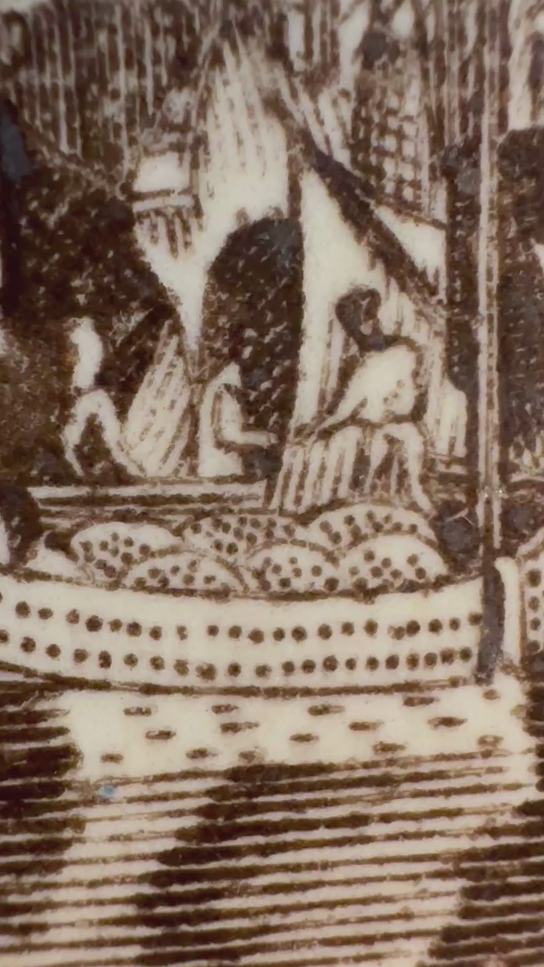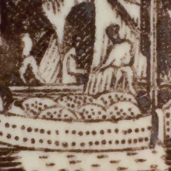 Antique Italian transferware plate in the brown Ferrara pattern by Andrea Galvani made in Pordenone, Italy (near Venice) circa late 19th/early 20th century. This cream earthenware plate depicts a scene in the center with ships and buildings while the border is comprised of florals with a scroll edge all in brown. It is in very good condition with no cracks or repairs but it does have some tiny rim chips. It is marked on the back in brown with the company name "ANDREA GALVANI PORDENONE" in a circle with a rooster in the center and pattern name "FERRARA" underneath; there is also an impressed number 11. It would be a unique addition to a plate wall or cabinet display.