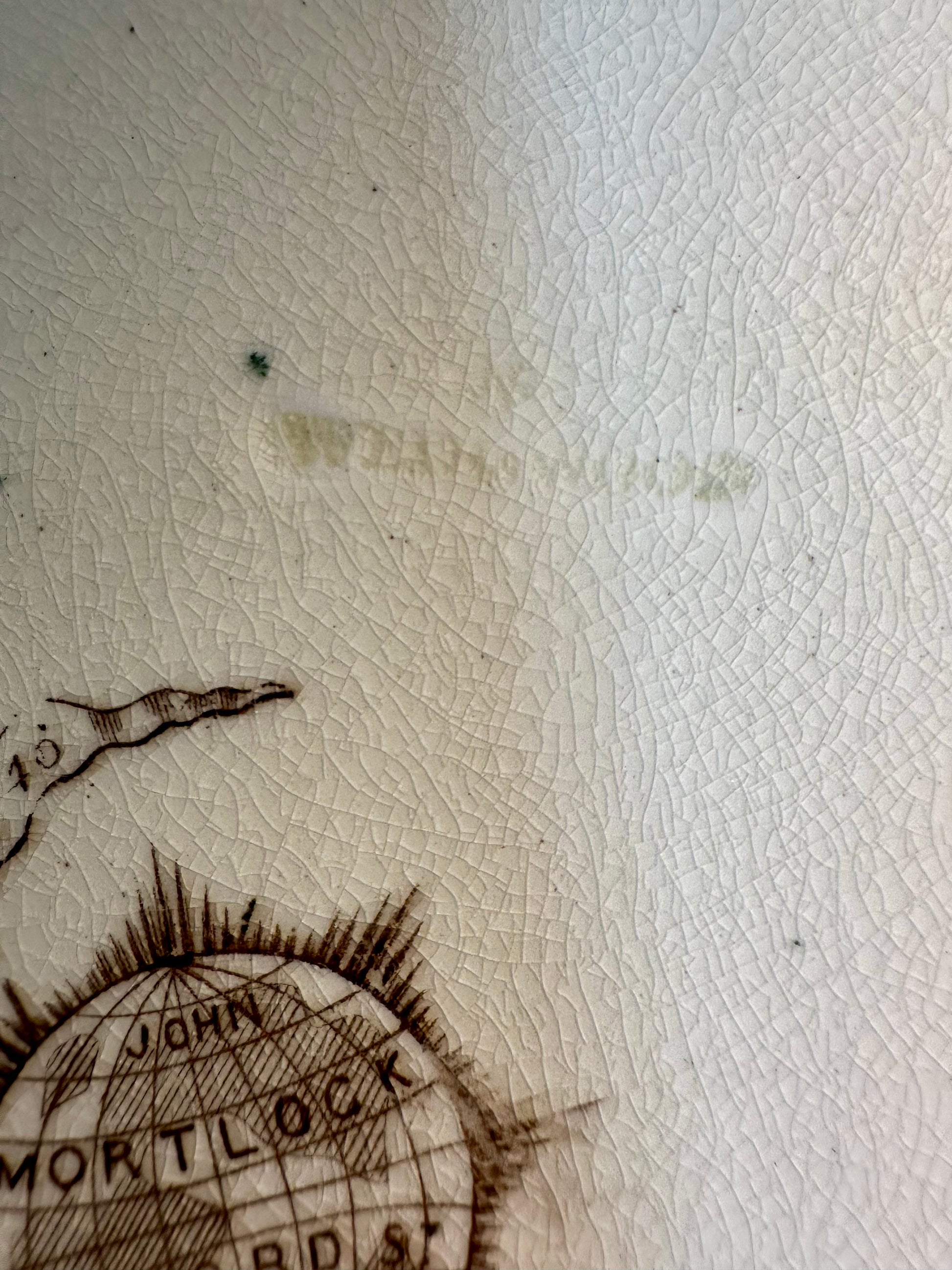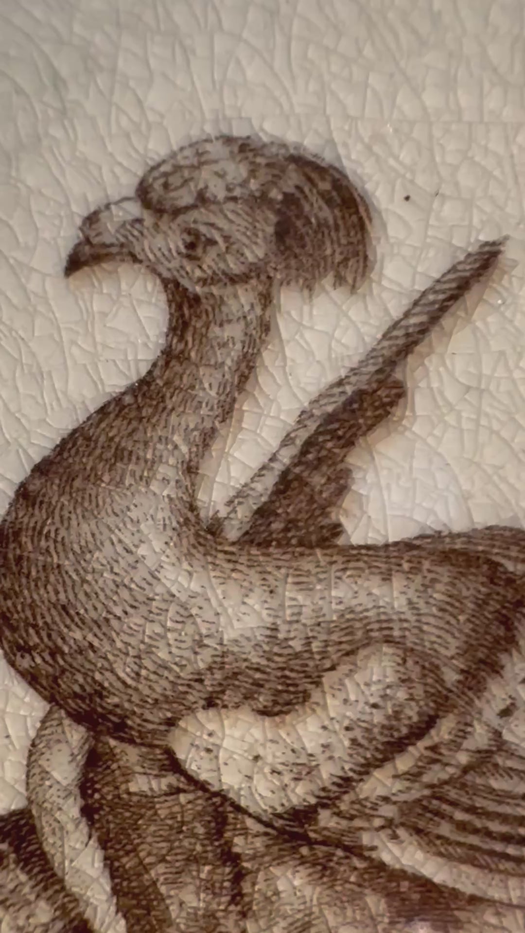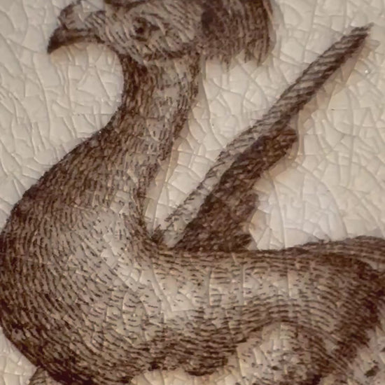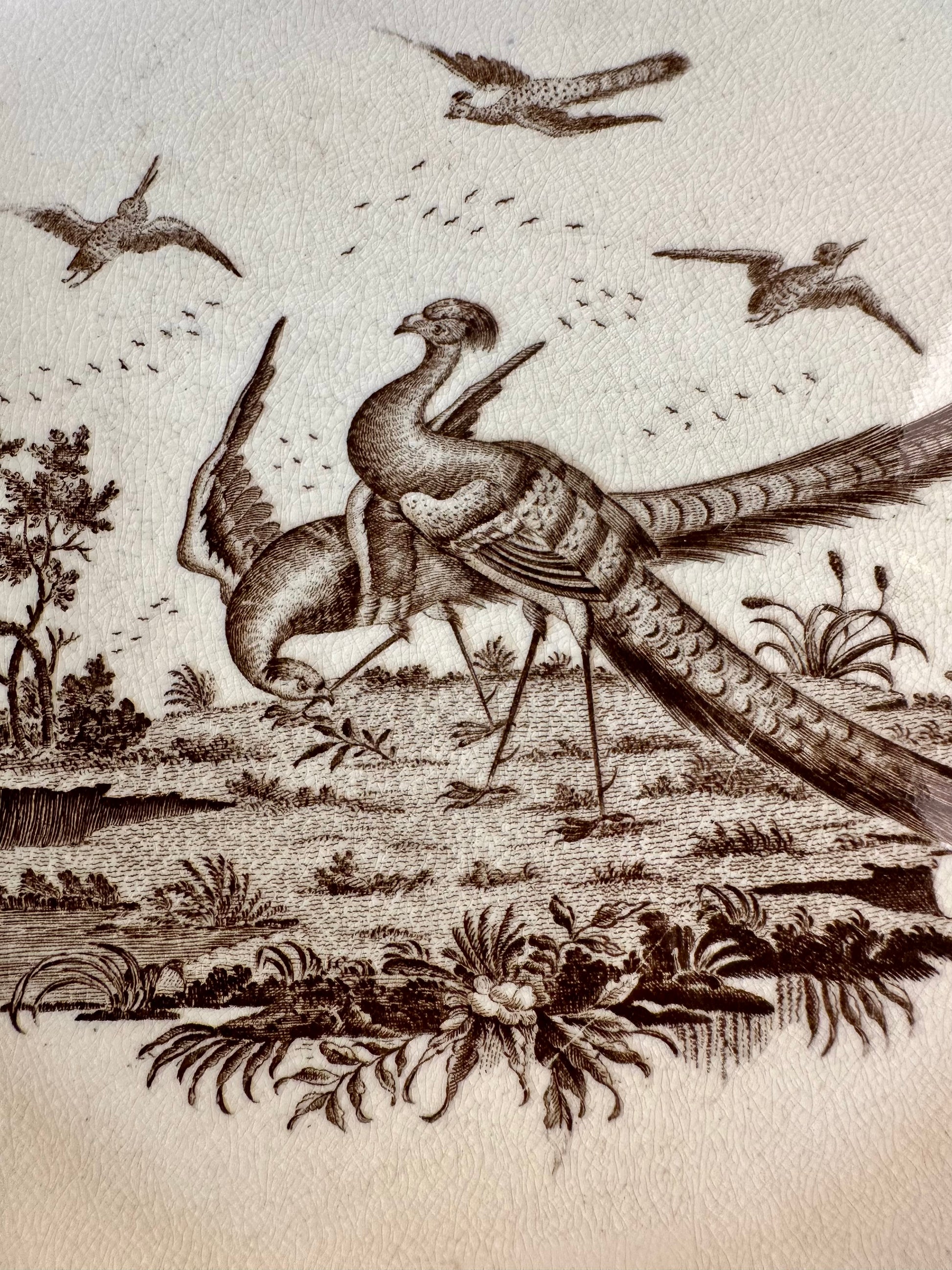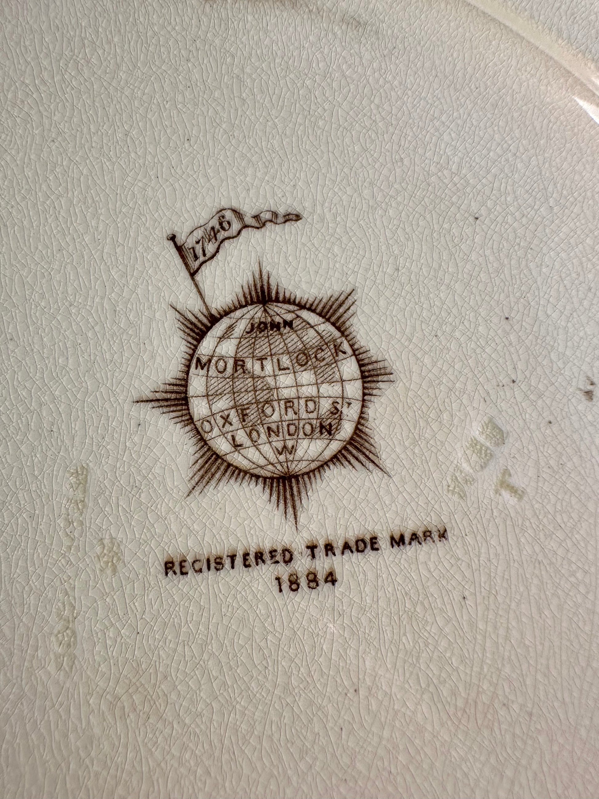 A gorgeous pair of antique brown transferware dinner plates in the "Lag & Feather" pattern by Wedgwood for retailer John Mortlock Oxford Street London, England circa 1884. These cream colored plates feature a border with a spectacular folded ribbon motif highlighted with laurel leaves and the central scene dominated by large exotic birds, possibly peacocks, sitting and flying. Stamped on the back "JOHN MORTLOCK OXFORD ST LONDON" inside a globe with a flag above with 1746 and "registered trade mark 1884" below along with an impressed "WEDGWOOD" and three letters ending with an "M" and a number that's illegible due to crazing. The "M" dates these plates to 1884, making them 141 years old. The pair are in excellent antique condition with no chips or cracks, but show lots of character from crazing, some staining and wear consistent with age. These are perfect for the collector who appreciates age-related imperfections and will display beautifully in a plate wall, plate rack or cabinet.
