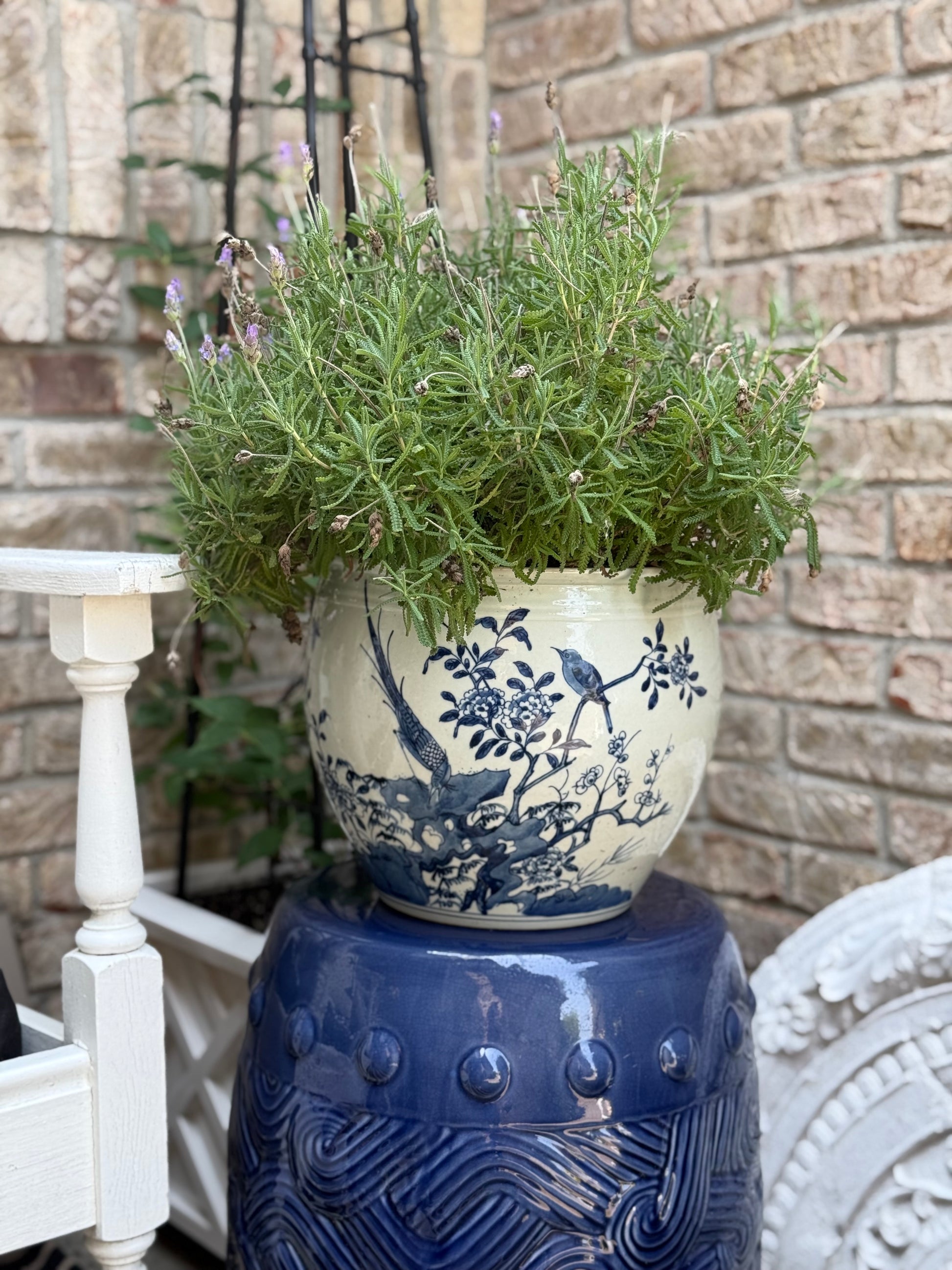 This planter/Pot is perfect for bringing style to your garden, porch, patio or balcony. Make the most of your outdoor spaces with this hand painted design that will add a vibrant touch to your yard. NEW - Blue & White Hand painted Planter/Pot Bird Design, 10" Tall. Measures: 10Lx10Wx9H. Bot :6.5" wide, Top: 8.5" wide.