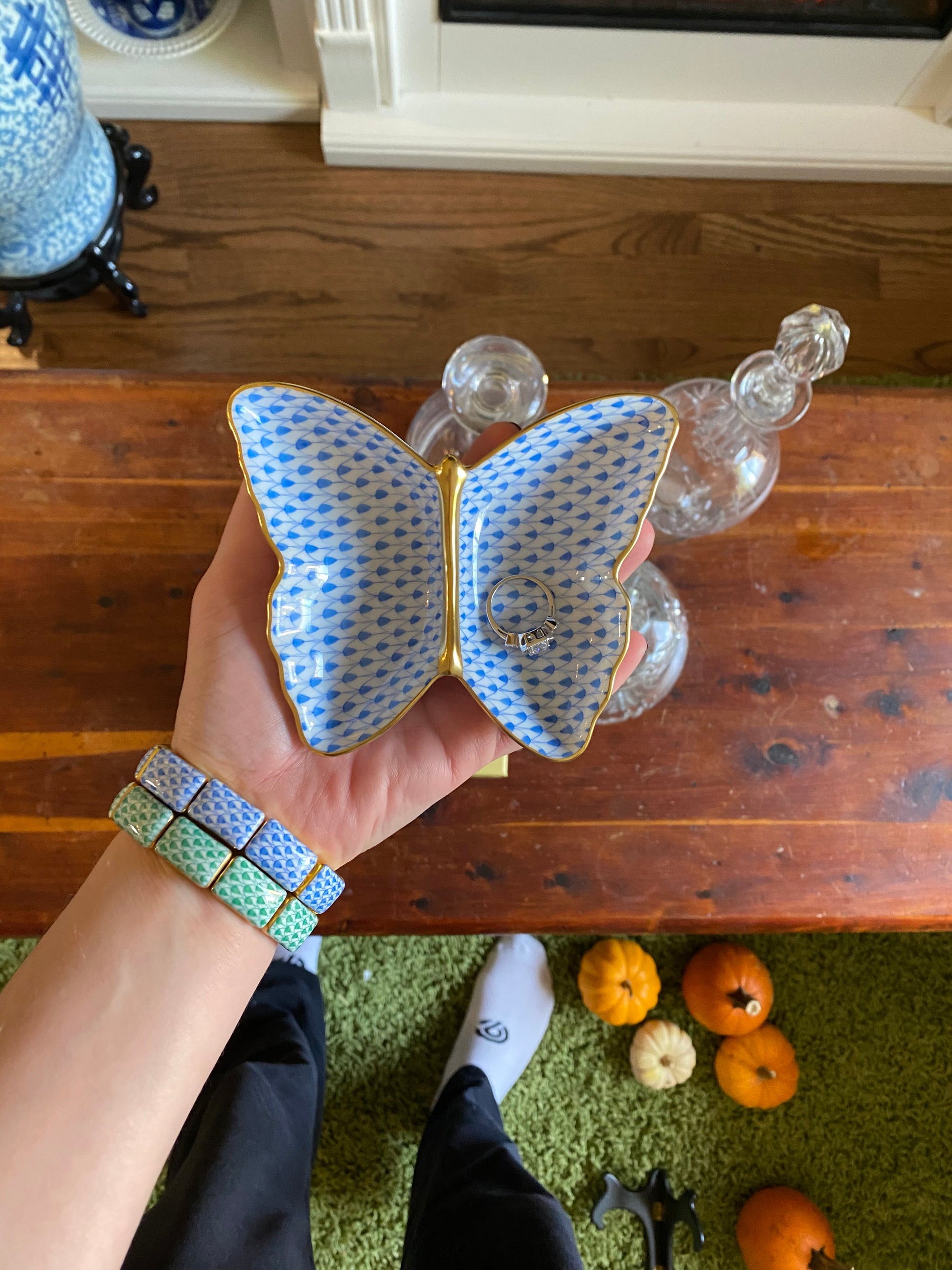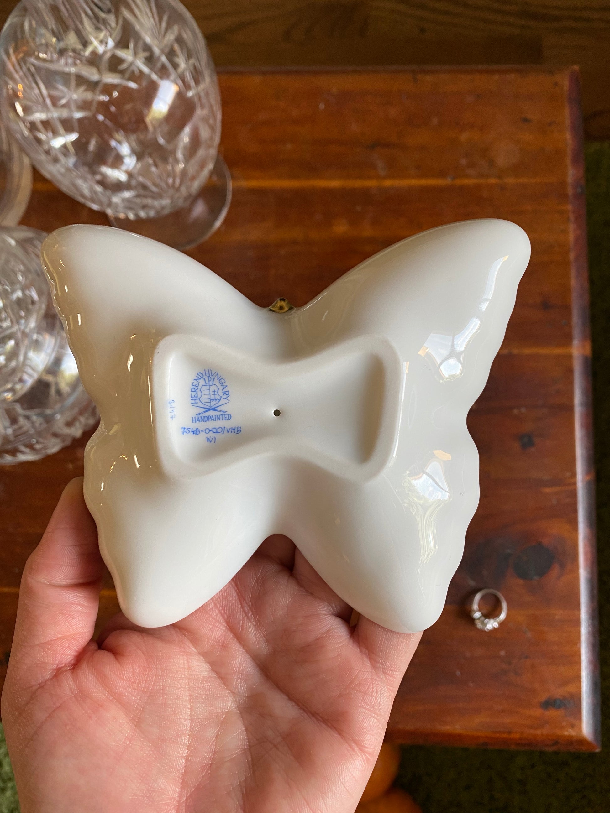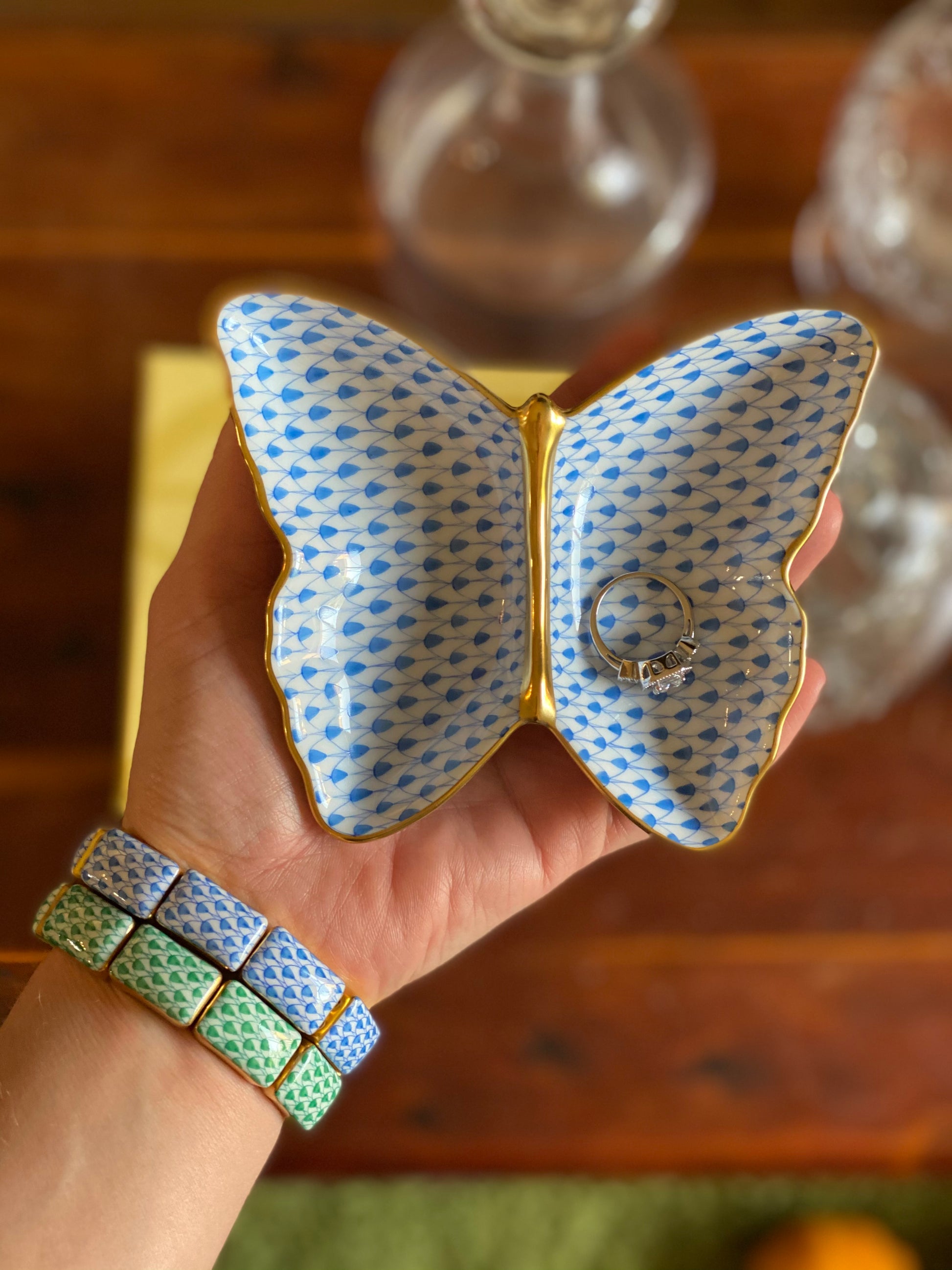 This exquisite porcelain butterfly trinket dish in coveted Fishnet pattern is hand-painted in Hungary and finished with 24K gold accents. A collectible heirloom and a sound investment in fine art, Herend porcelain is not just to be admired- it is made to be enjoyed.