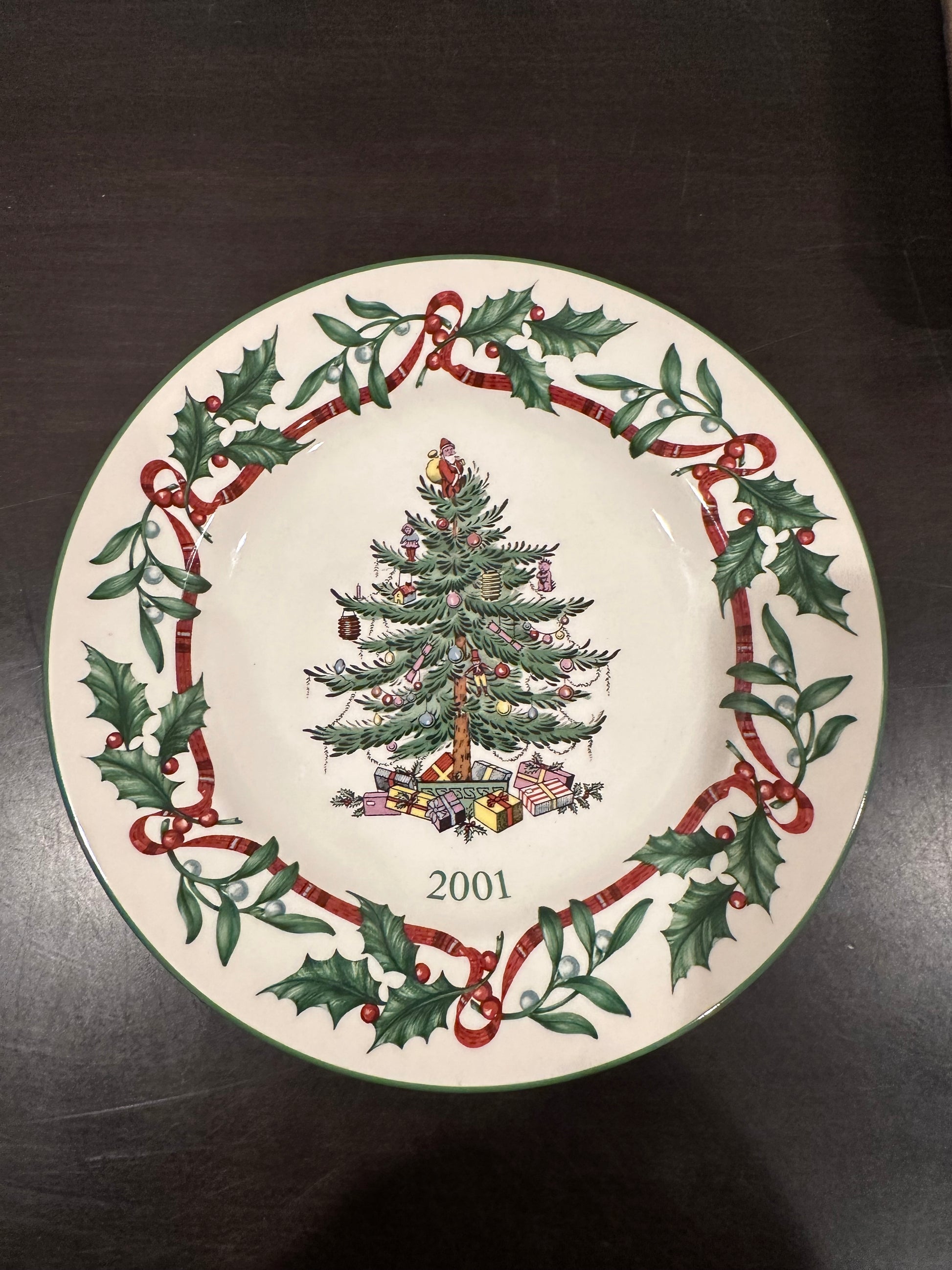 This is a beautiful collectible annual plate in the Christmas tree pattern by Spode with a holly and red plaid ribbon border made in England in 2001. This discontinued piece is in excellent condition with no chips, cracks or crazing and measures 7.75" in diameter. Comp from Replacements is $59.99.