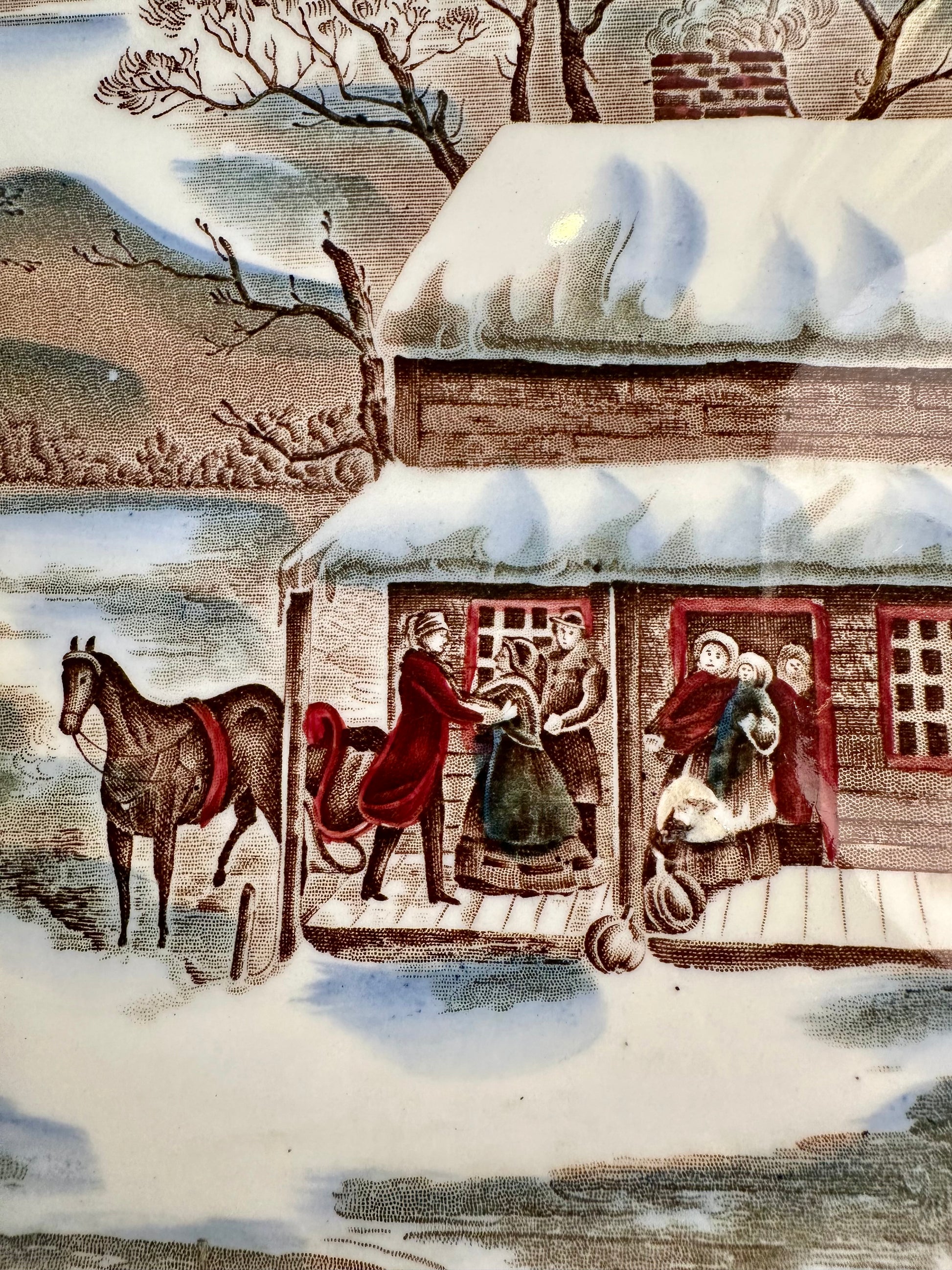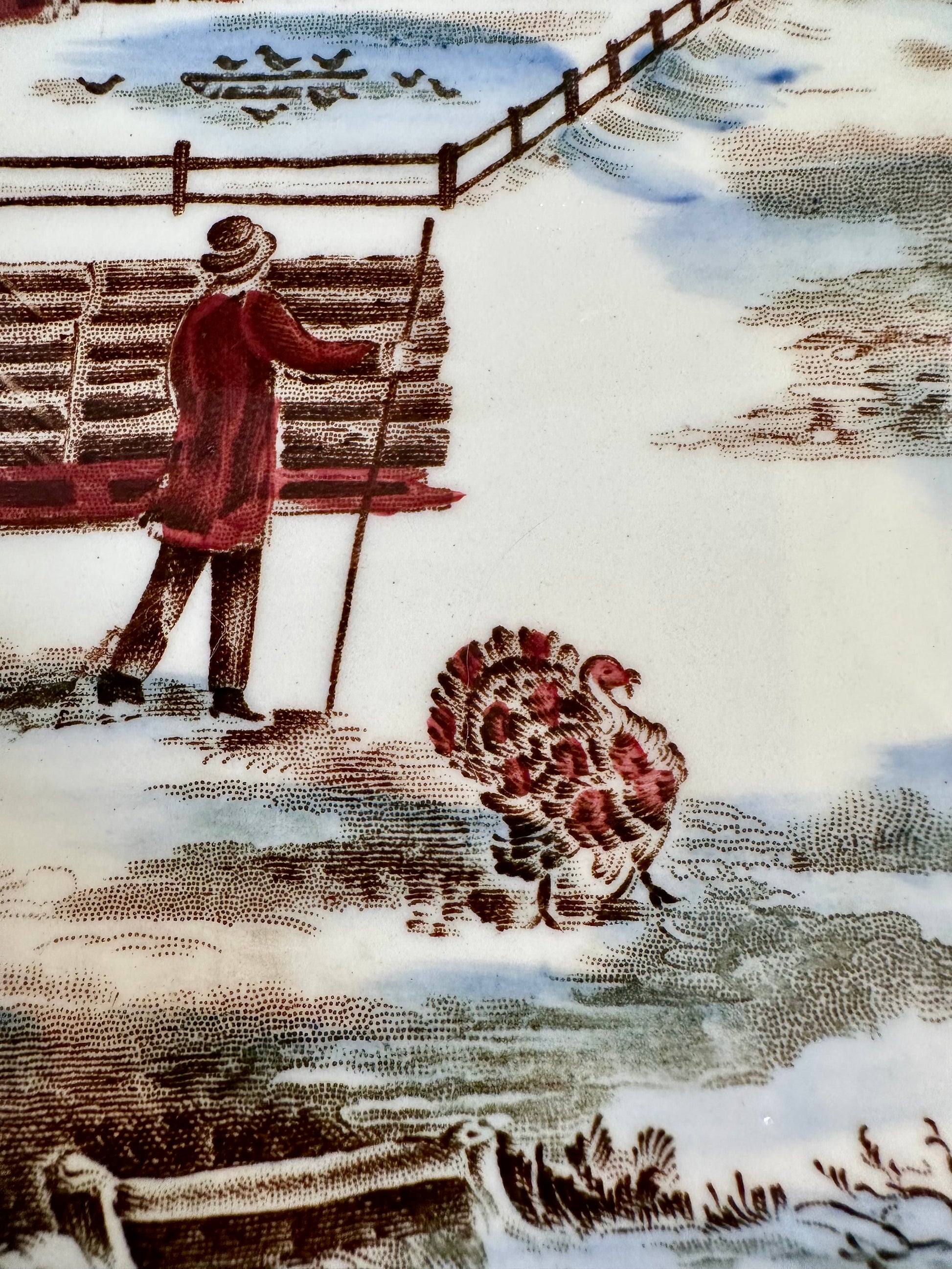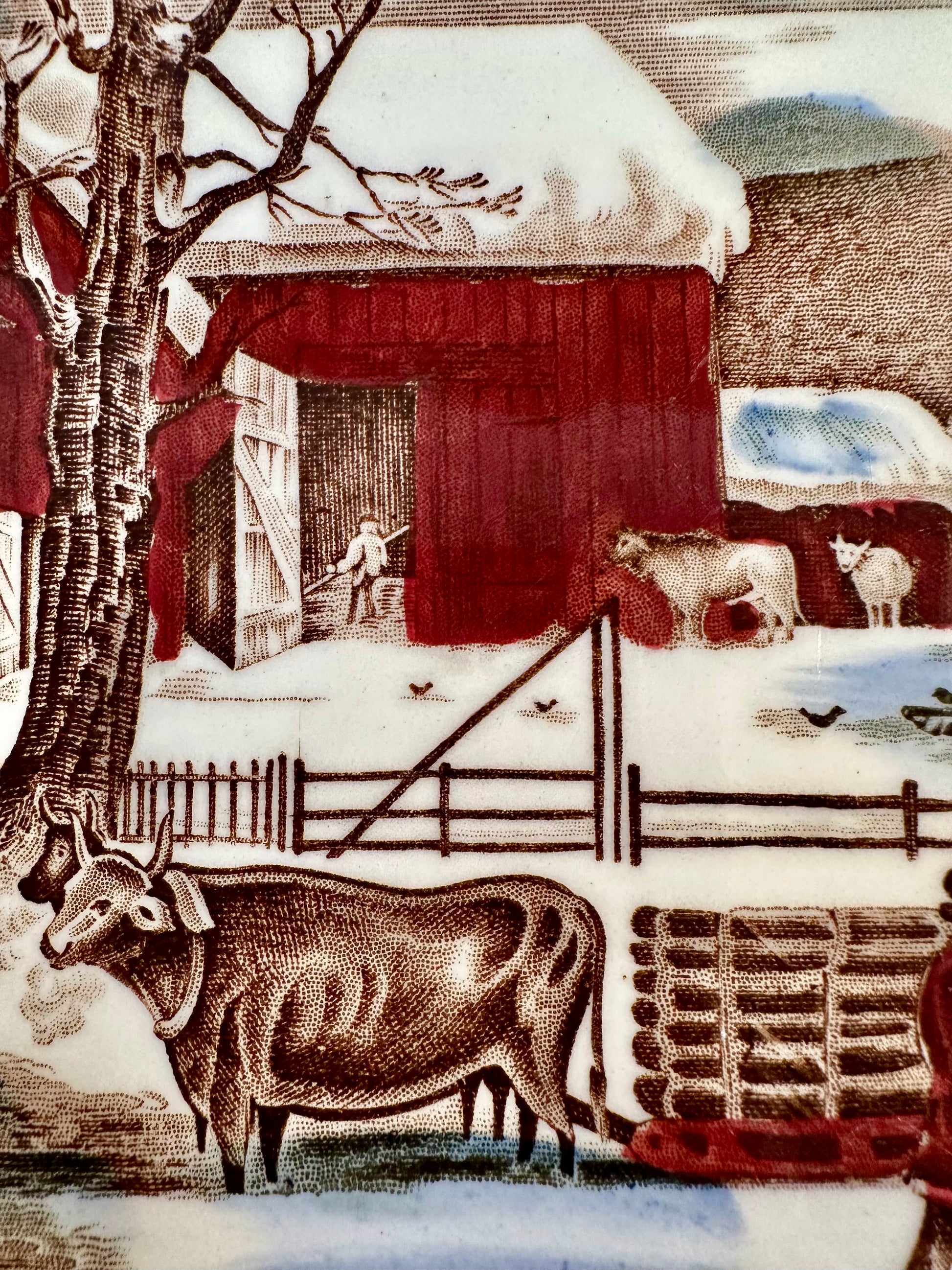 A fabulous large holiday platter in the Historic America – Home for Thanksgiving pattern by Johnson Brothers, England (circa 1930–1974). This beautifully detailed piece features a charming winter scene with cows, horses, a turkey, and figures set in a snowy countryside, all rendered in rich multicolor transferware with a border of oak leaves and acorns in brown transferware. Stamped on the reverse, as shown in photos. Perfect for serving your holiday turkey or as a striking centerpiece on your Thanksgiving table. It’s in excellent vintage condition with no chips, cracks, or crazing. Minor manufacturing irregularities and light age-related wear consistent with use.