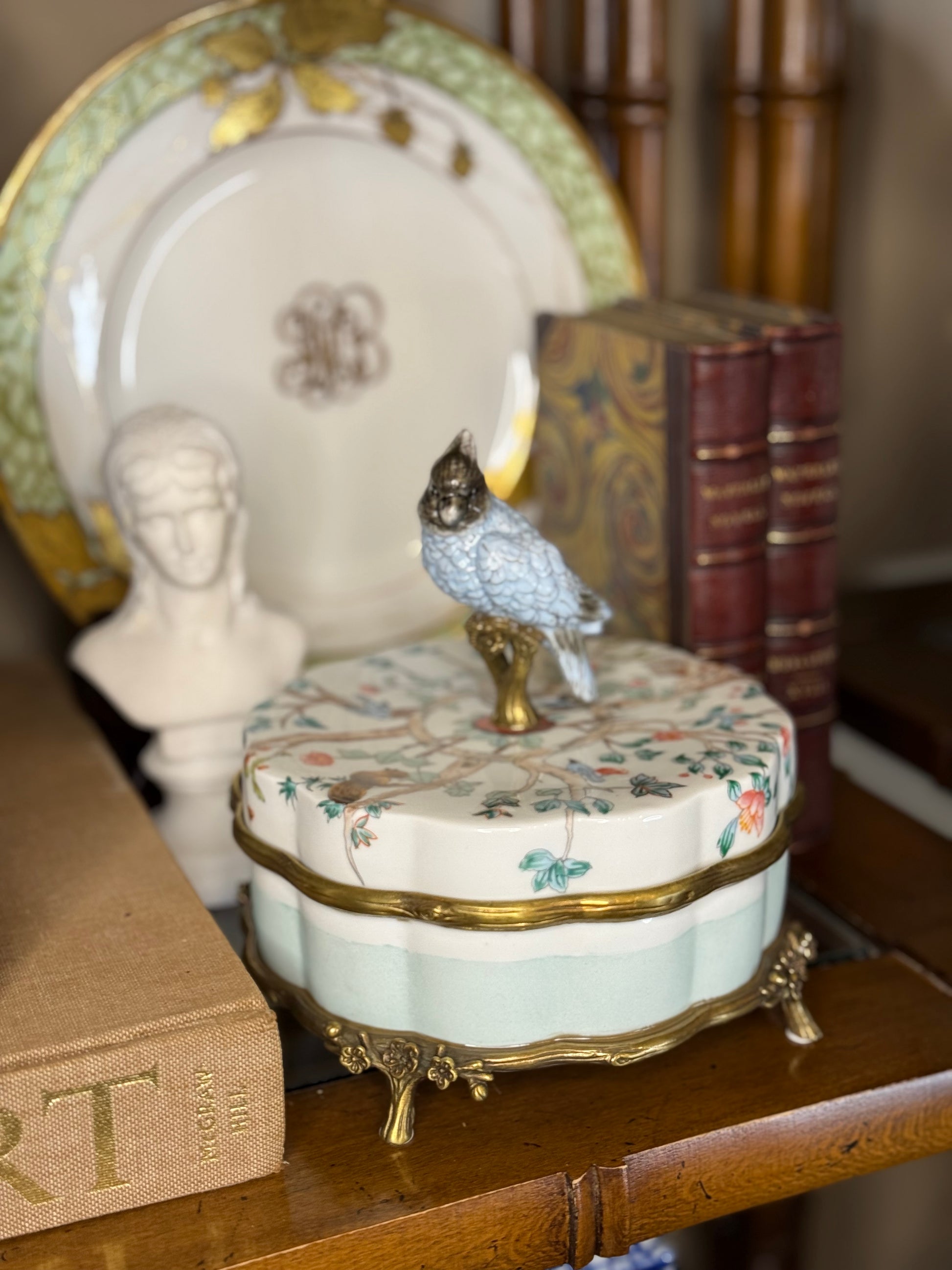 Danny’s Fine Porcelain | “Garden of Life” Porcelain Box with Bronze Ormolu & Bird Finial – 6”