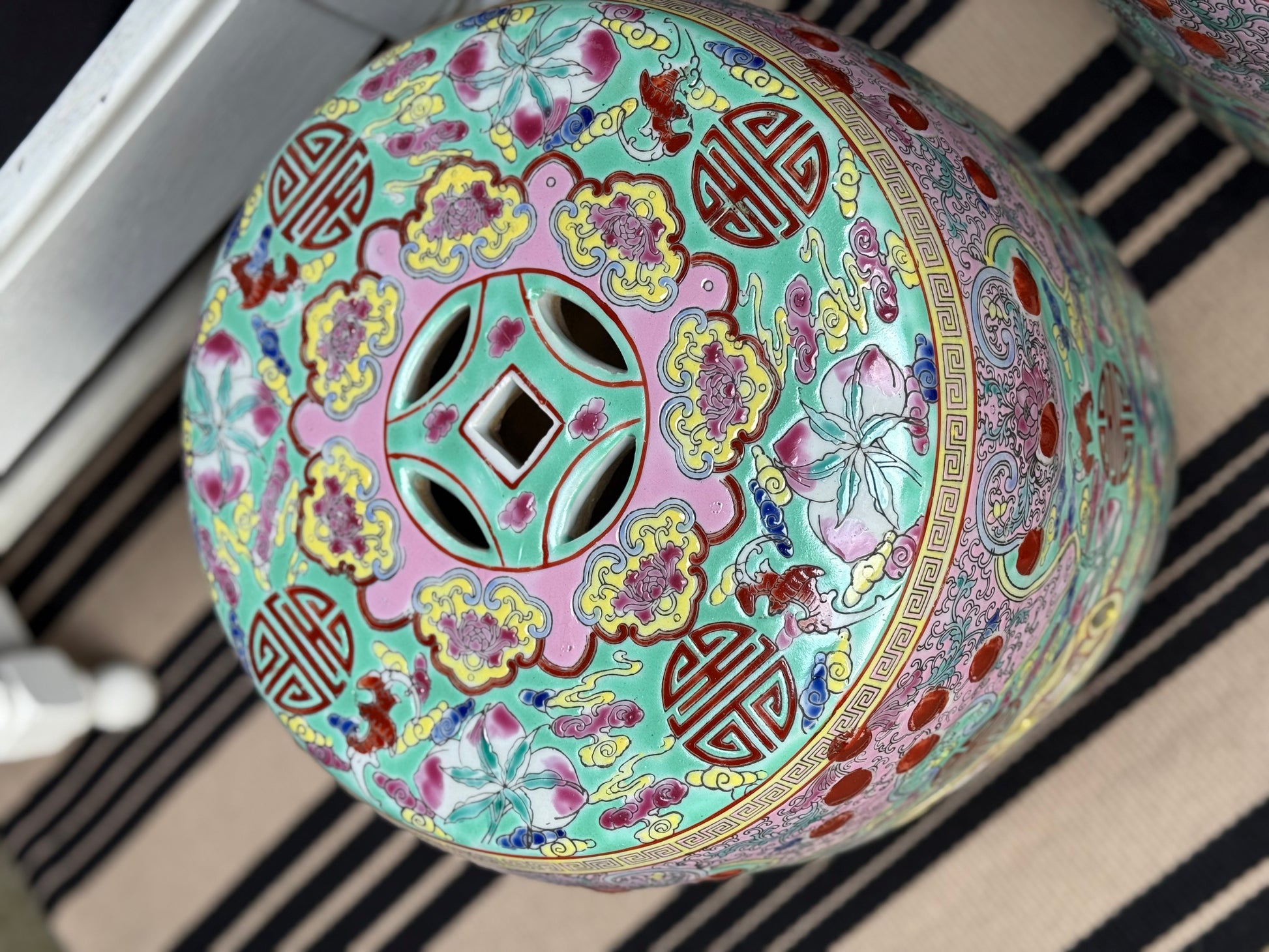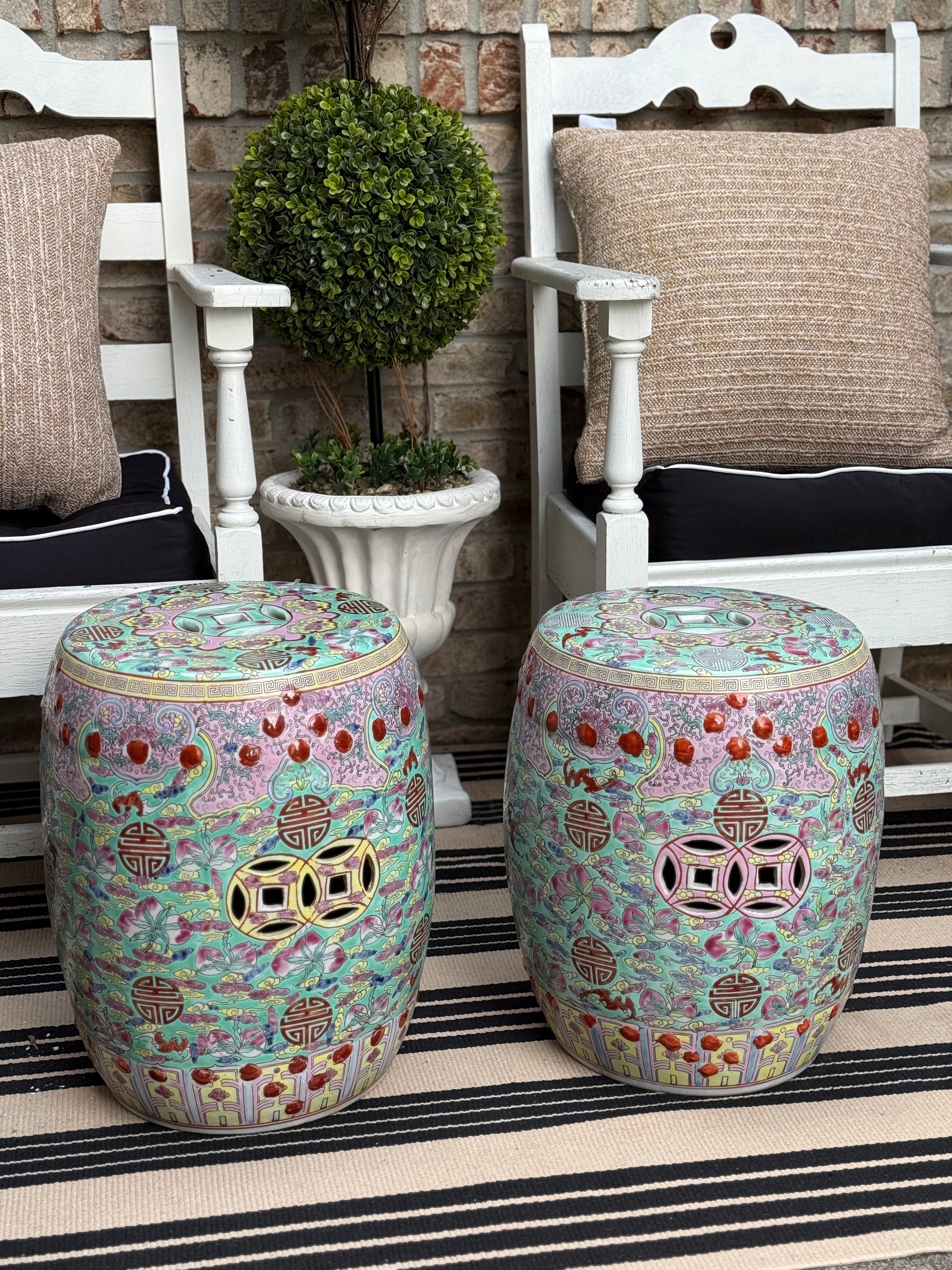 Bring a touch of timeless chinoiserie charm to your indoor or outdoor spaces with this exquisite porcelain garden stool. Hand-painted in a harmonious blend of soft green and peach tones, this piece is adorned with intricate floral motifs, auspicious Chinese symbols, and delicate scrolling details, highlighted by accents of deep red and gold.
