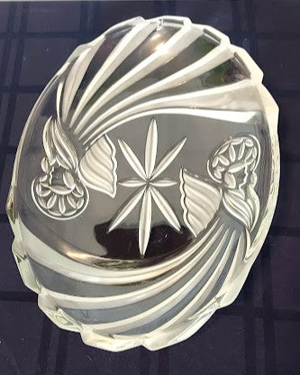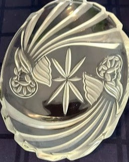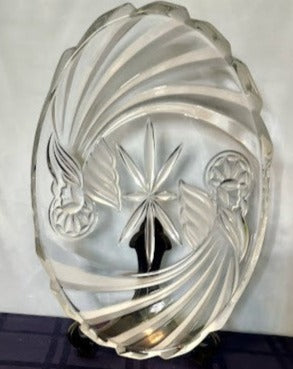This exquisite Gorham Holiday Traditions Angels of Peace Crystal oval serving platter is intricately frost etched for a timeless holiday look. Crafted from high-quality crystal, it measures 16.5”x11” and is 2" deep, making it ideal for serving dishes for a large group. Elevate your home décor for the holiday season with this exquisite and timeless piece.