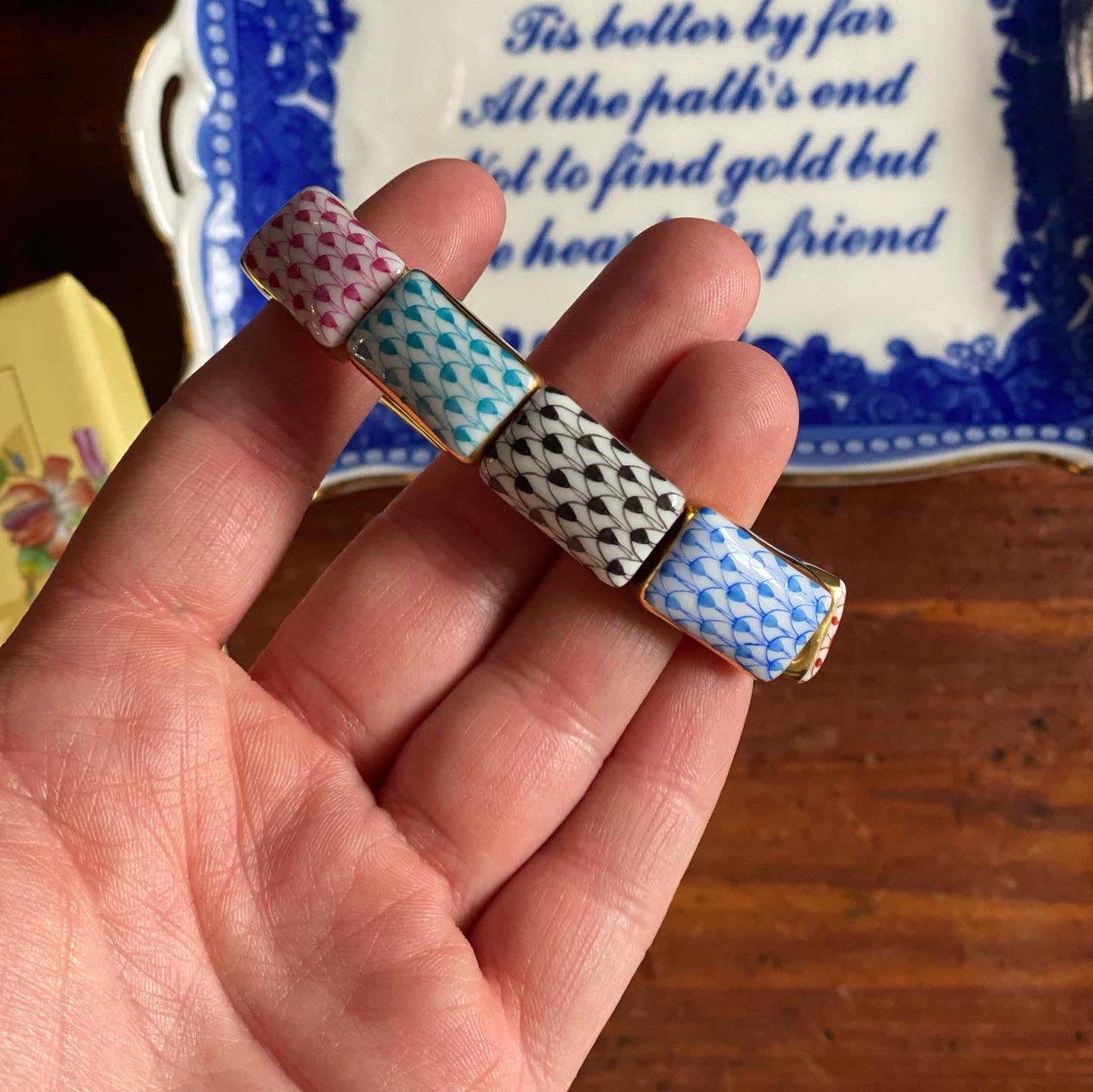 Made to order and shipping early NOVEMBER 2025, this exquisite Herend Fishnet Stretch Bracelet is a true statement piece, finished with luxurious 24K gold detailing. The base price includes a 9-link design, measuring approximately 3" around when relaxed, with a comfortable stretch fit for easy wear.