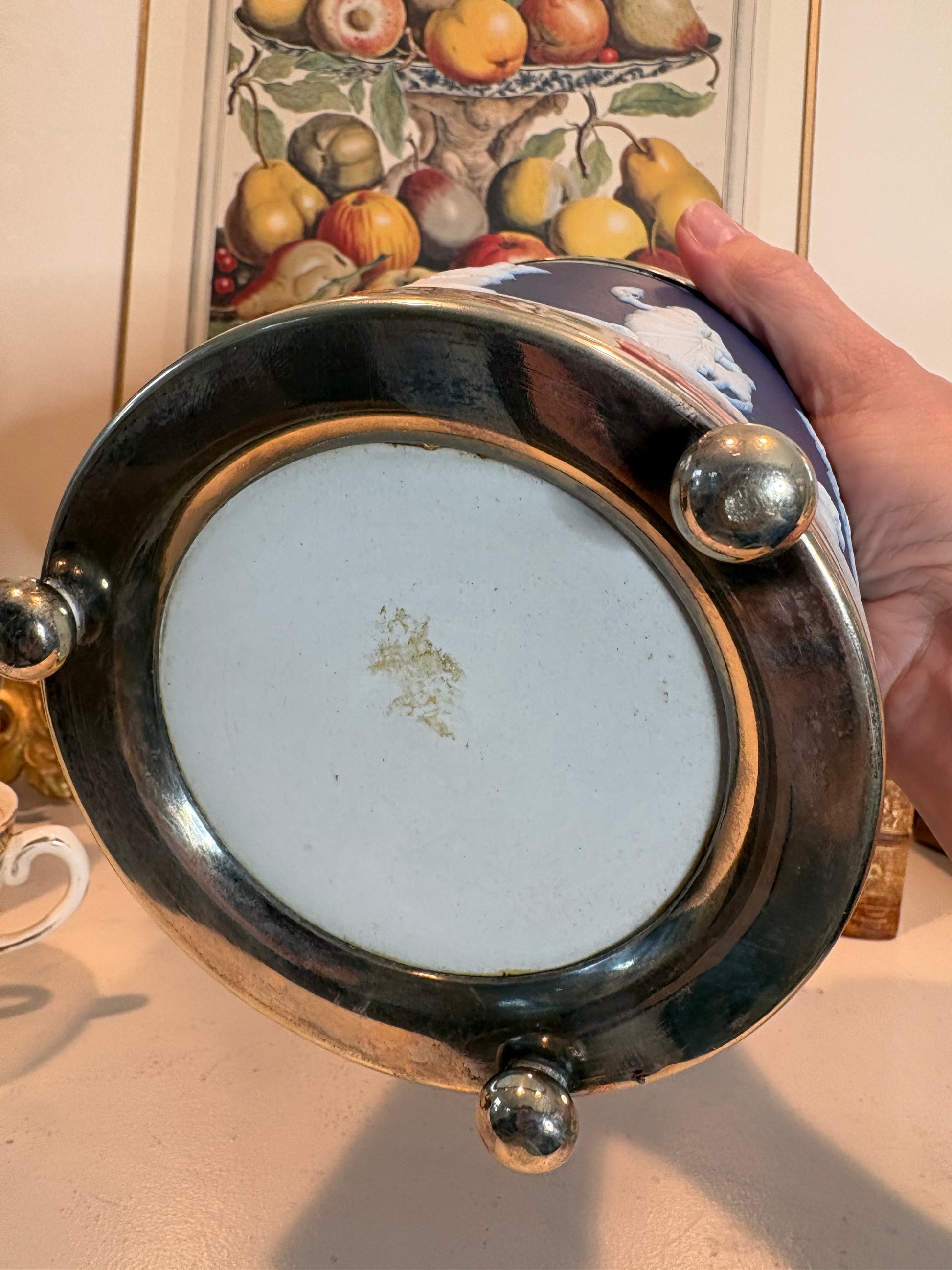 Antique Jasperware Cobalt Blue Dip Biscuit Jar W/ Silverplate Mounts