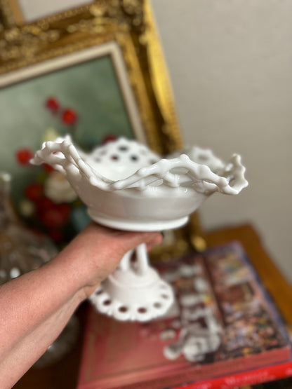 Vintage Westmoreland White Milk Glass Pedestal Compote with Ruffled Lace Edge
