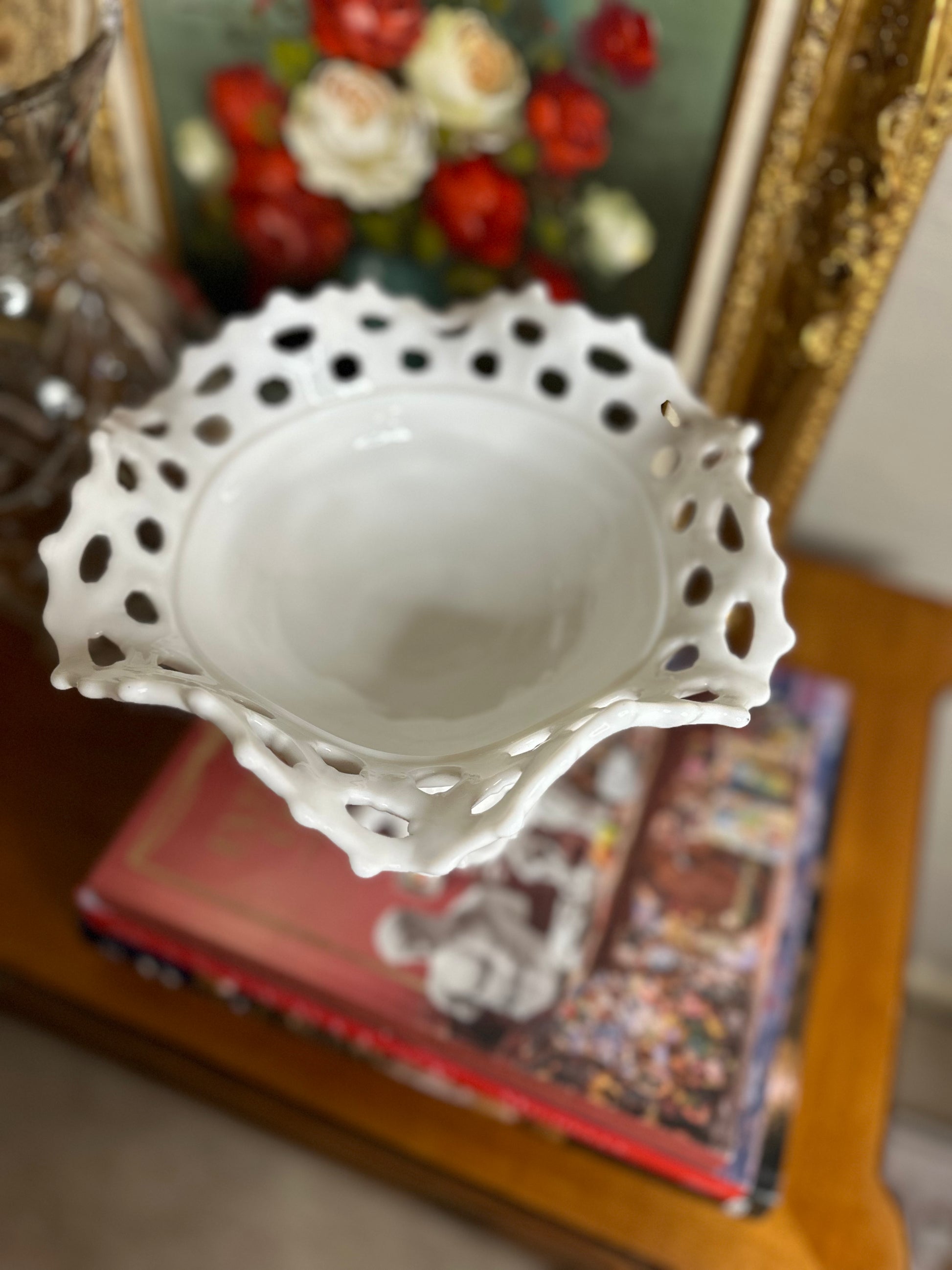 This is a gorgeous Westmoreland white milk glass pedestal compote/fruit bowl in very good vintage condition. It has an open lace design along the beautiful ruffled edge and is a hefty piece that makes a statement. This would look stunning on a shelf mixed in with blue and white pieces, on a table top with carpet balls or greenery, or in the kitchen to hold fruit. There are no chips, but there are a few small surface scratches commensurate with age and a tiny hairline crack in the top of the bowl. None of these imperfections are noticeable unless looked at under a very strong light and do no detract from it's overall appearance. Price has been adjusted according to condition and is less than most comps. It measures 7 5/8" tall, 9 1/2" wide top, and 4 1/4" wide base.