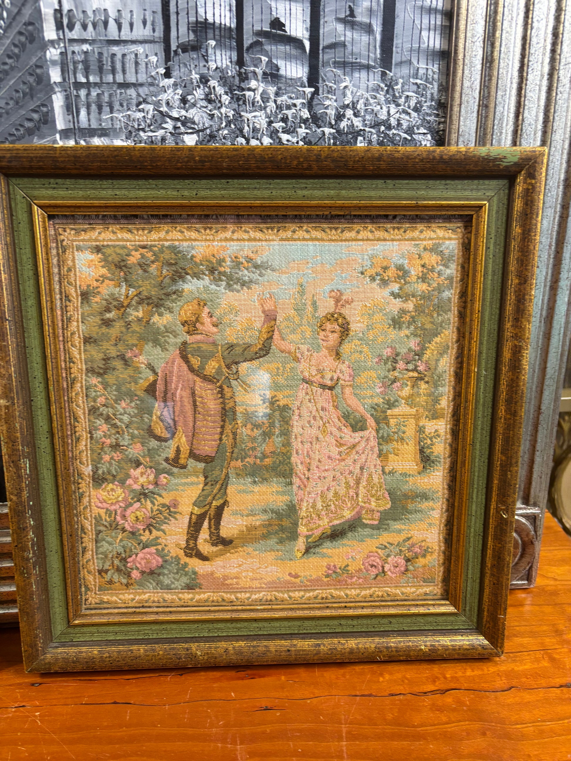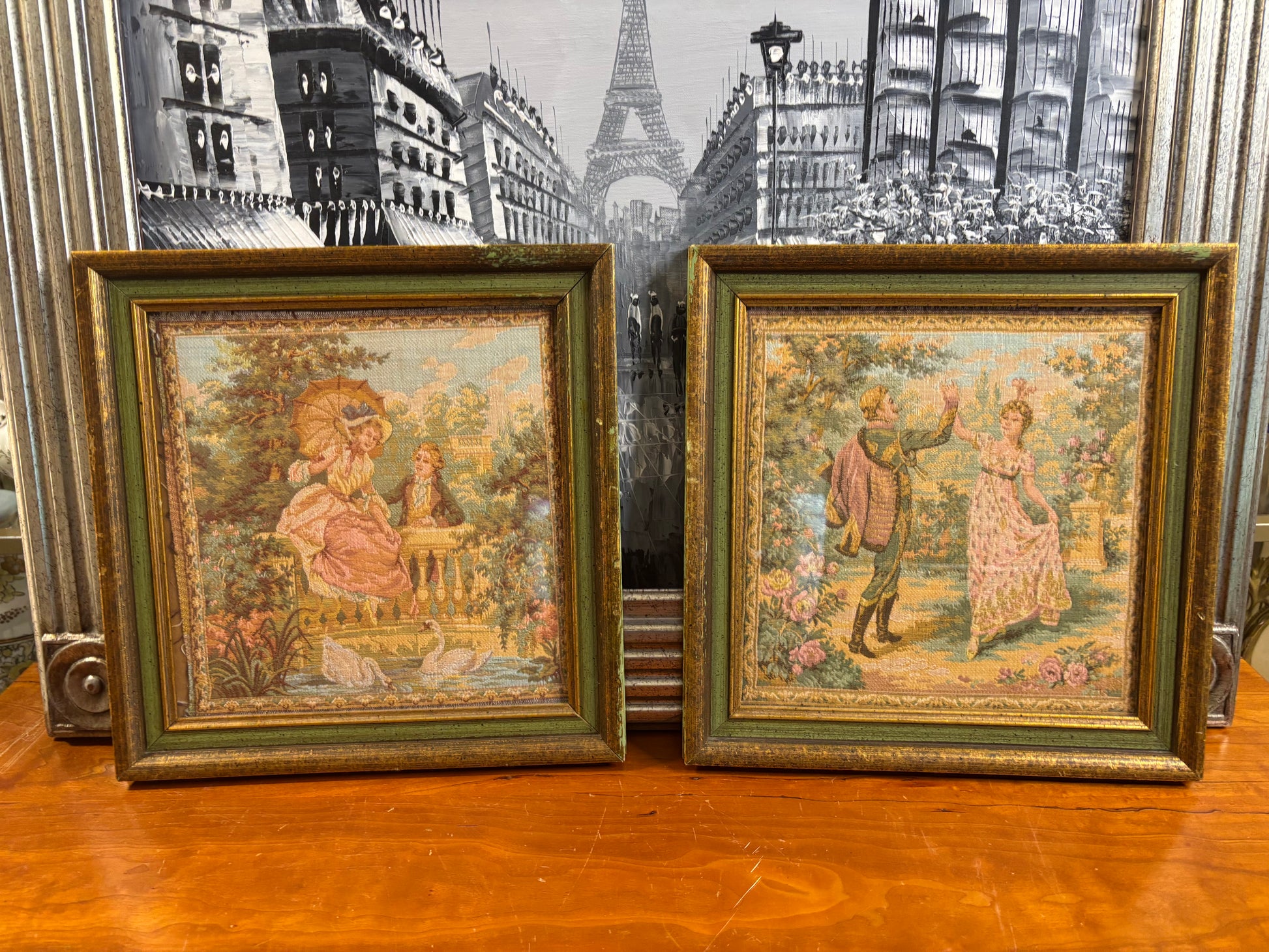 Stunning Paris Tapestries Art framed pair! In beautiful condition! One does show thread of tapestry on side. Each measures 12.5” x 12.5”.