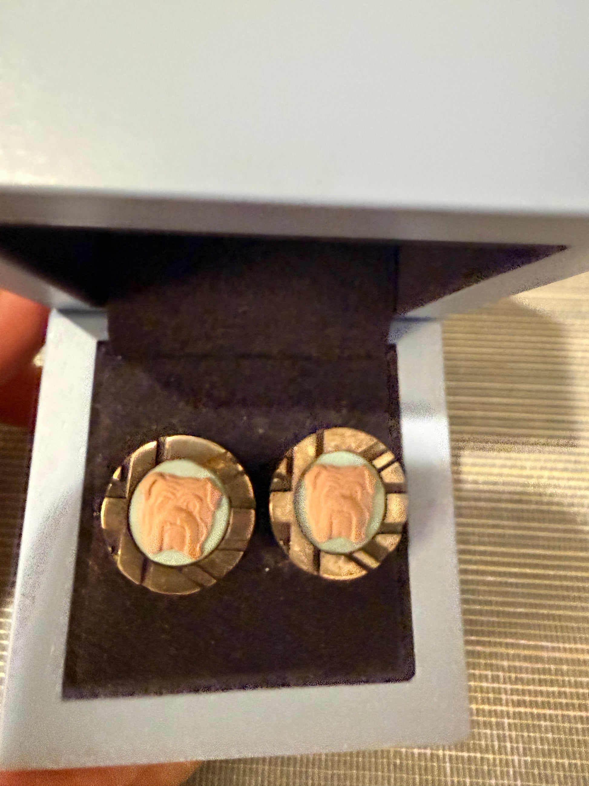 Vintage designer cufflinks created by renowned British jeweler Stephen Webster in collaboration with Wedgwood. These striking cufflinks feature classic Wedgwood jasperware plaques in a soft sage green, each centered with a raised bulldog motif in contrasting terracotta — a bold and distinctly British design.