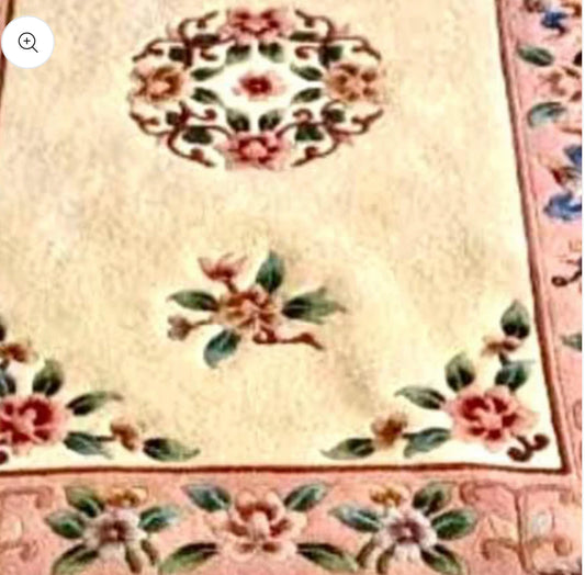 Pink Vintage chinoiserie wool fretwork floral rug.