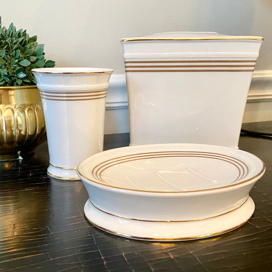 Chic 3 piece set bath accessories in white & gold by designer Veratex