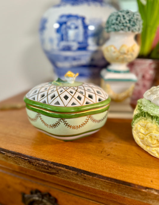 Vintage Pierced Porcelain Lidded Box with Floral Finial and Gilt Swag Details, 5"