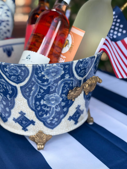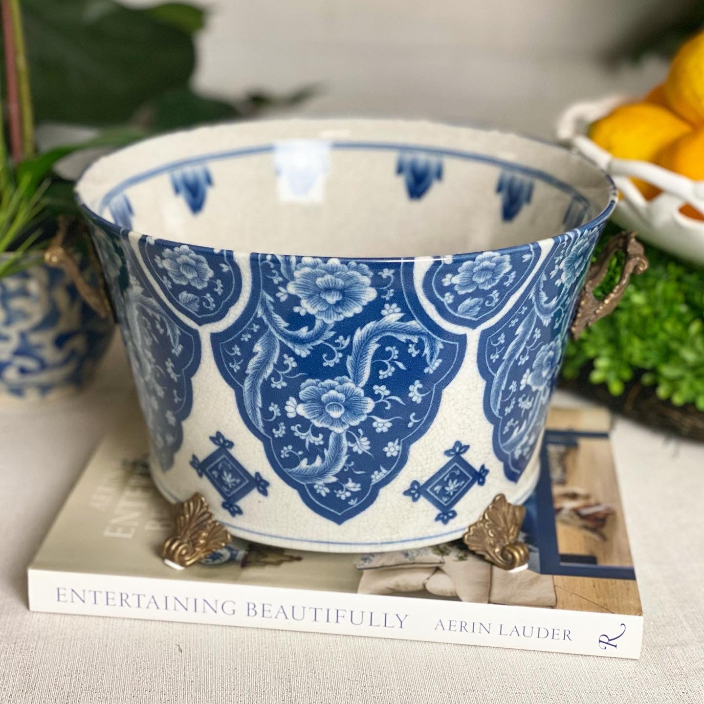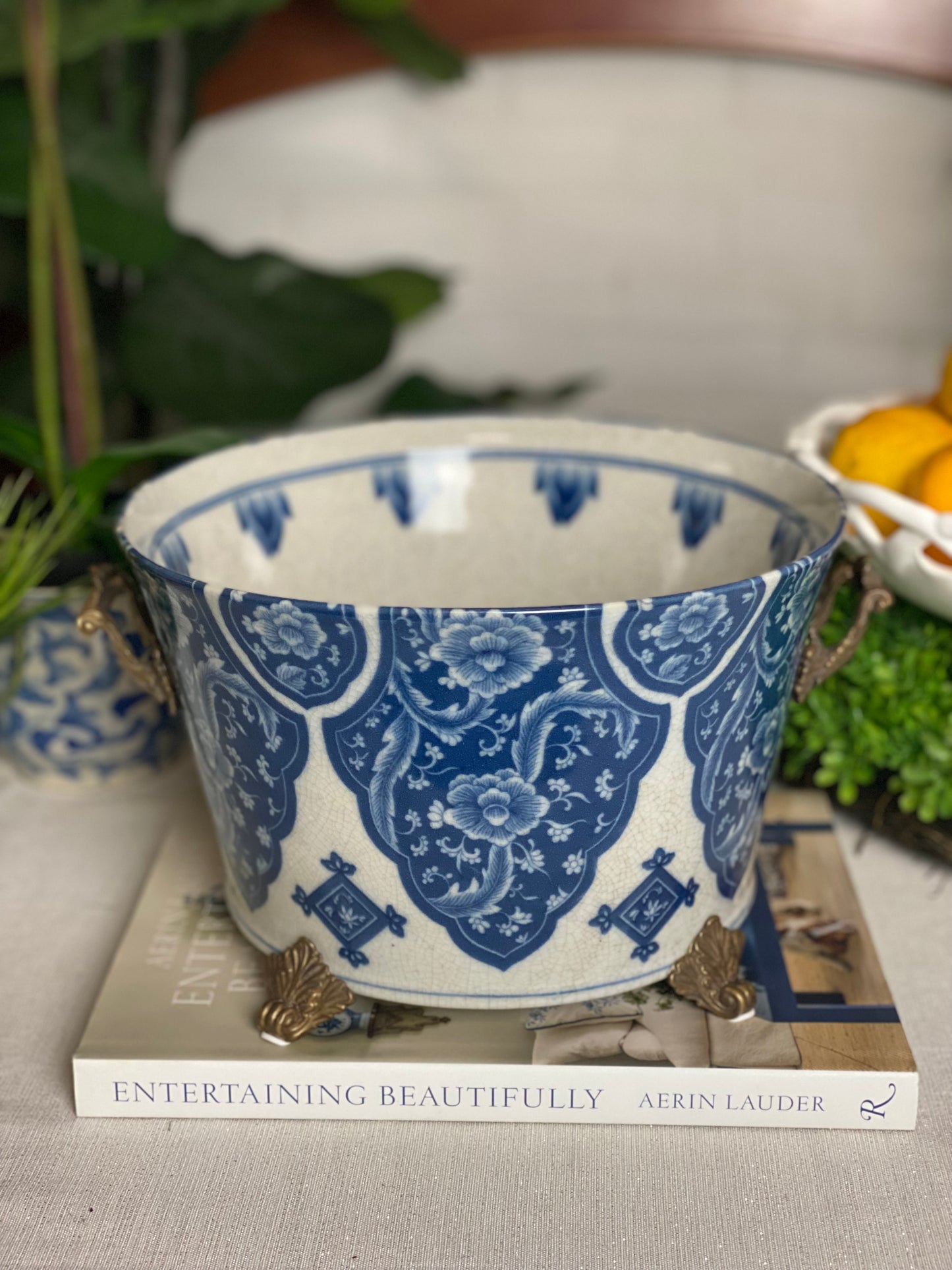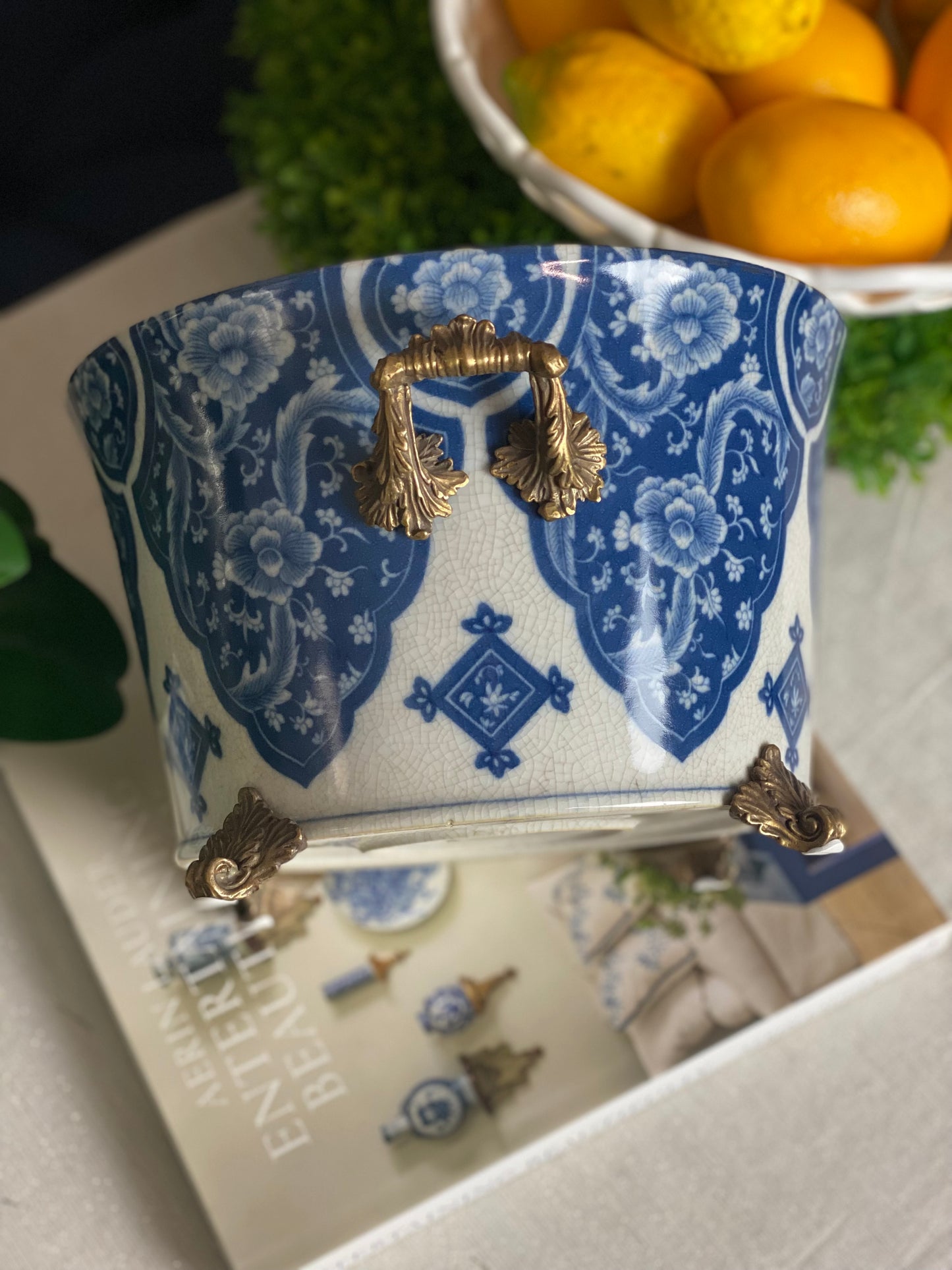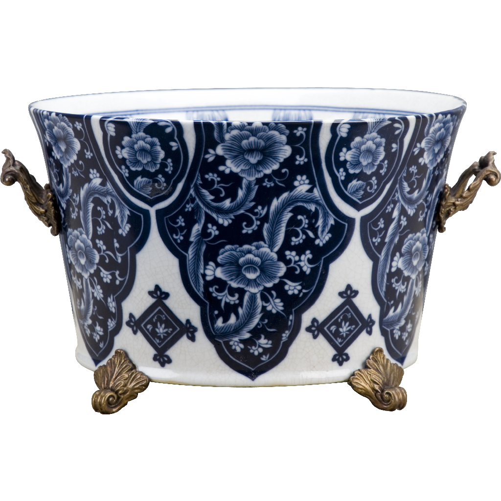 Danny's Fine Porcelain - 12L X 10.5W X 7H Porcelain Bowl Planter in Blue & White W/ intricate bronze handles
