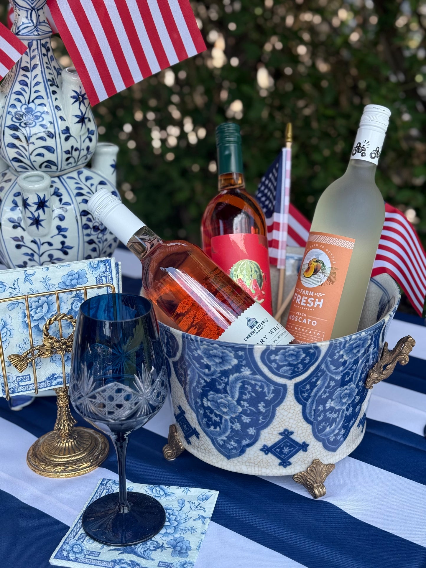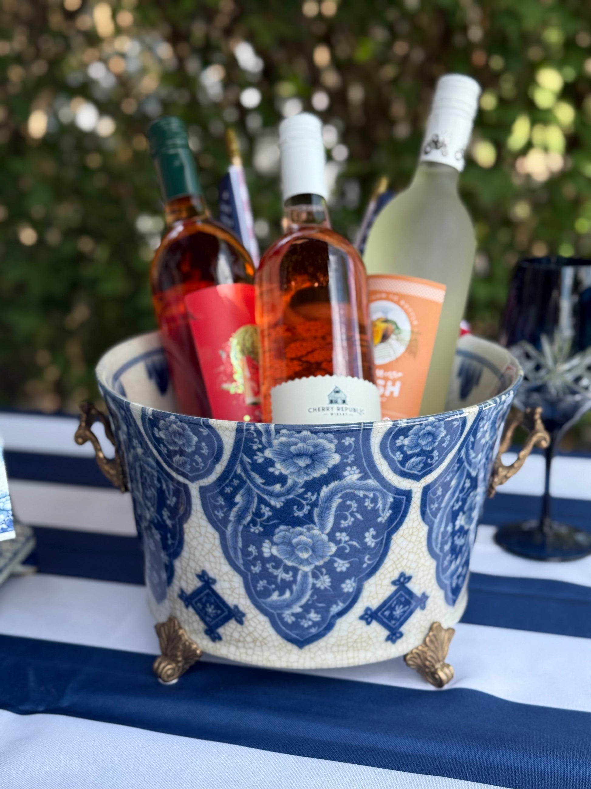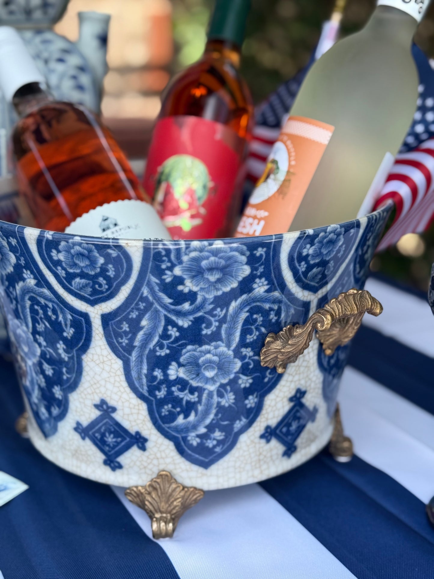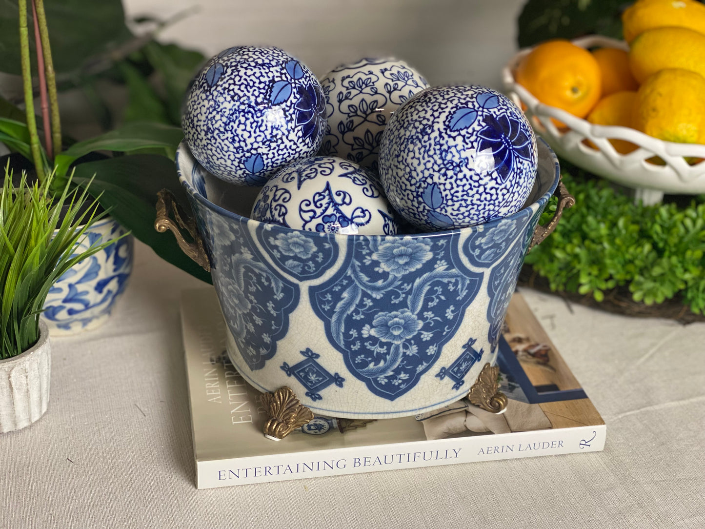 Danny's Fine Porcelain - 12L X 10.5W X 7H Porcelain Bowl Planter in Blue & White W/ intricate bronze handles