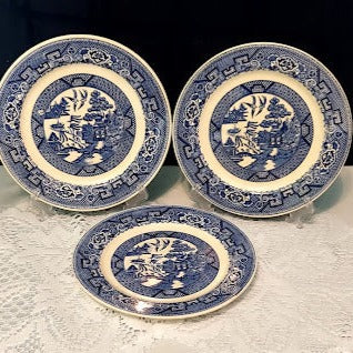 Enhance your collection with these three 8 1/4" Vintage Blue Willow Homer Laughlin plates. Enjoy the classic pattern and craftsmanship, with some noticeable age-related crazing for extra charm.