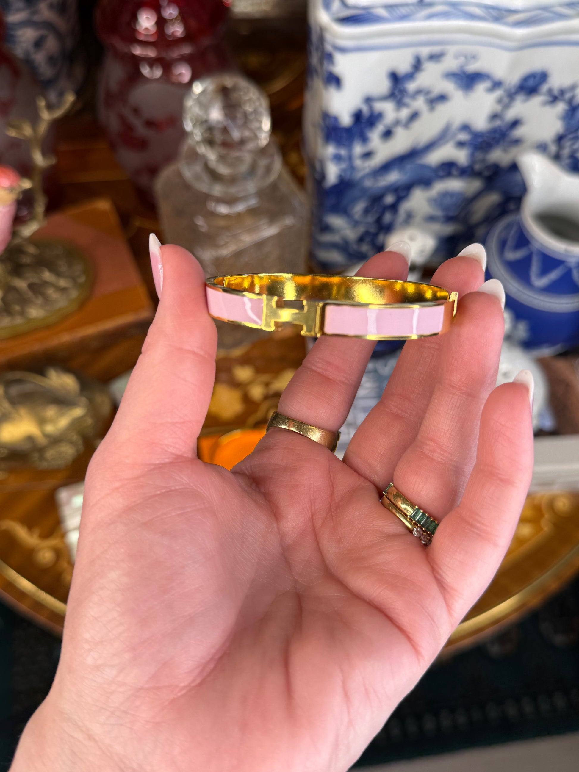 This classic hinged bangle features a timeless “H” motif accented with rich turquoise enamel and warm gold-tone detailing. Sleek, structured, and effortlessly chic, this bracelet is a versatile staple that transitions seamlessly from everyday wear to evening styling.