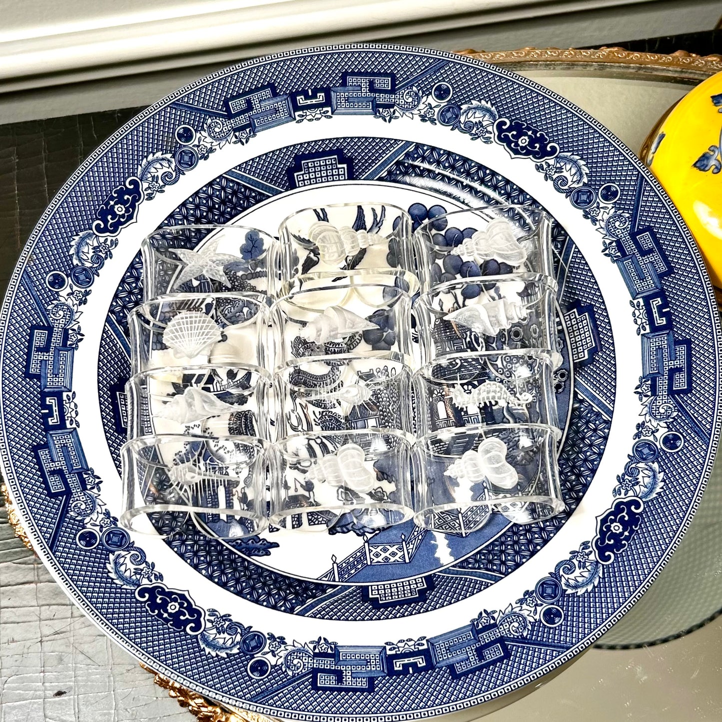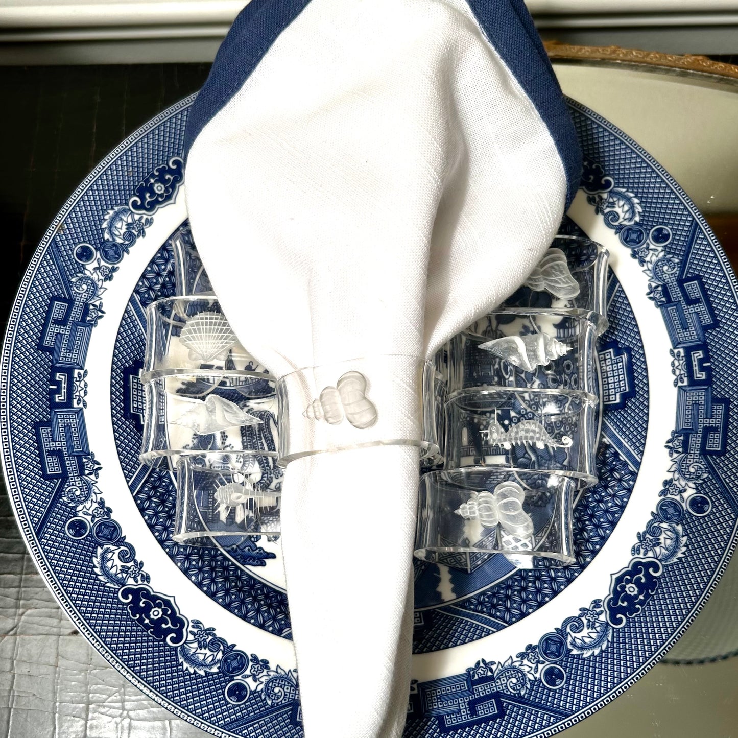 Coastal chic set of 12 lucite acrylic sea shell napkin ring holders