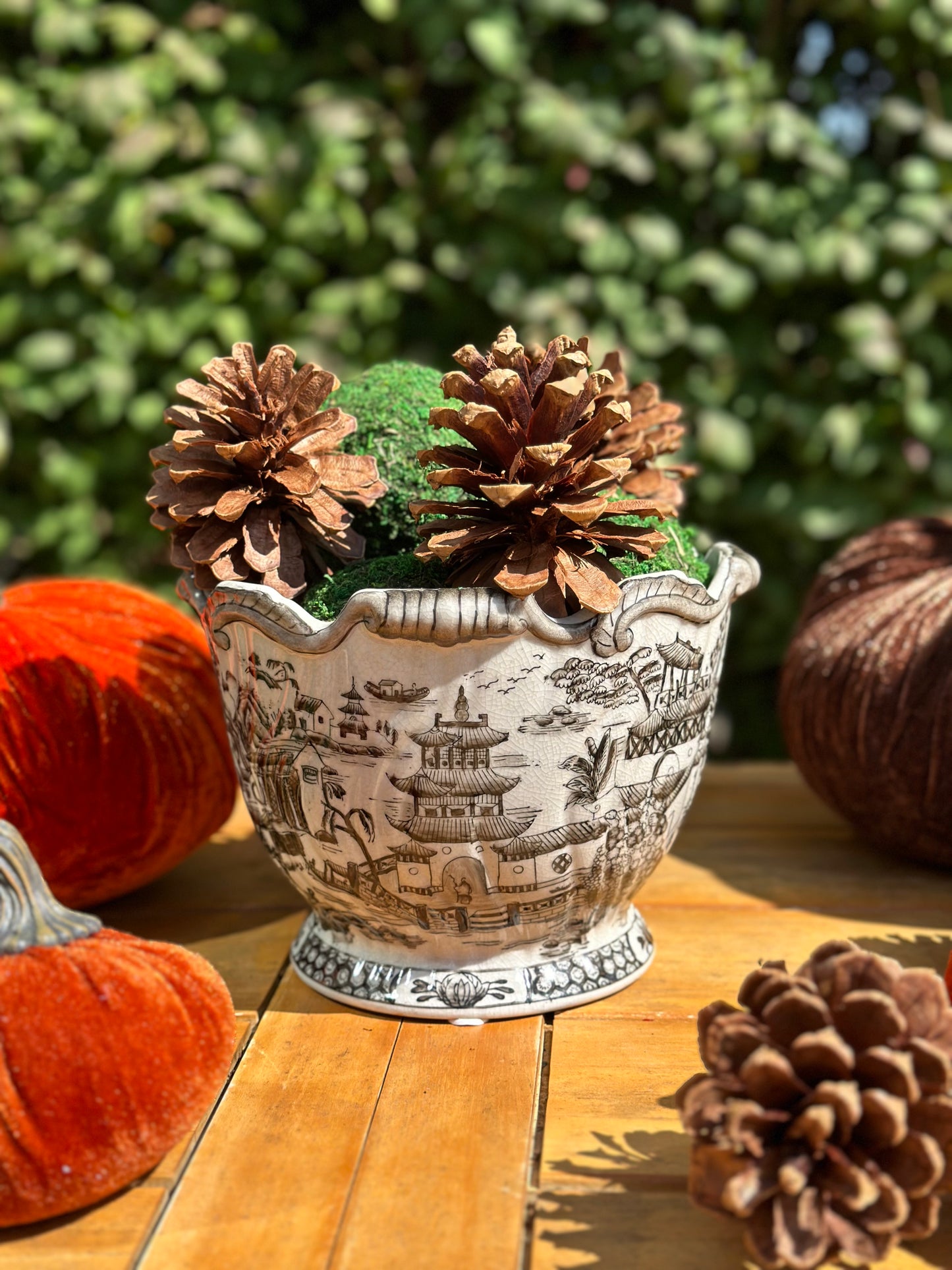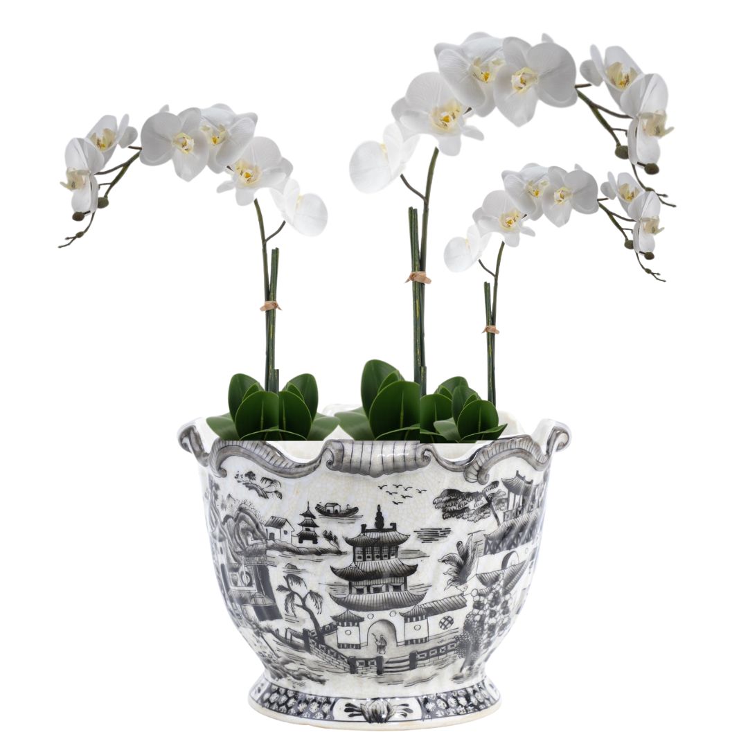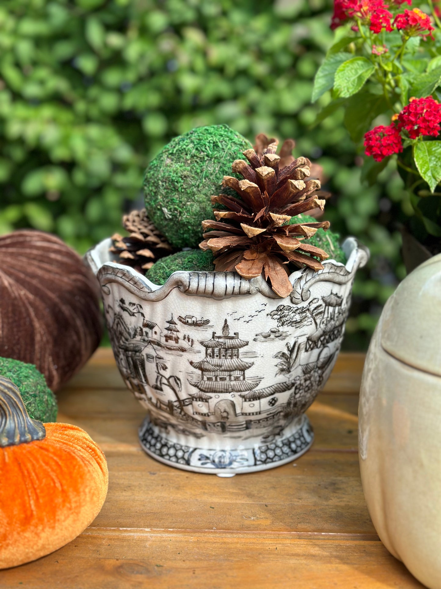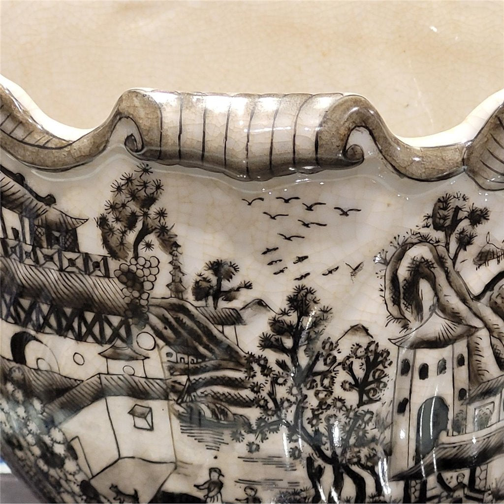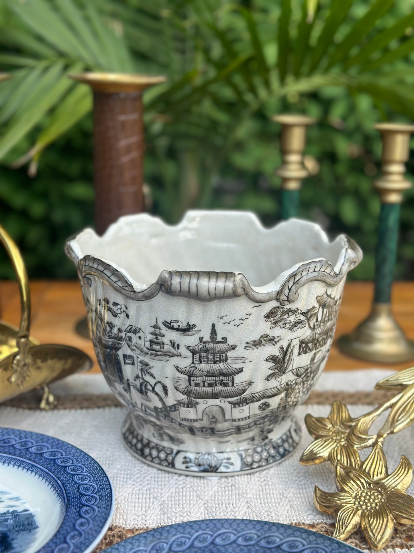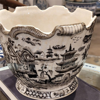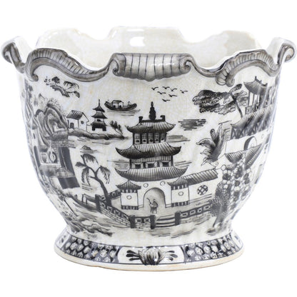 Hand painted Black & White Pagoda Porcelain Cachepot, 8L X 8W X 6H