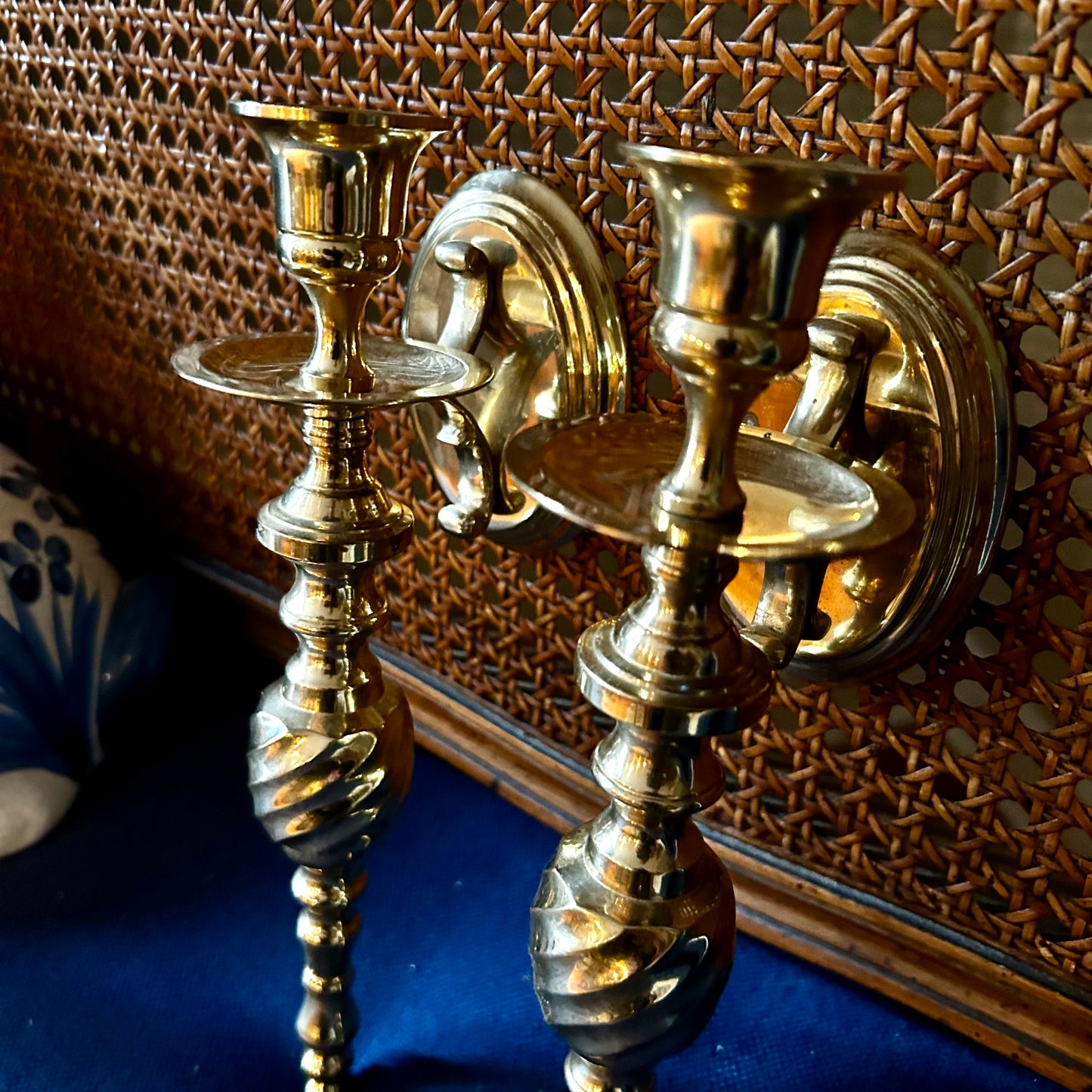 - Pair of vintage brass shiny patina candle holder swirl wall sconces