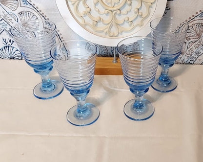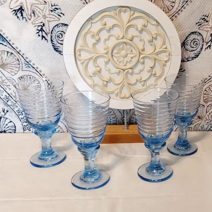 Experience the luxurious design of Libbey's Blue Rock Sharpe Sirruis goblets. These vintage ice blue beauties boast a ribbed texture and a mouth of 3 3/4 inches wide, reaching a total height of 7 inches. Enjoy your favorite drinks with the exclusive set of 4.
