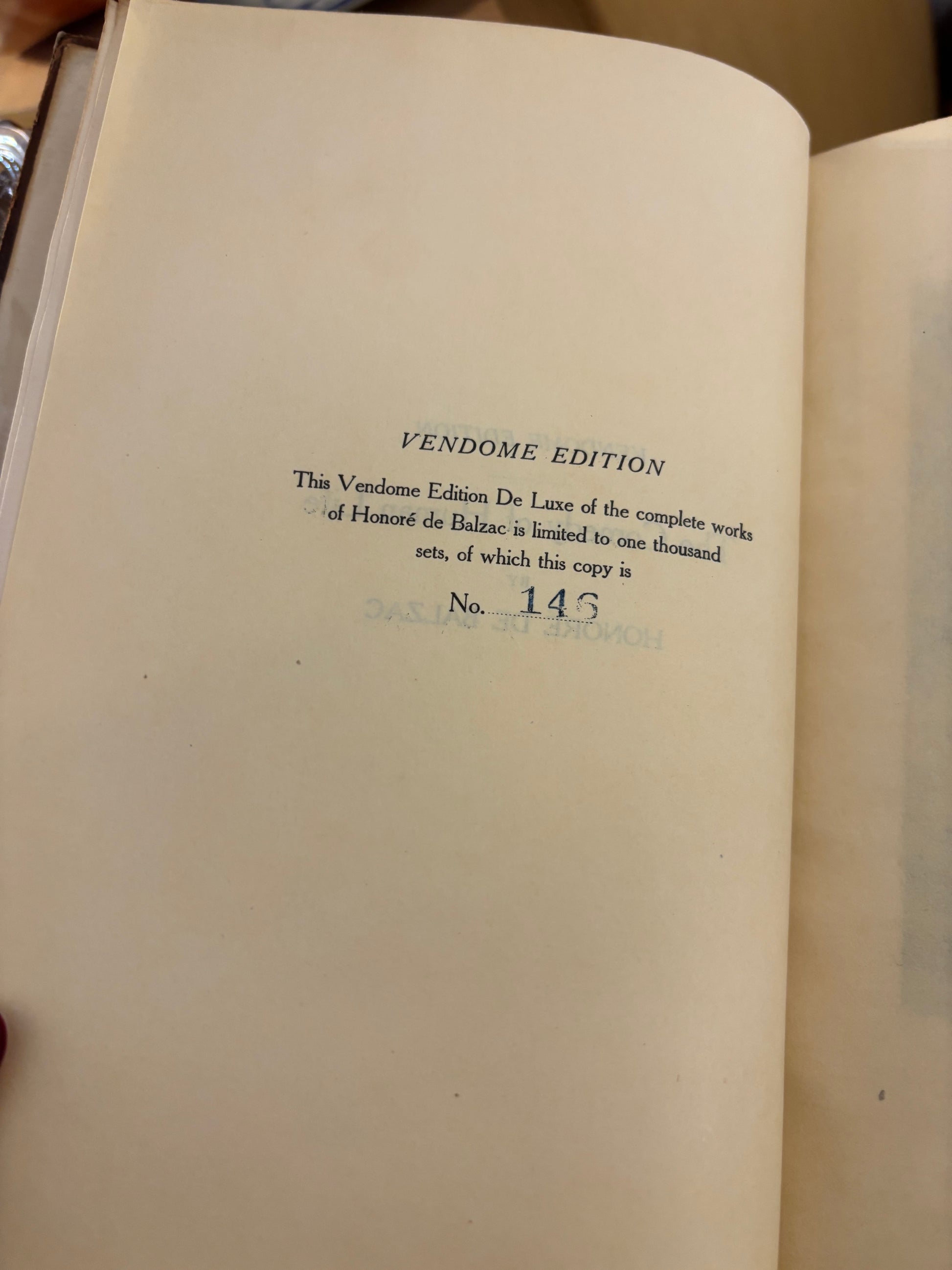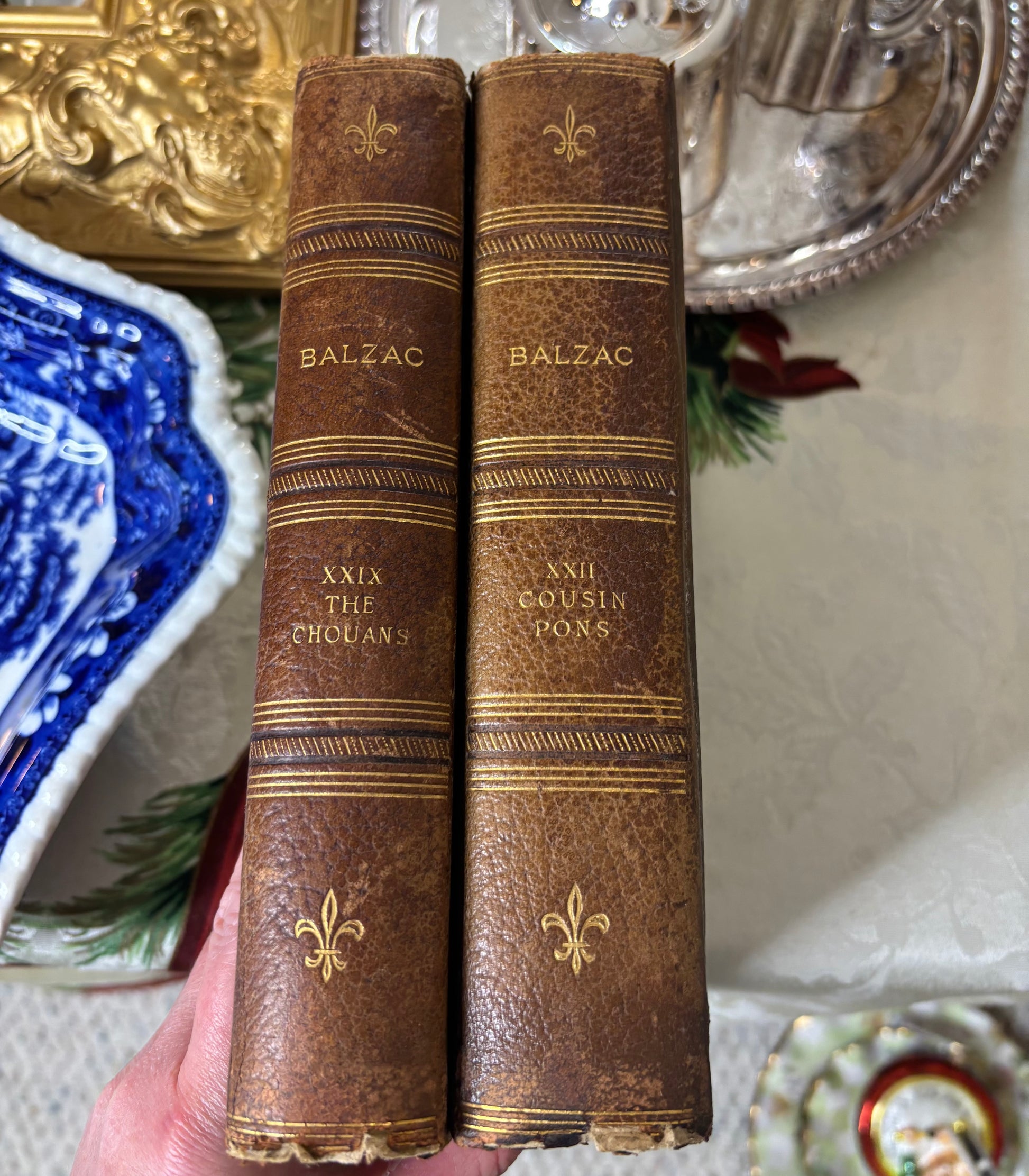 Stunning antique leather-bound volumes of the works of Honoré de Balzac, specifically Volume XXII, Cousin Pons, and Volume XXIX, The Chouans!