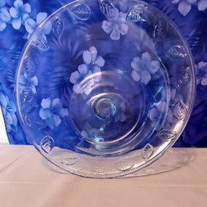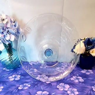 Add a splash of vintage elegance to your home with this stunning Ice Blue Pedestal Dish. It features delicately embossed leaves around its rim and base, and is in perfect condition with no cracks, chips, or repairs. This gorgeous compote/pedestal bowl stands 7" tall and is 11" wide, with a base of 5". Give your decor a timeless upgrade!