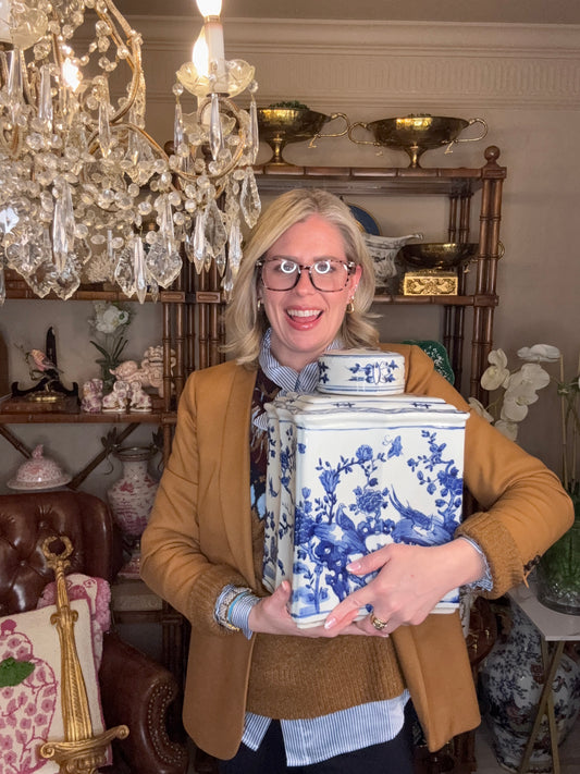 Danny’s Fine Porcelain | Rectangular Blue & White Porcelain Tea Jar with Landscape Scene, 10.5” L x 7.5” W x 14.75” H