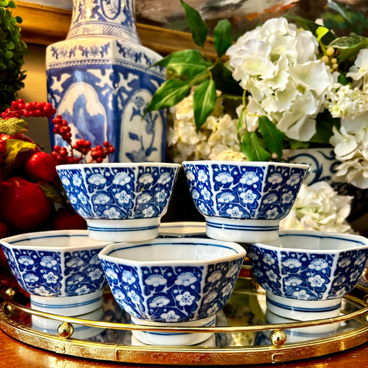Sets of 3 vintage Chinoiserie blue and white carpet balls in
