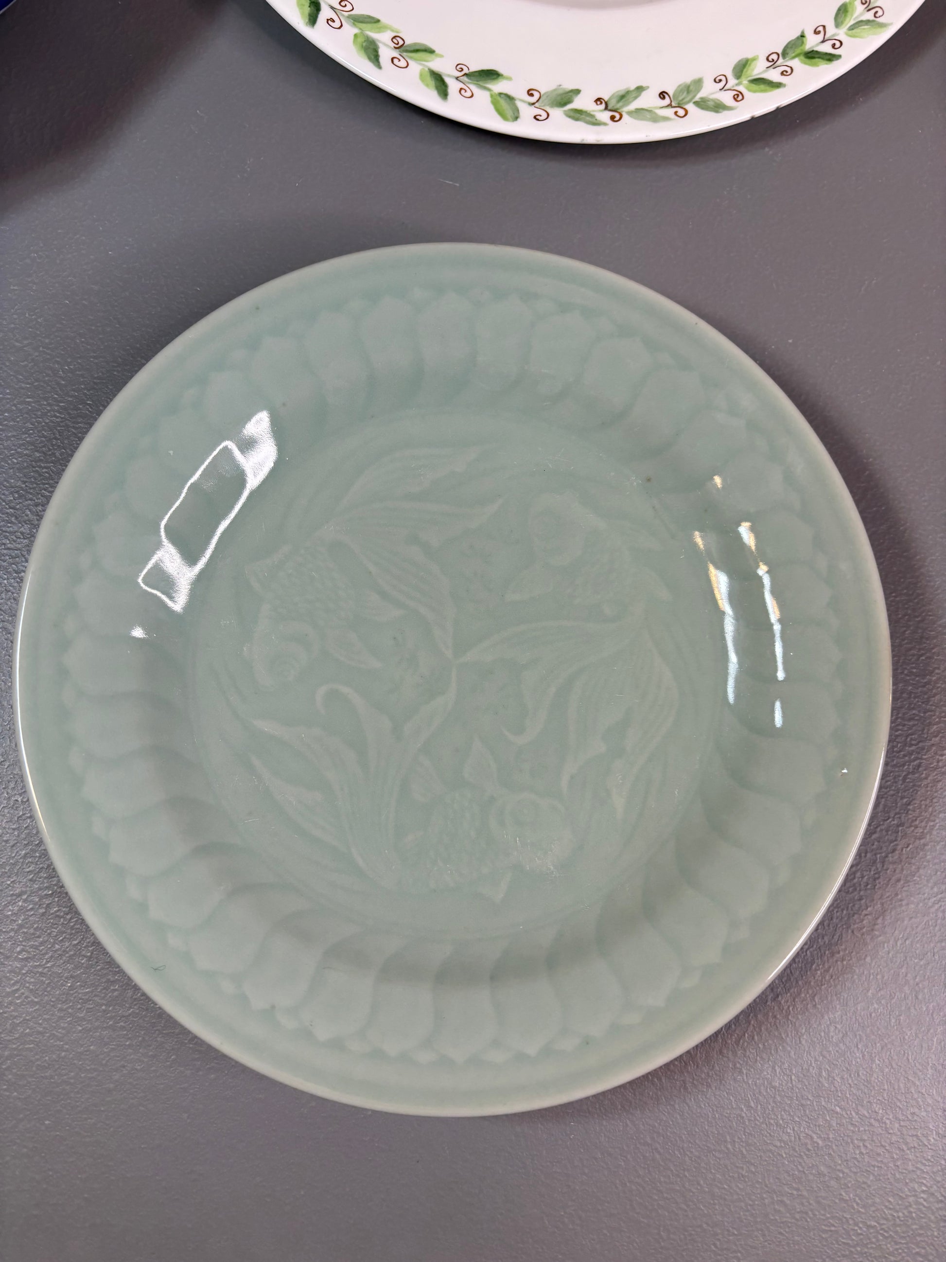 Beautiful celadon plate featuring koi fish!