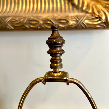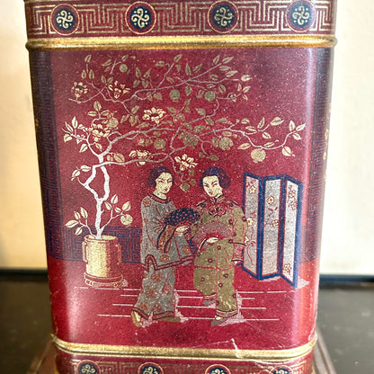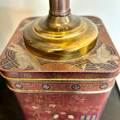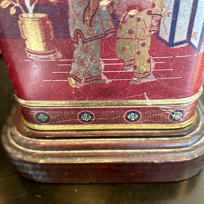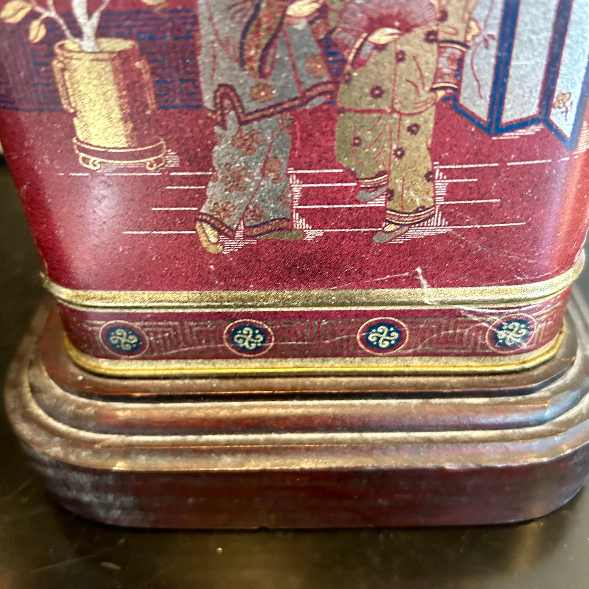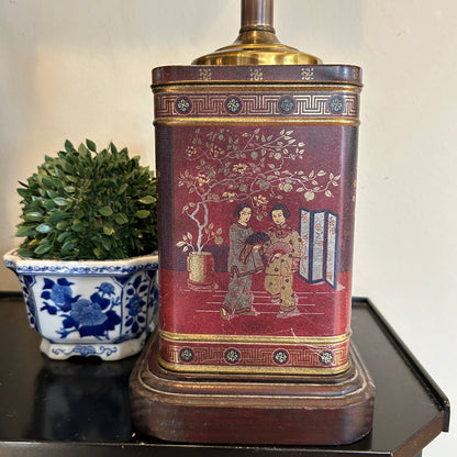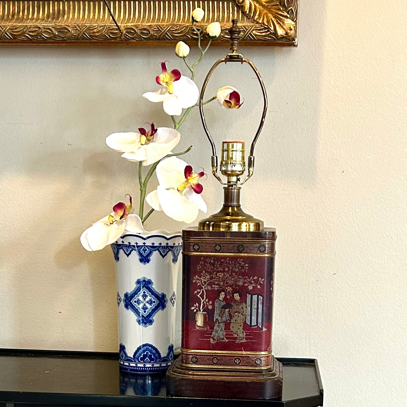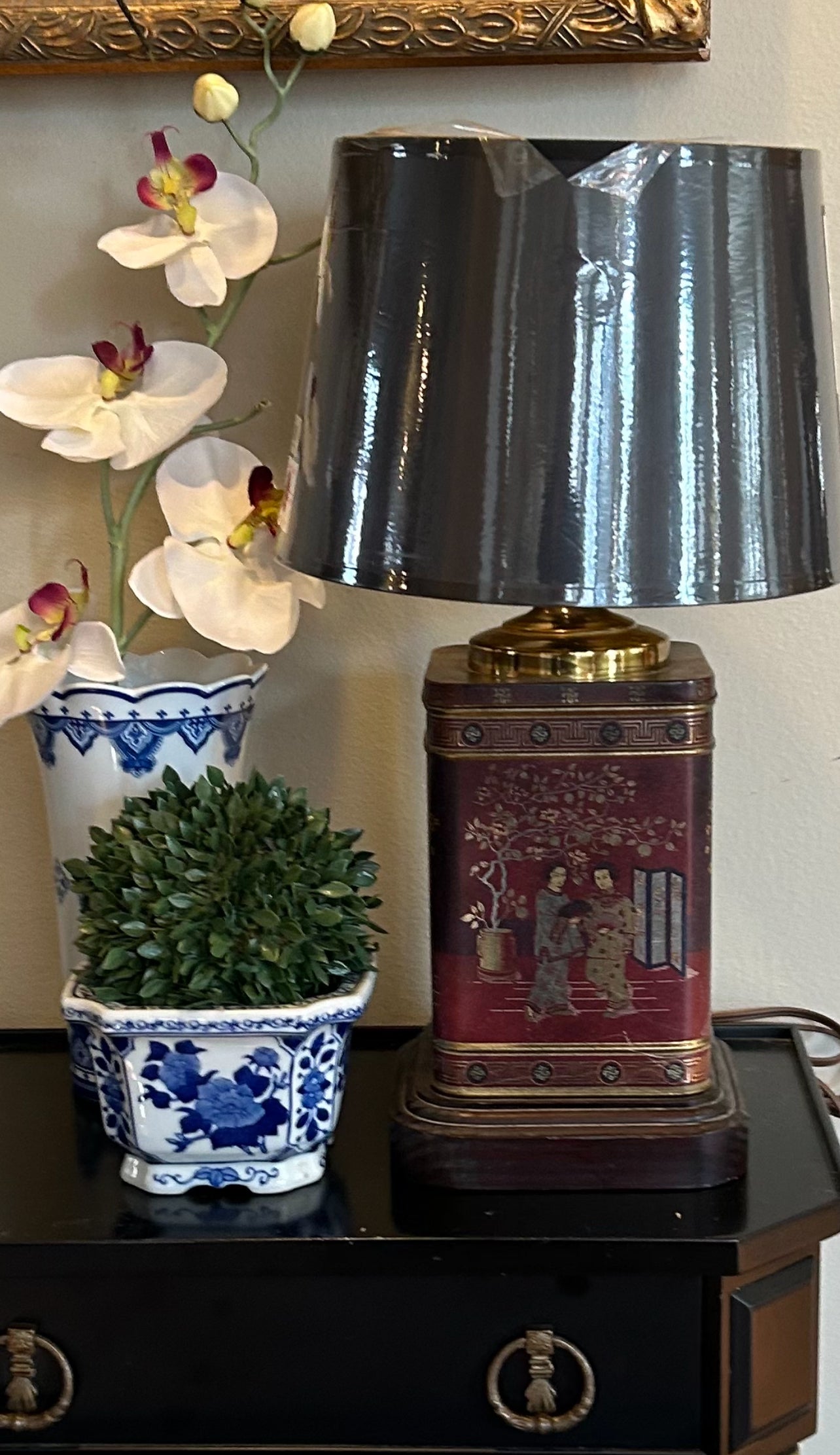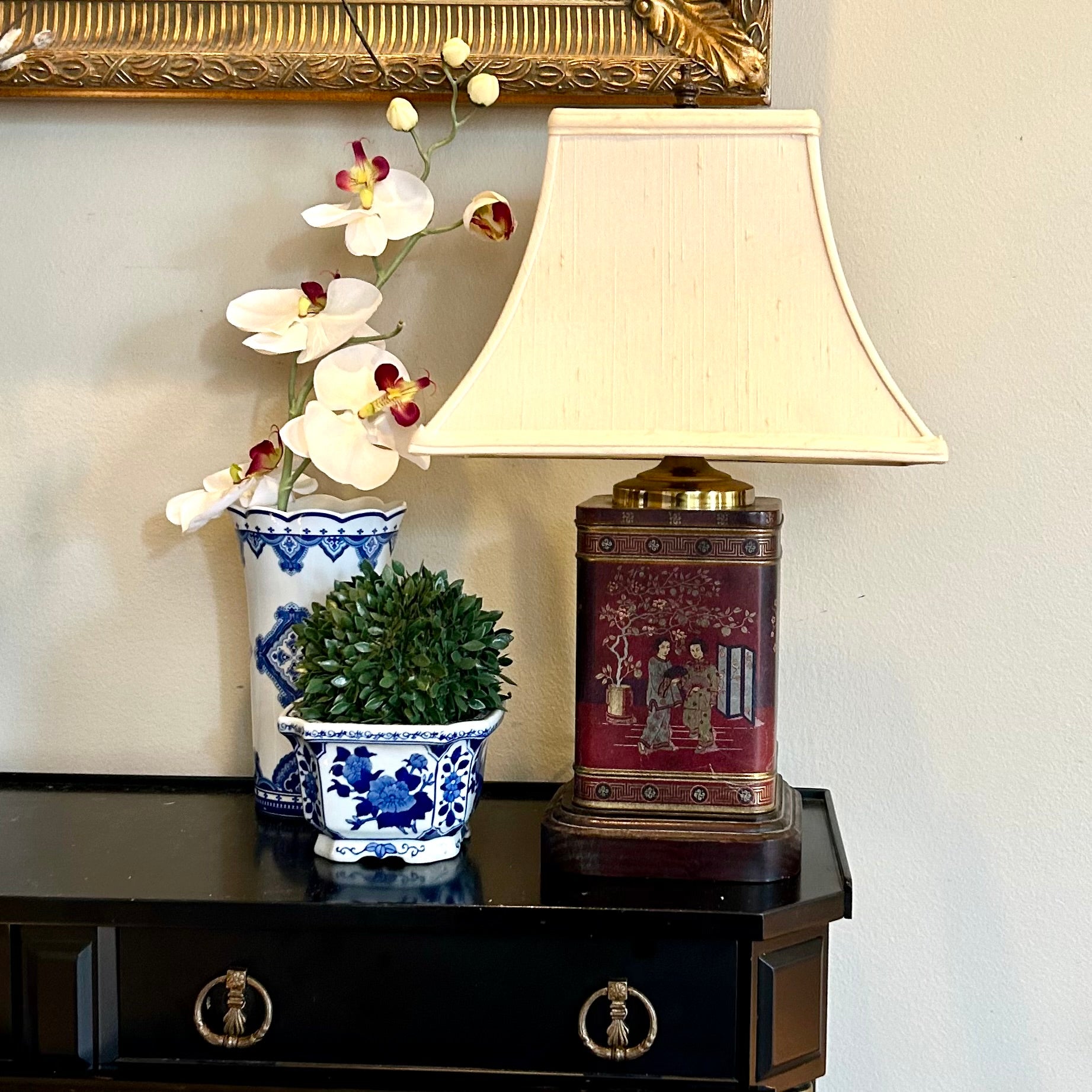 Experience the timeless elegance of the Vintage tole metal chinoiserie lamp. This stunning piece features a beautiful ivory shade and a sturdy wood base, standing at 17 inches high.
