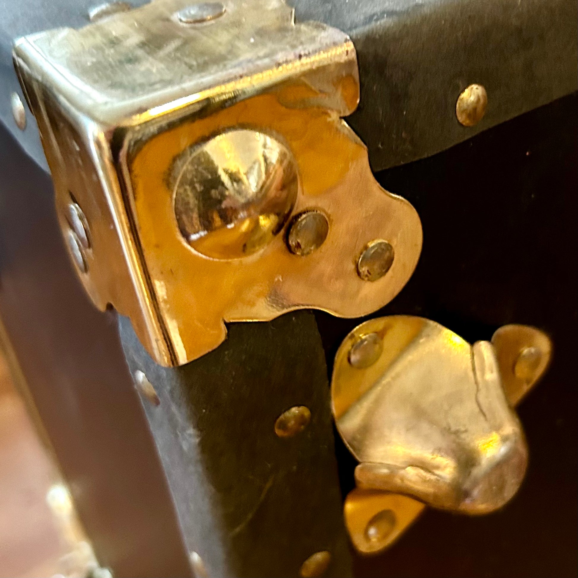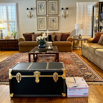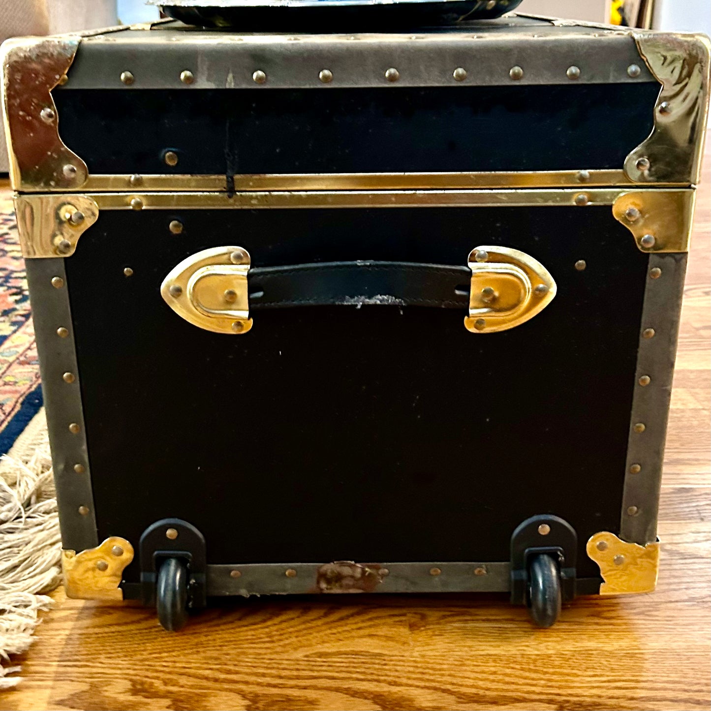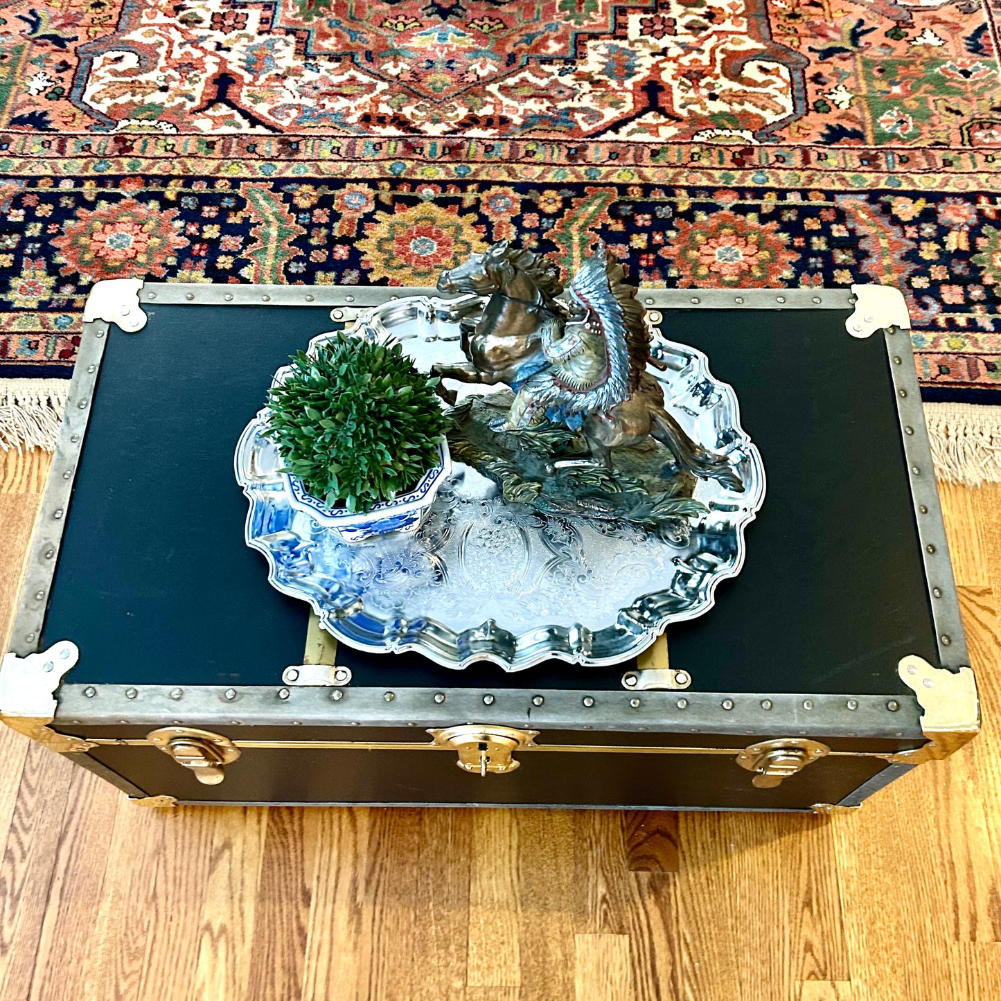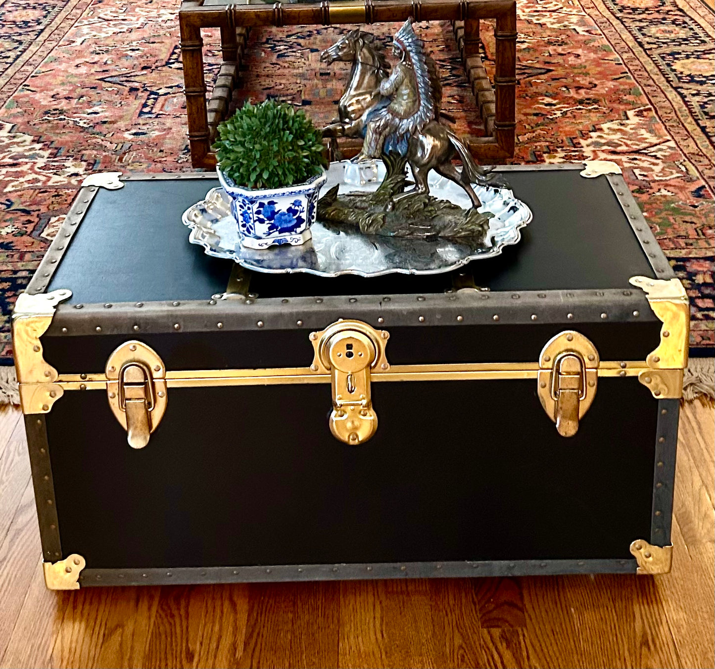 Handsome vintage ebony black, Brass & leather storage trunk w handles steamer trunk coffee table .