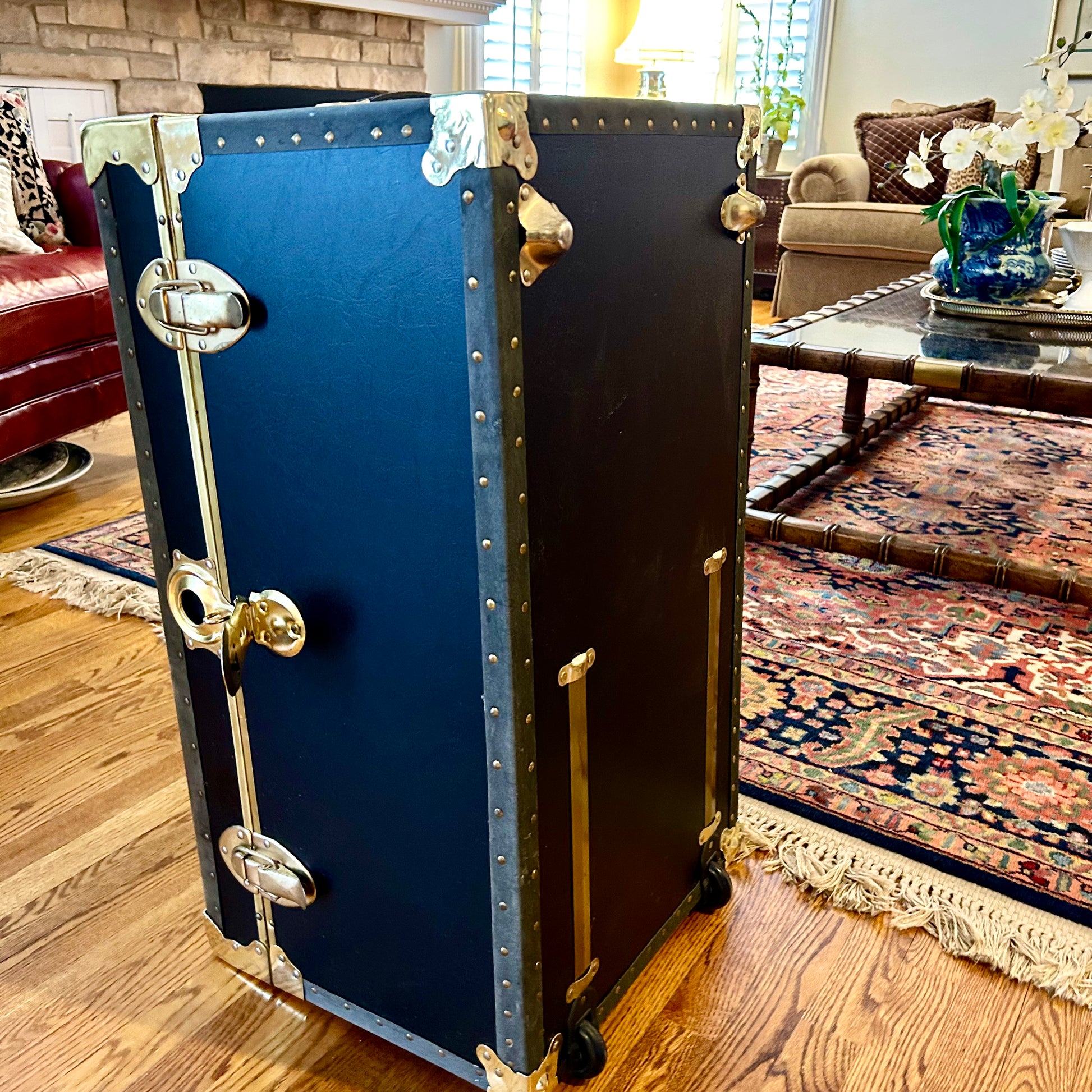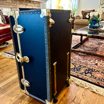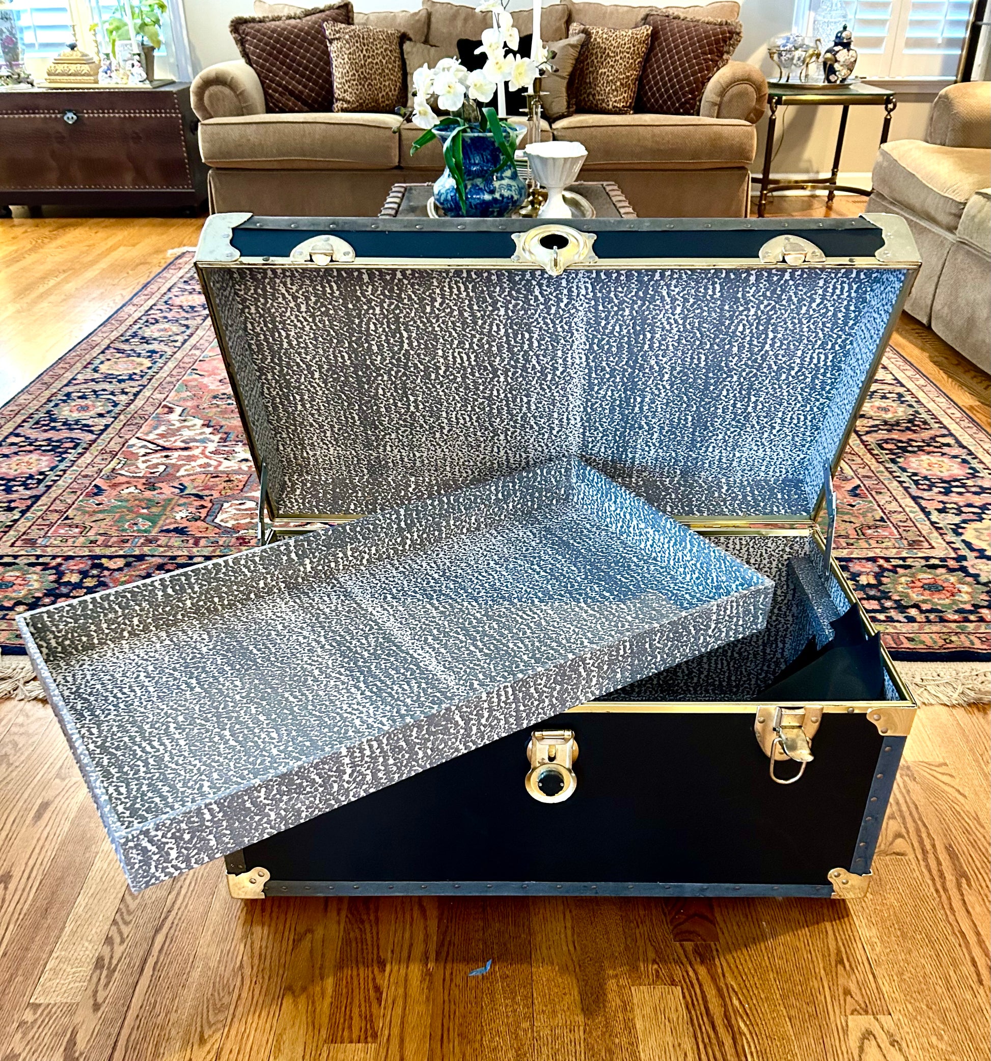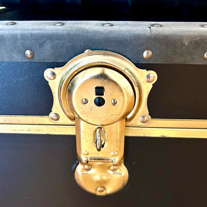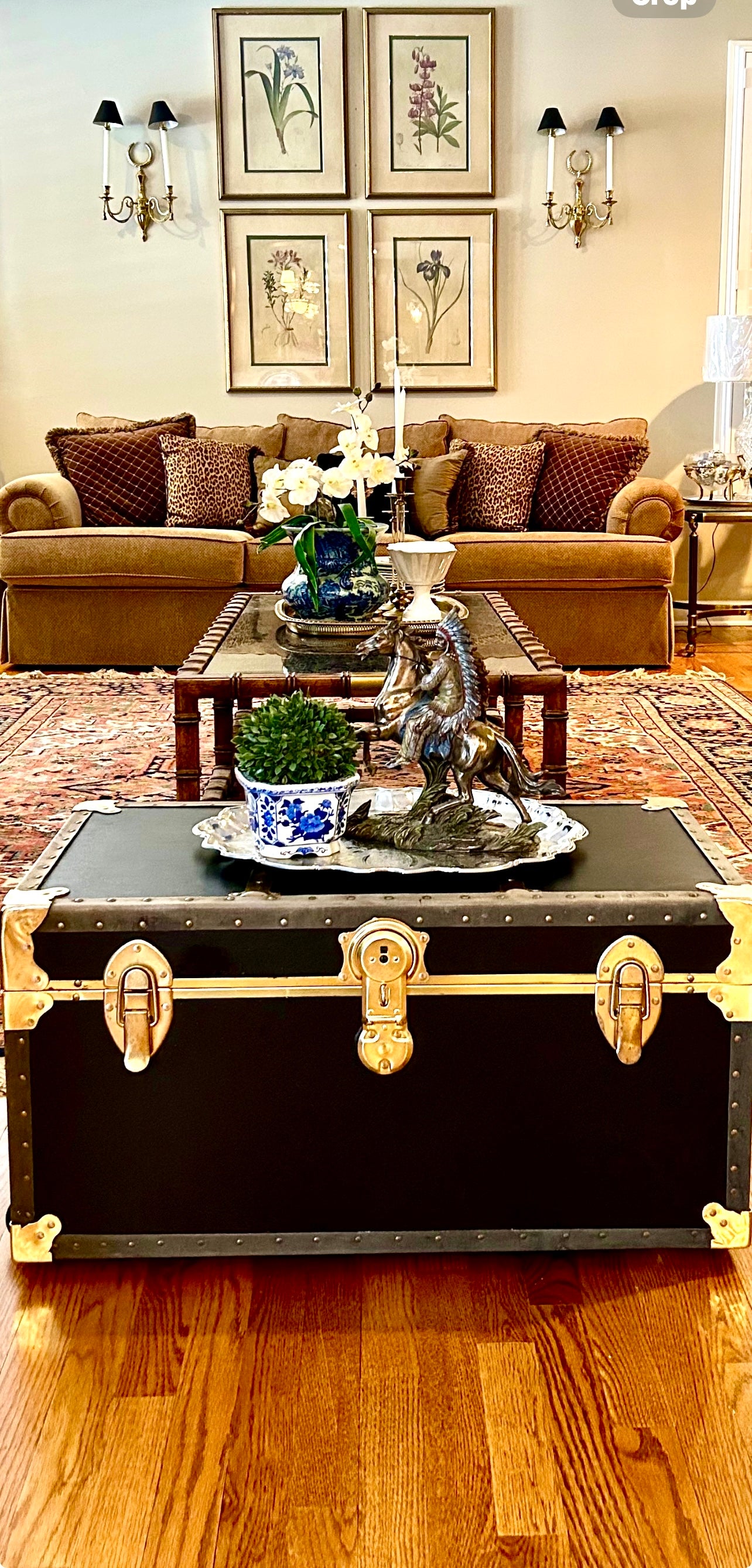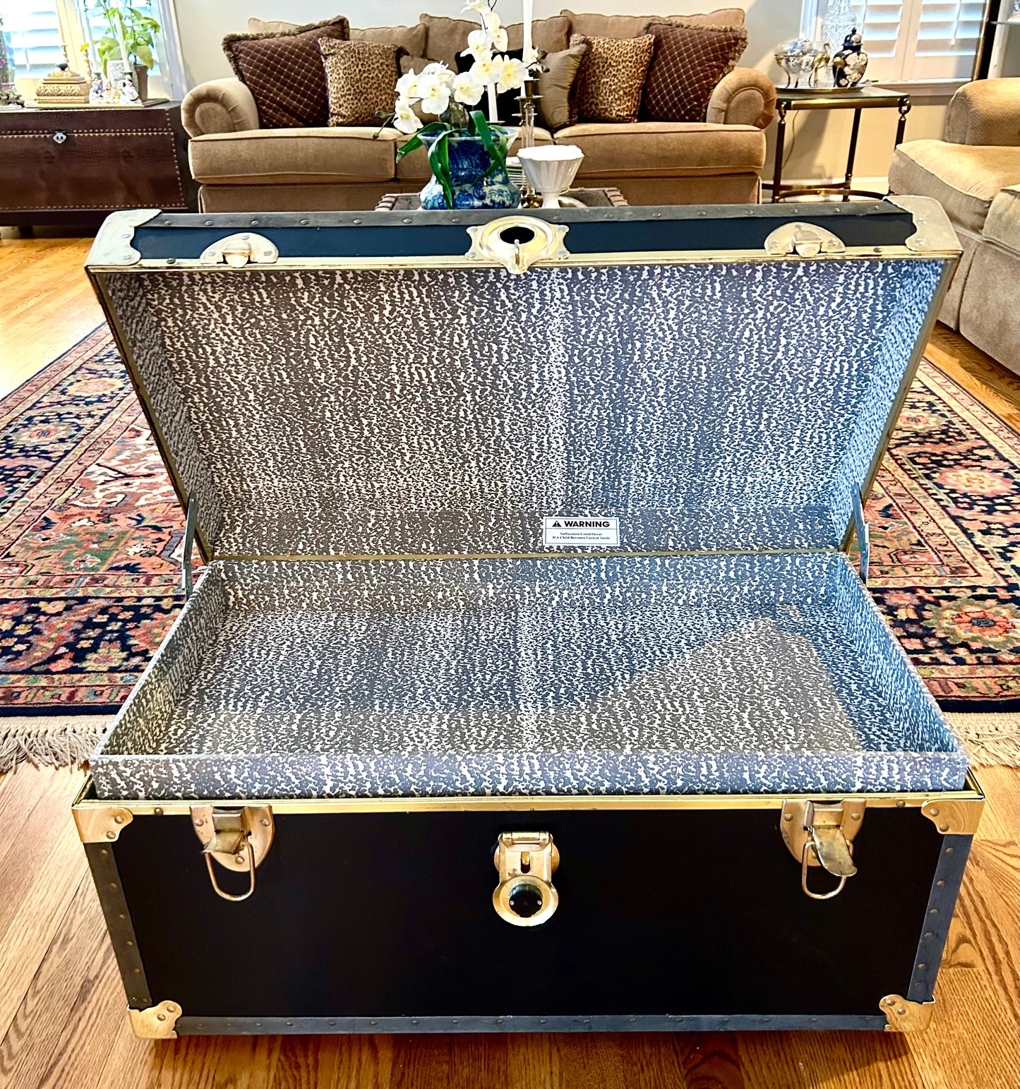 Handsome vintage ebony black, Brass & leather storage trunk w handles steamer trunk coffee table .