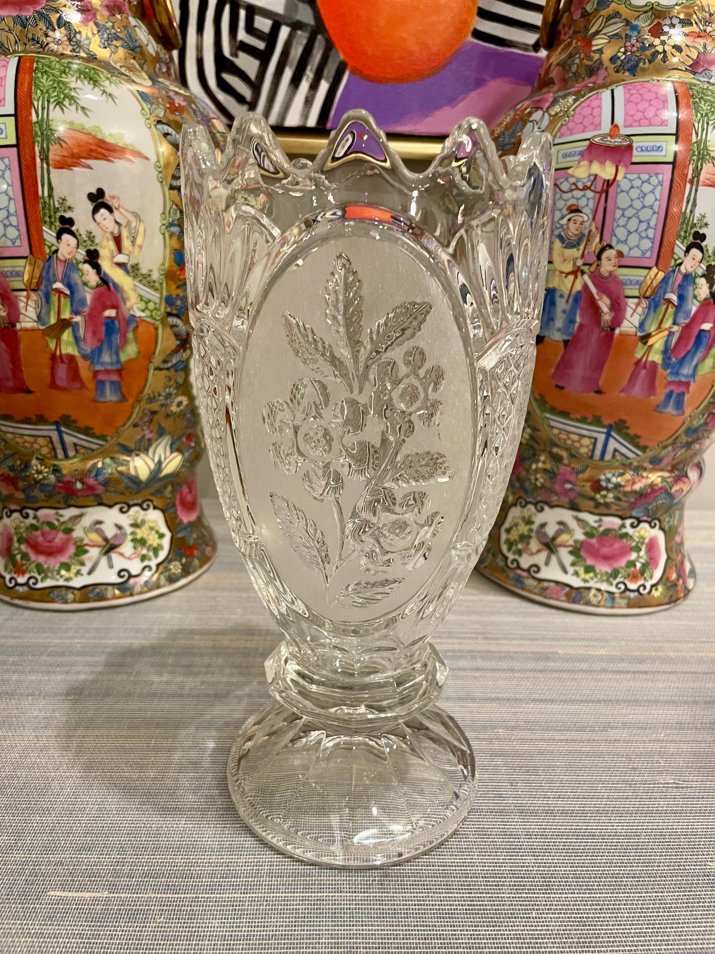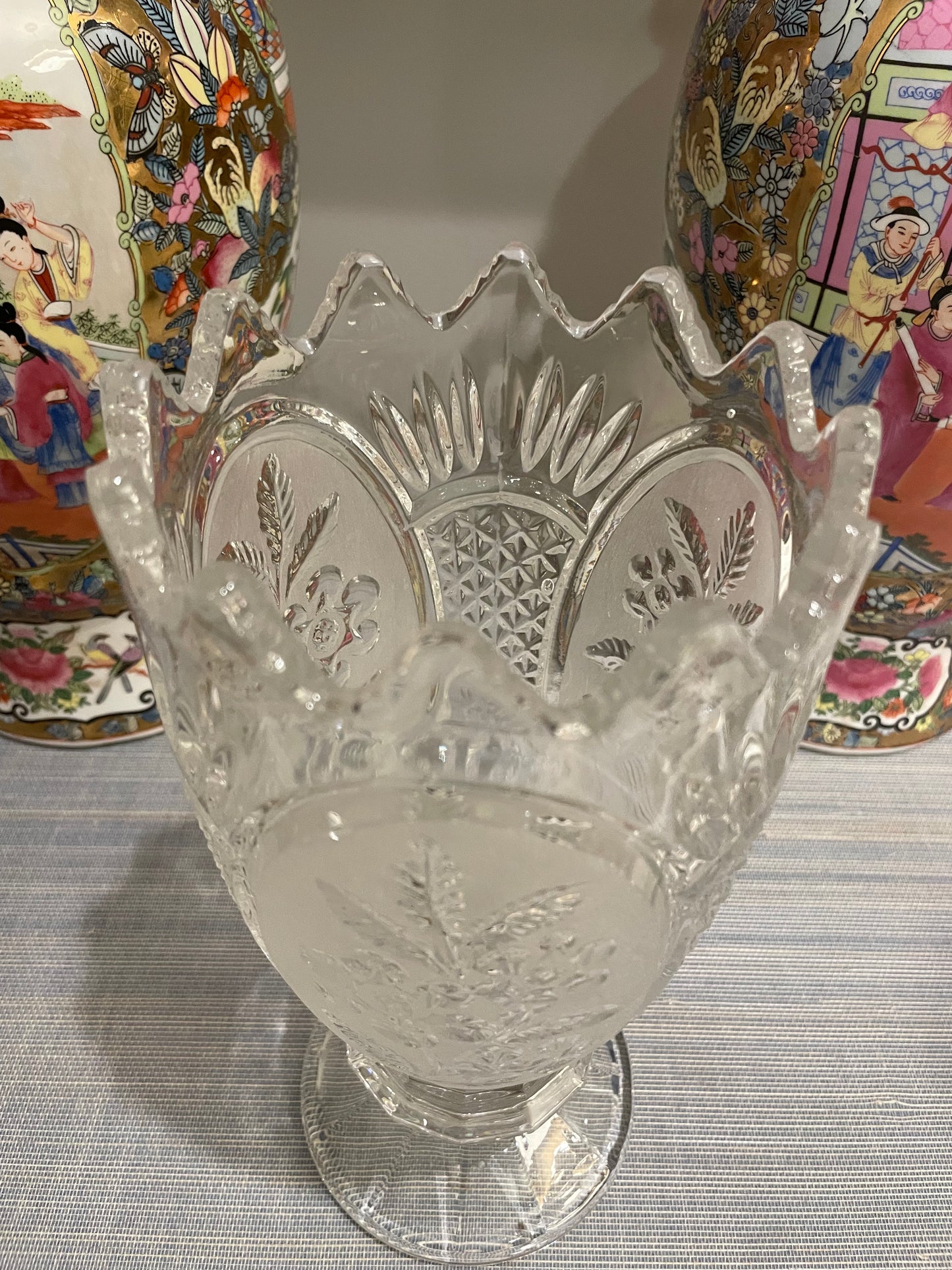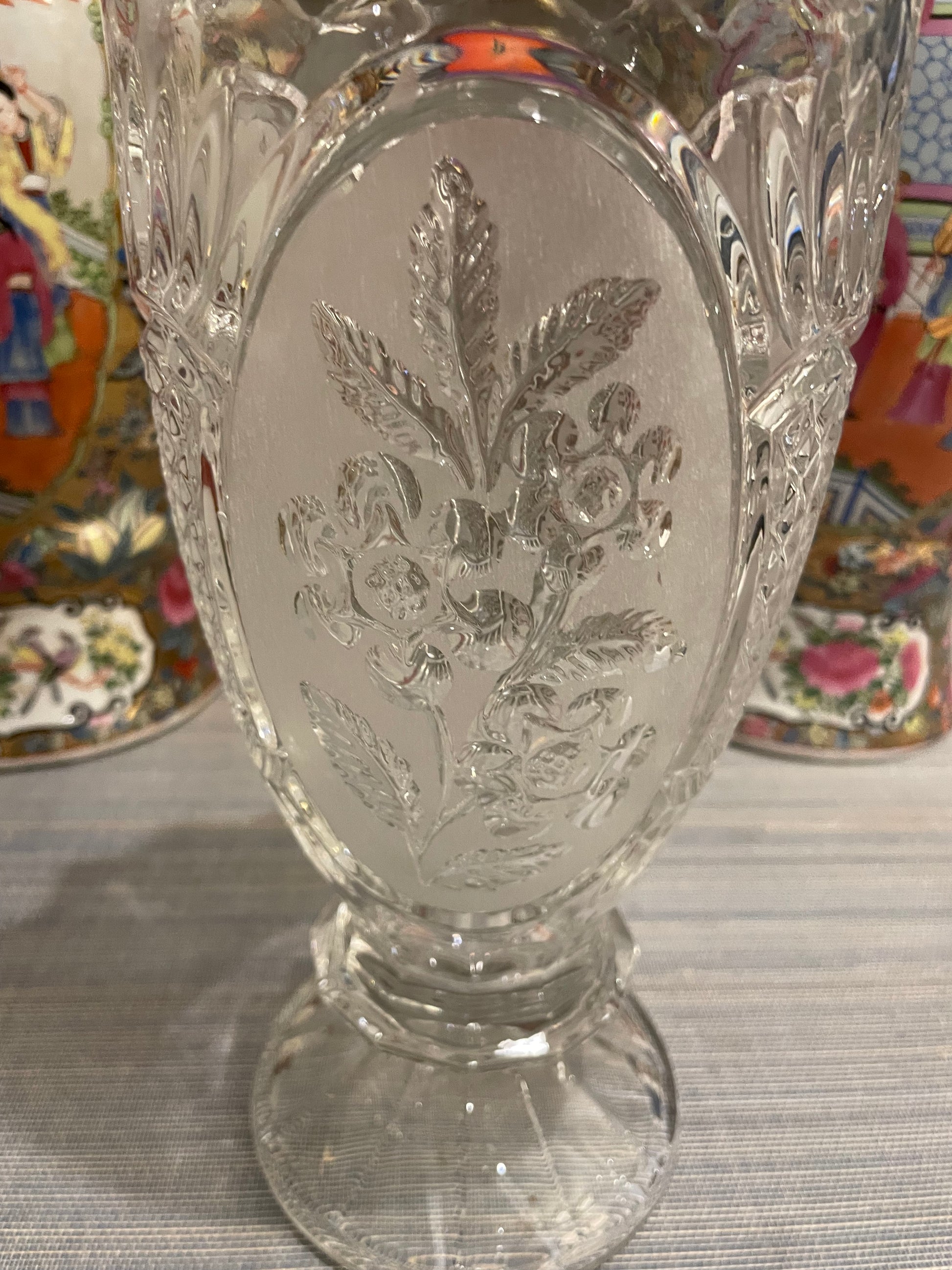 Vintage 10” Etched Floral Lead Crystal Footed Vase
